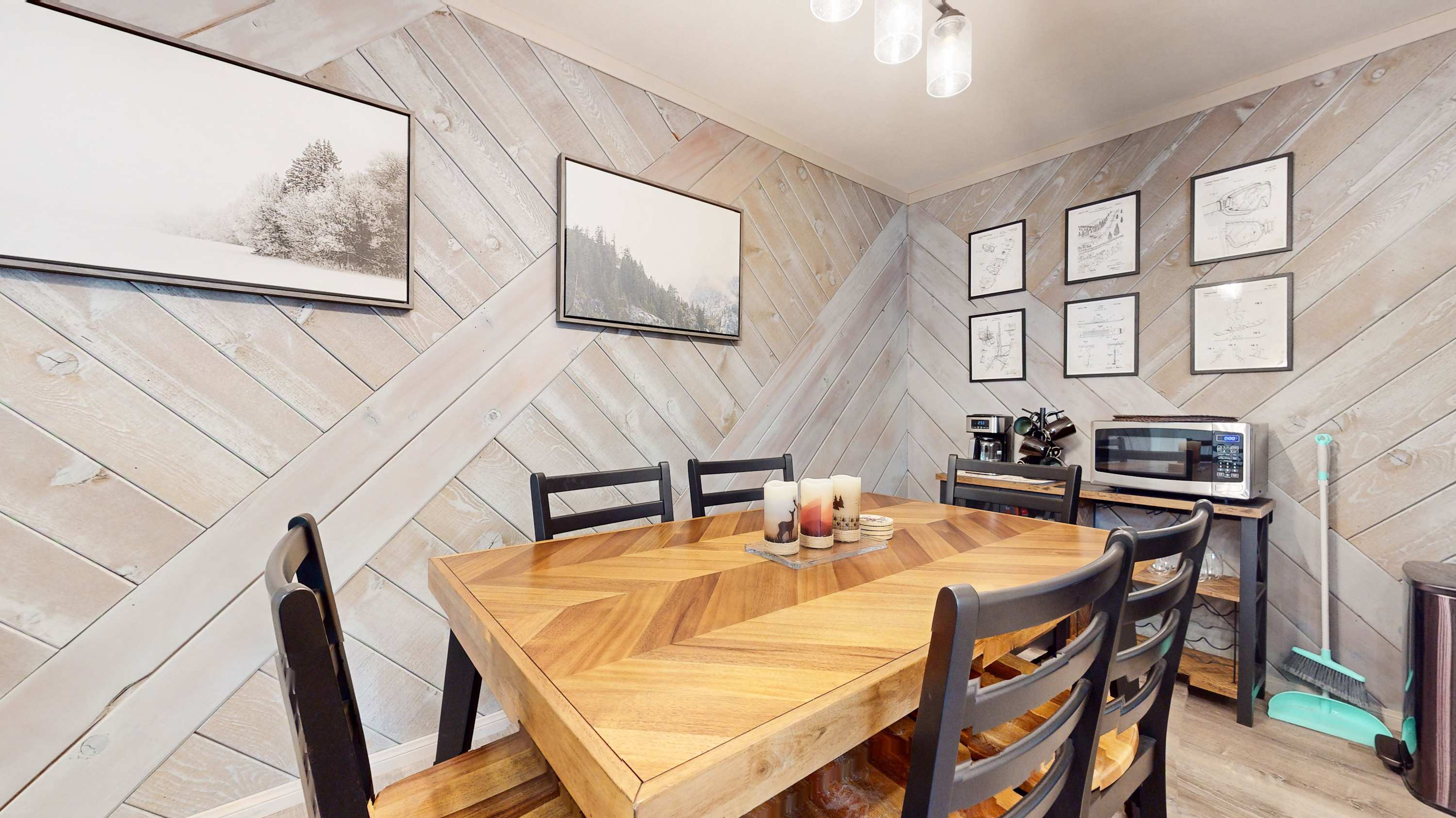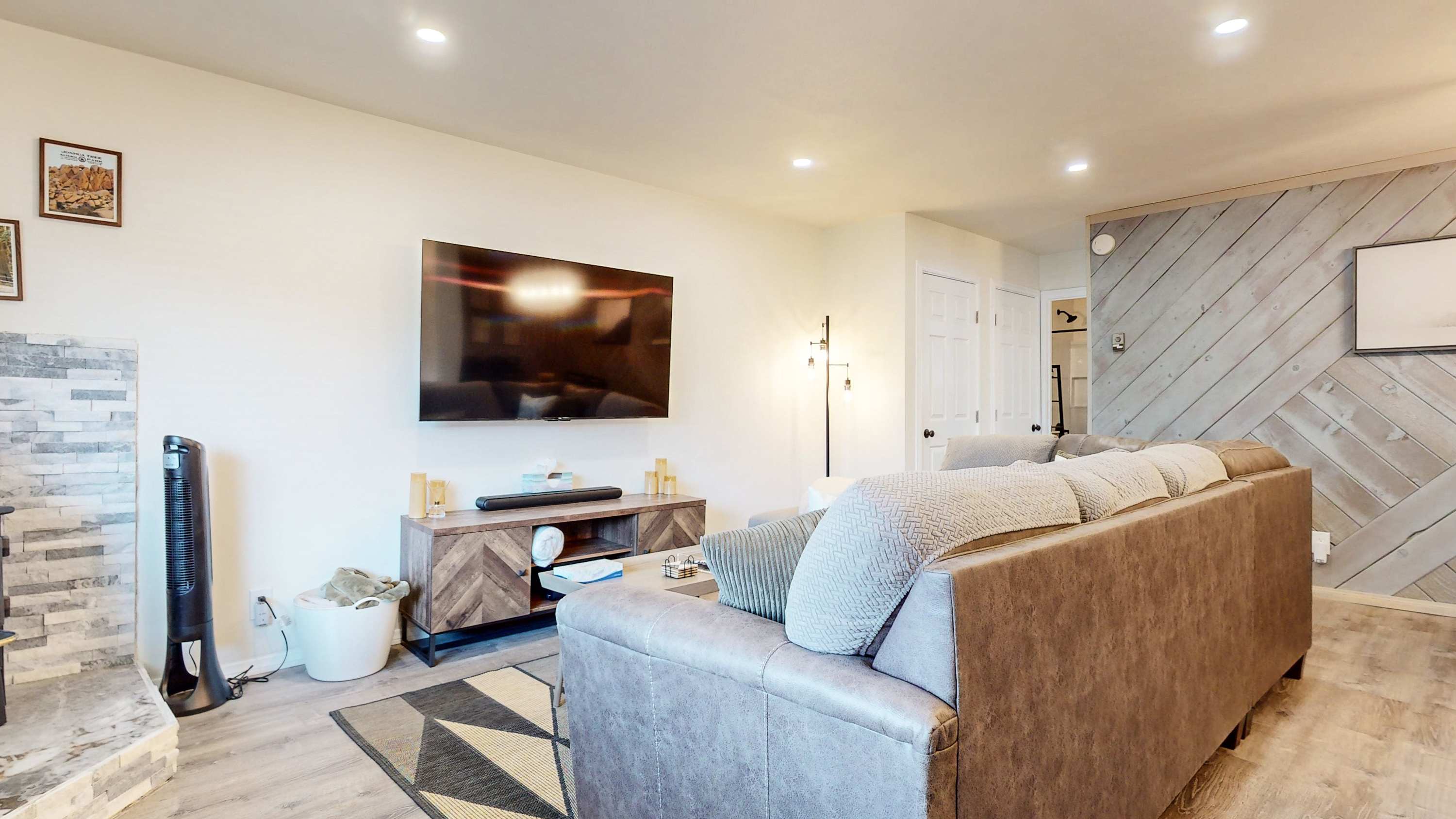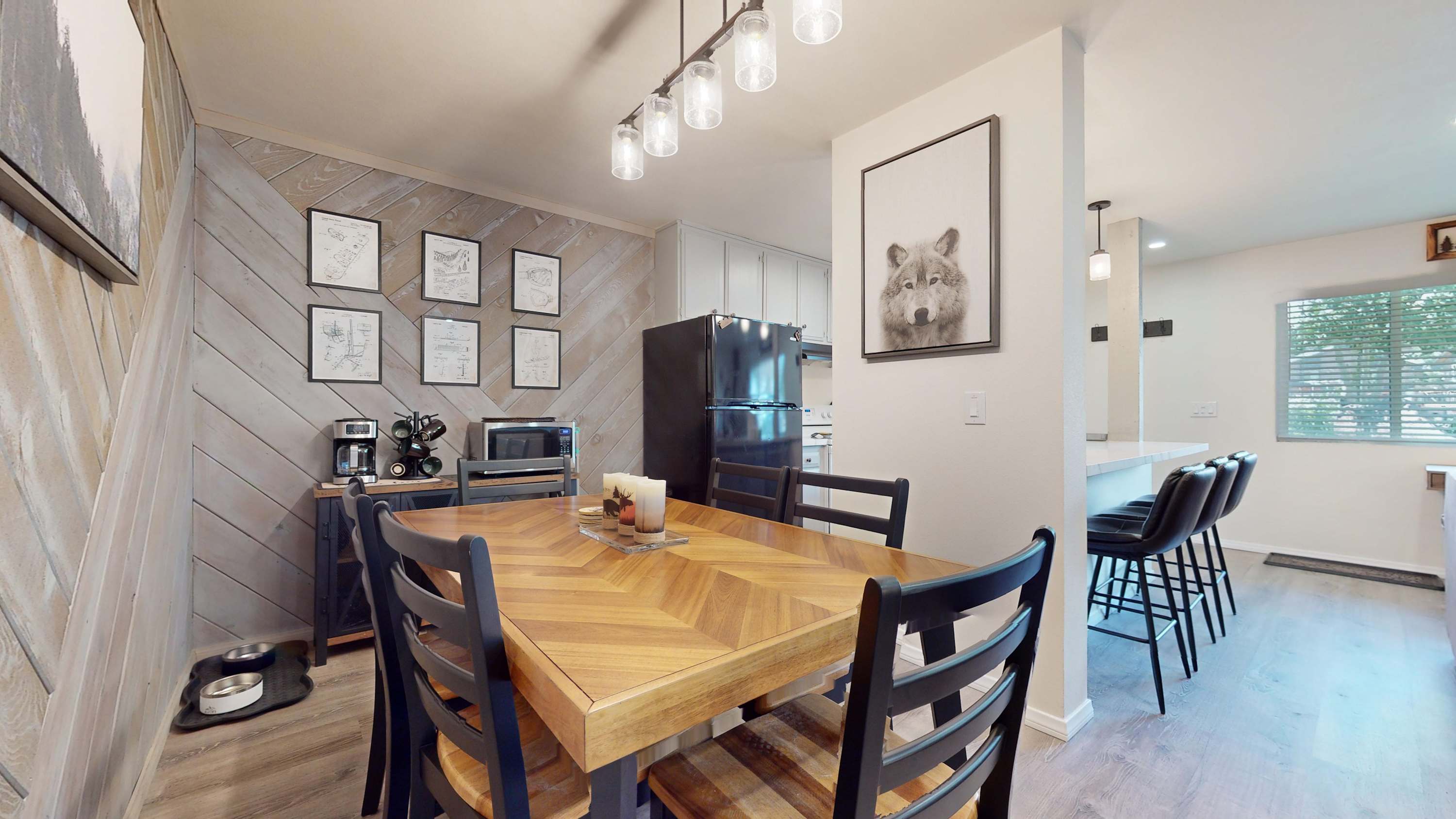 The home’s charming interior is a welcome sight at the end of busy days out and about, a desirable blend of modern-meets-rustic design elements and contemporary furnishings to maximize rest and rejuvenation. Gather together on the cushy L-shaped sofa to binge episodes of all your favorite shows on the mounted smart TV, a wood-burning fireplace providing warmth and ambiance in the colder months. If needed, a dedicated workspace offers a private space for keeping up with emails or taking important phone calls. The open floorplan flows you organically into the kitchen, fully equipped for all your culinary needs and showcasing newly painted cabinets, new utensils, and glossy stone countertops. Seat everyone together at the table for dining or a family game night, while high-top stools at the counter keep things light and casual for snack time or happy hour.