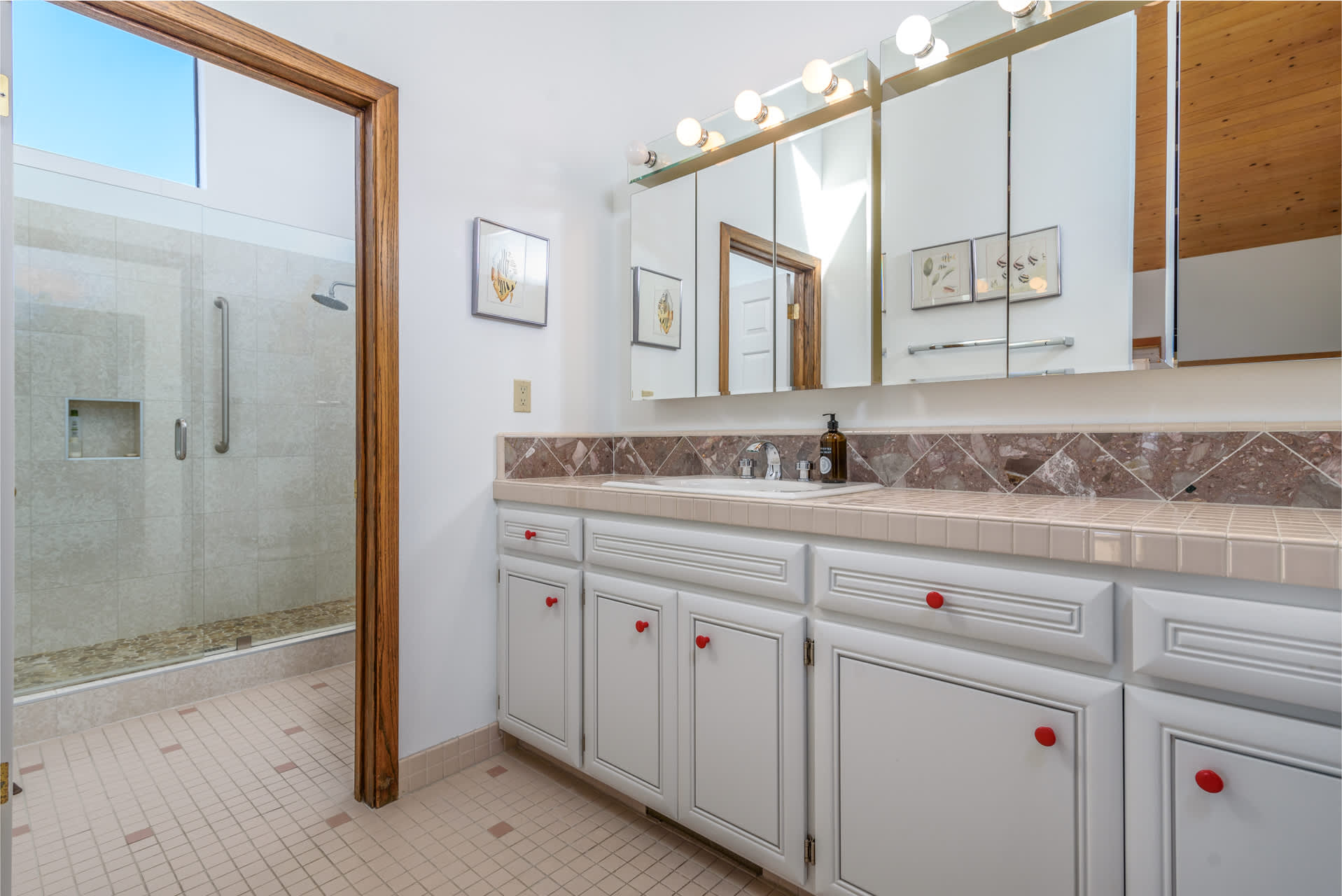• Bathroom 1 (ensuite to Bedroom 1): Walk-in glass shower, oversized single vanity