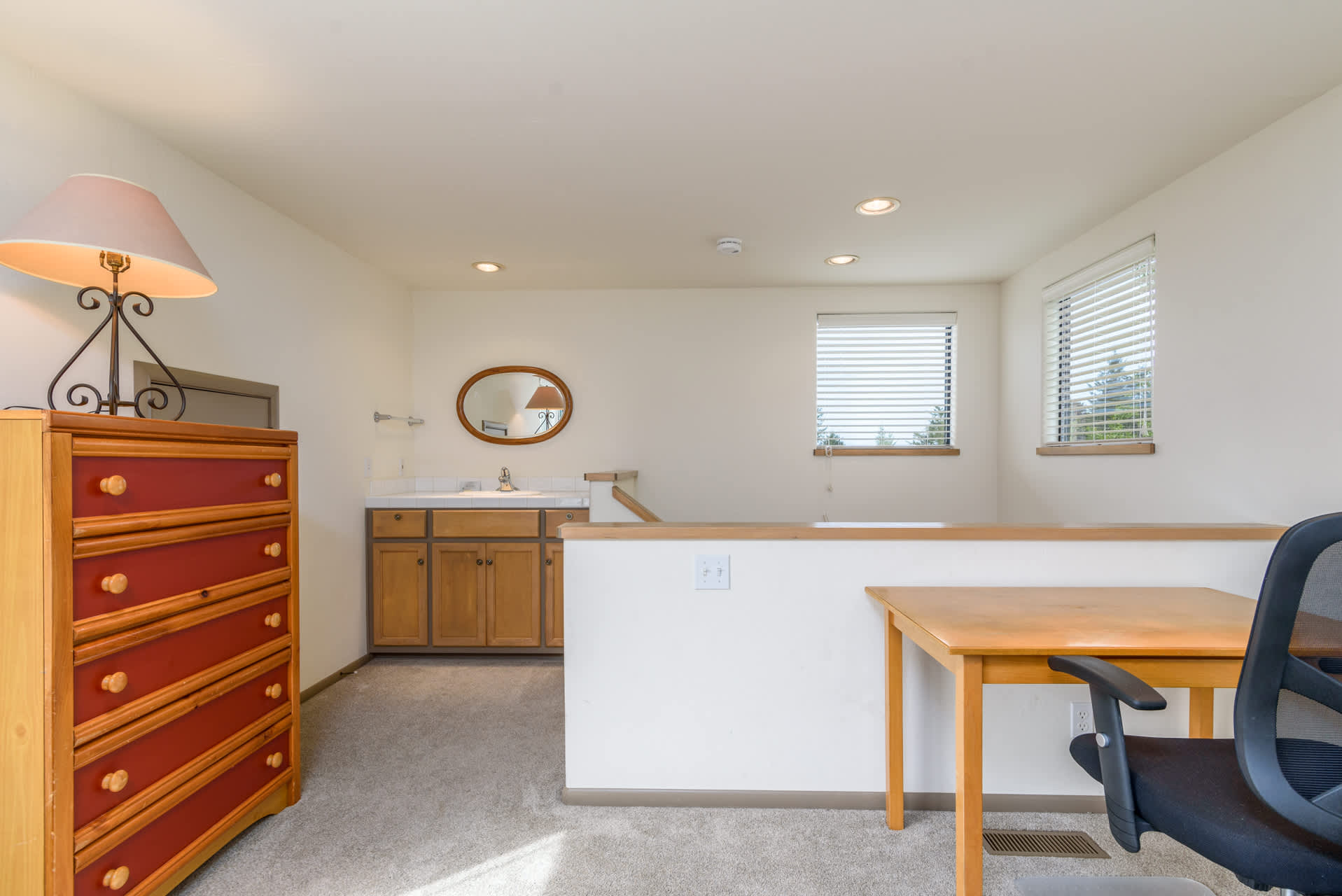 • Loft: Two twin beds, a sink, and a dedicated workspace (desk + chair)
