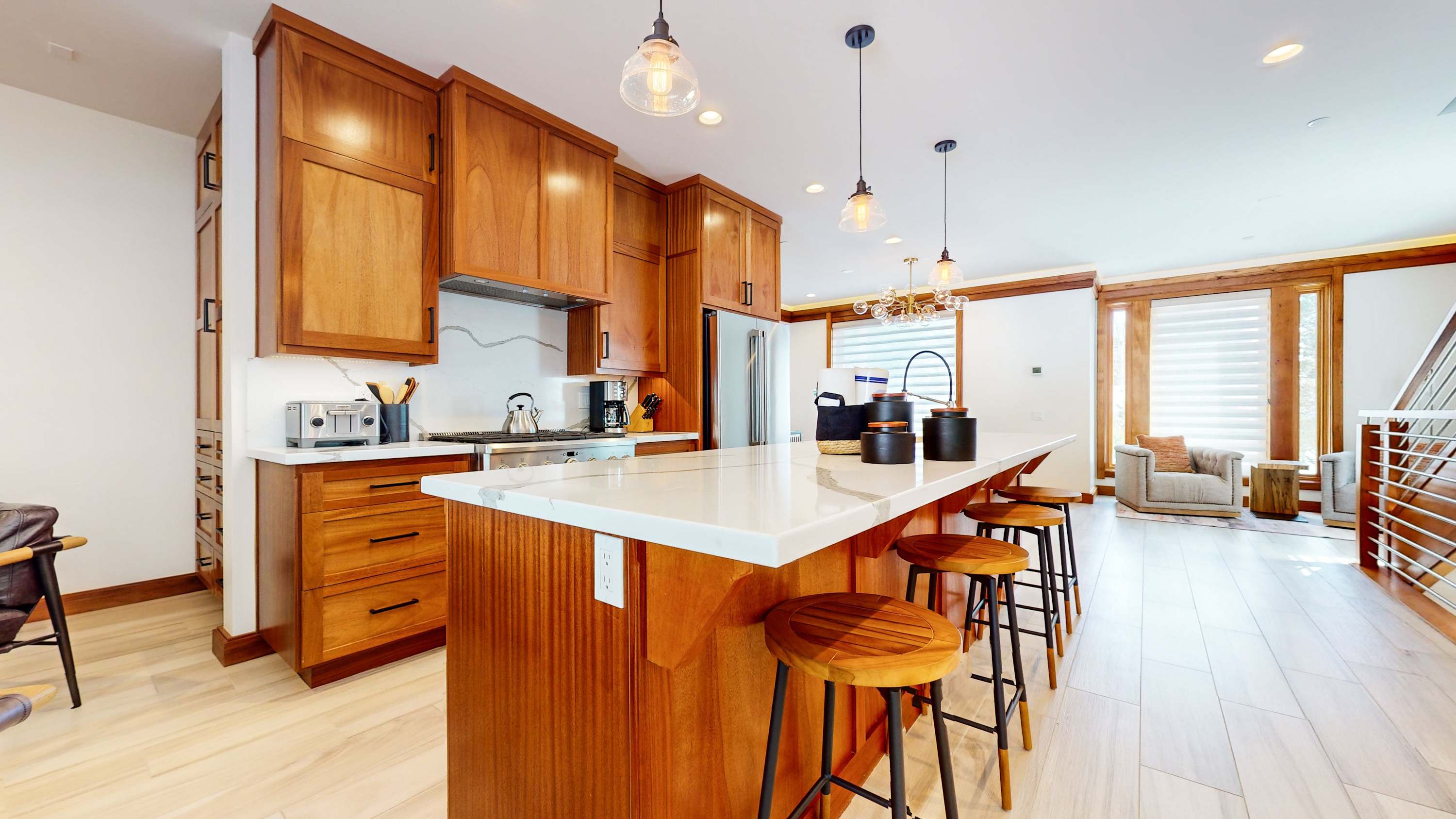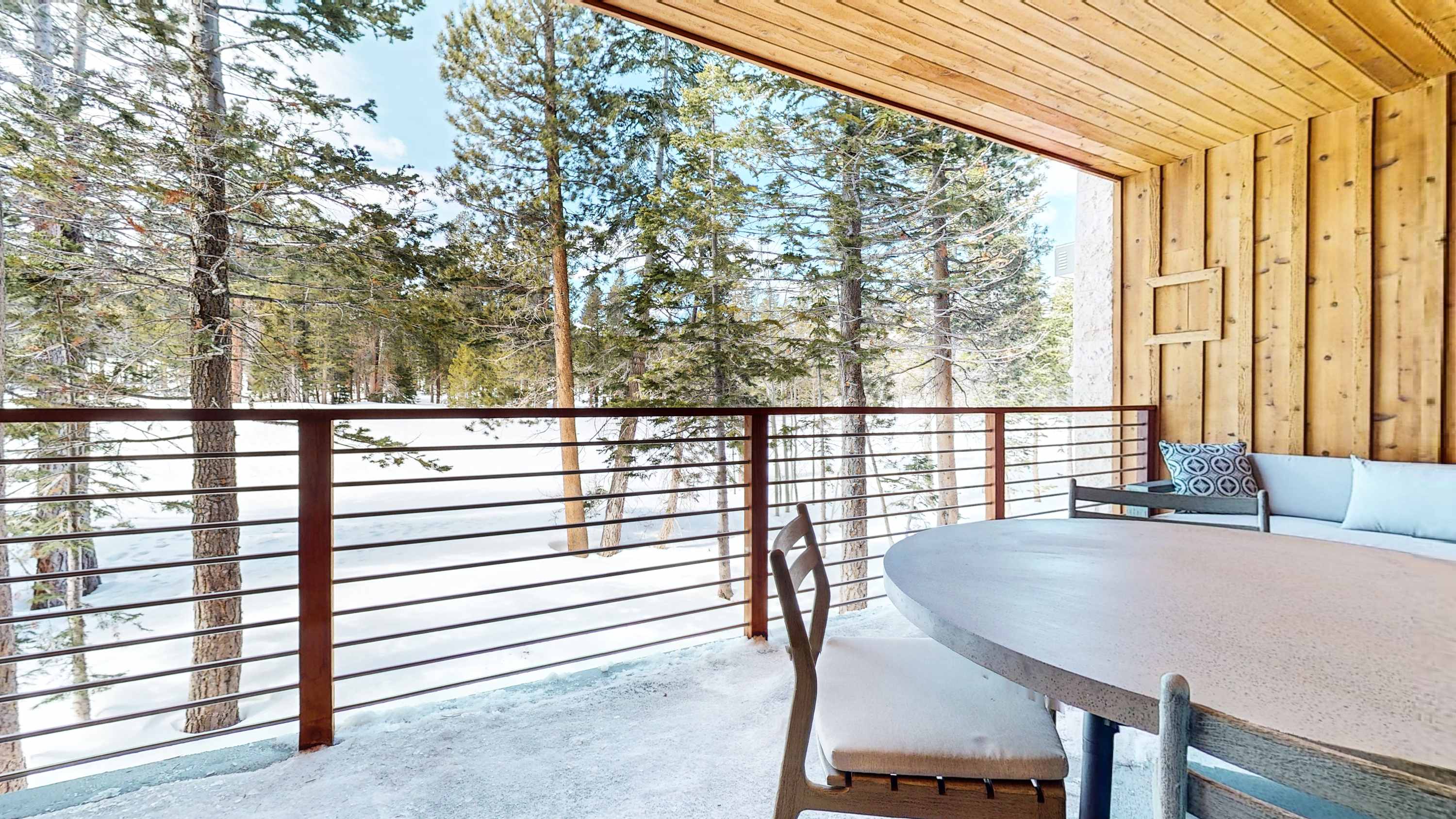 Step inside the home and into open, airy spaces, with bright natural light illuminating the contemporary furnishings and sophisticated décor. The cozy living room offers plush sofa and armchair seating for relaxed downtimes spent streaming episodes of all your favorite shows. The gas fireplace will keep you warm and toasty in the colder months, creating an ambiance for an immersive movie night. Steps away, the fully equipped kitchen showcases brand-new stainless steel appliances, glossy stone countertops, and ample rich cabinetry stocked with cookware and dining ware. Snag a high-top stool at the island to enjoy quick and casual bites or make your way to the chic dining room table to gather together for more formal meals. For more of that fresh mountain air, step out onto the balcony to grill up a delicious barbeque lunch or enjoy a meal al fresco as you gaze out at the forested surroundings.