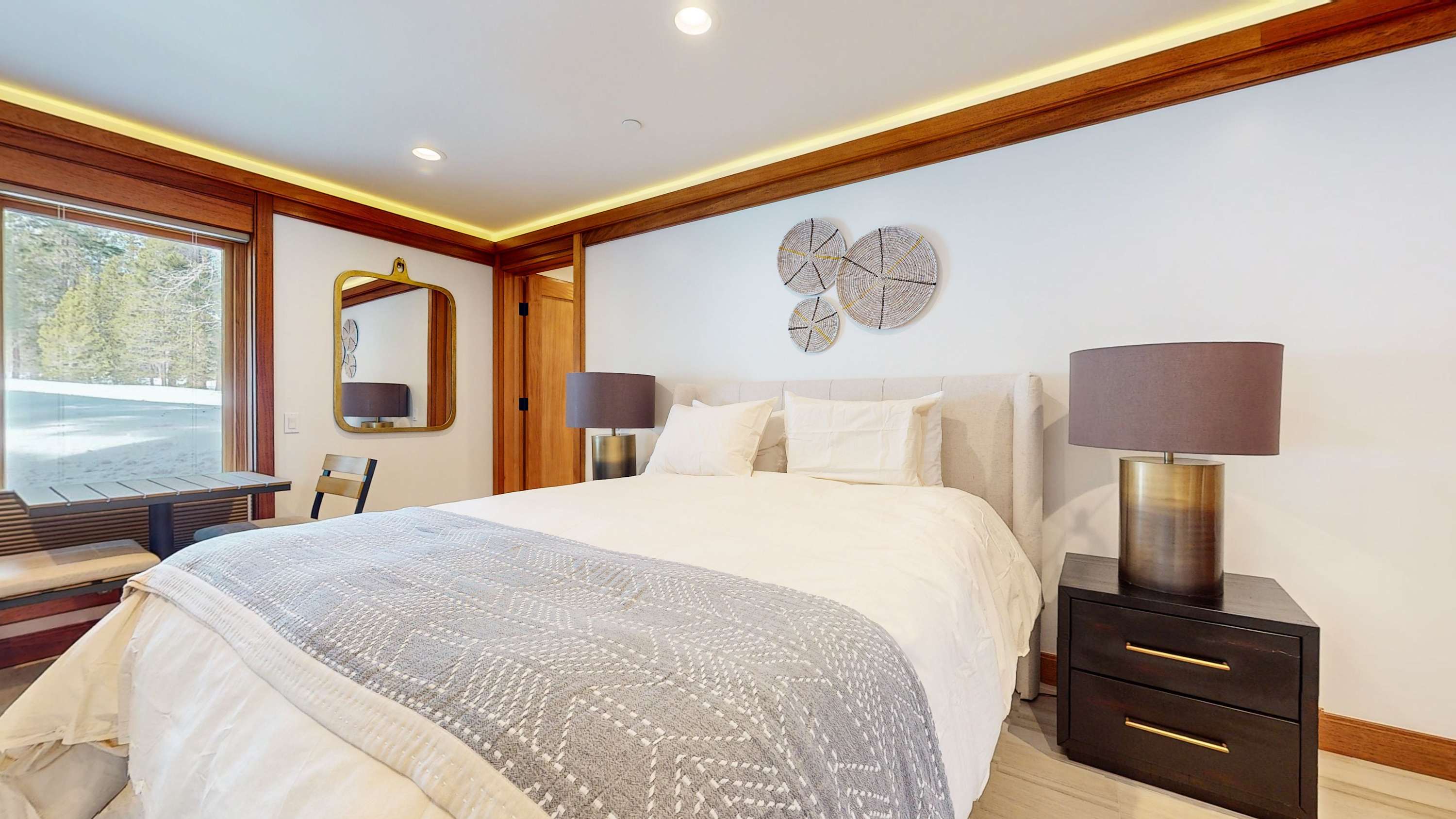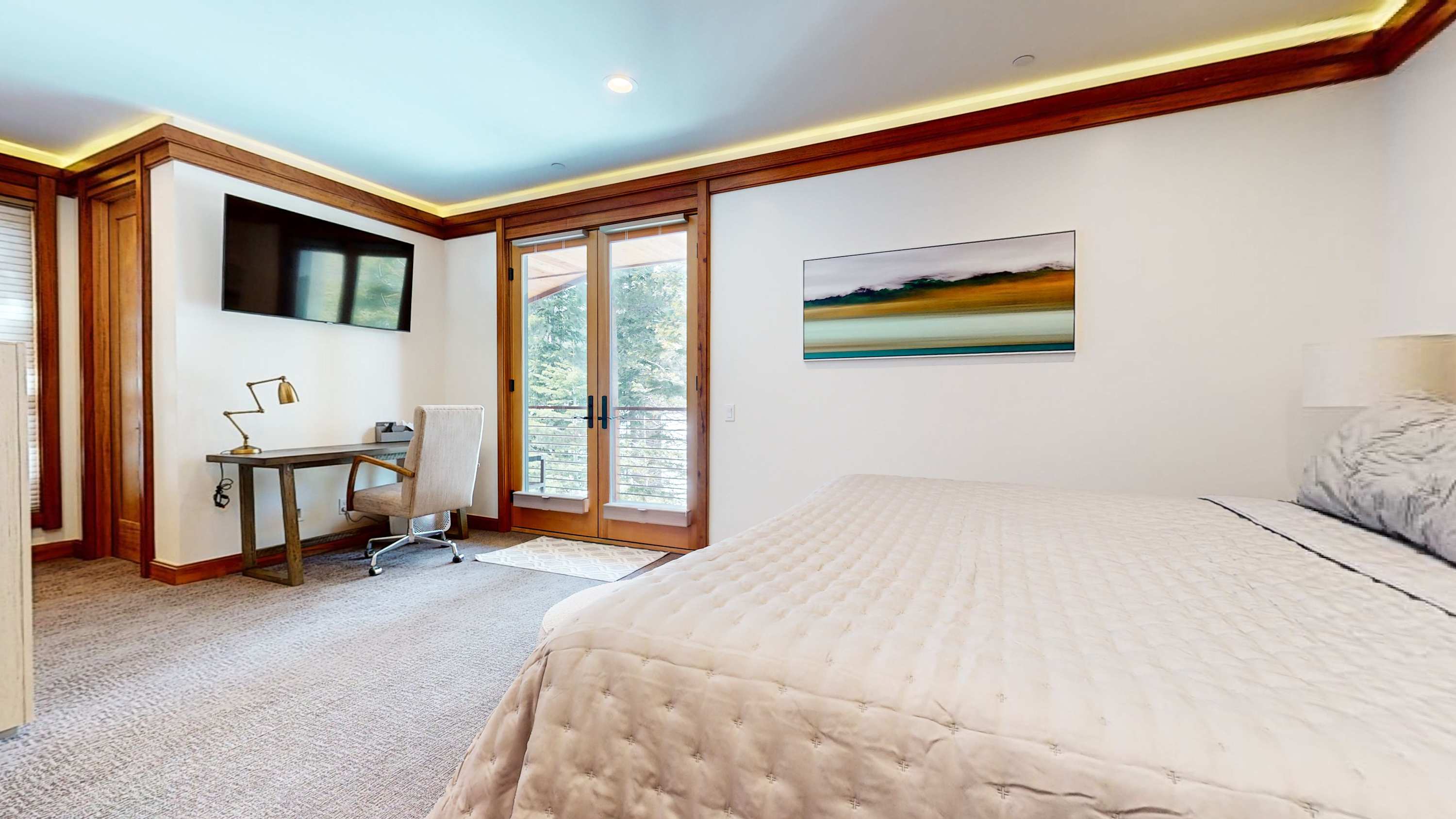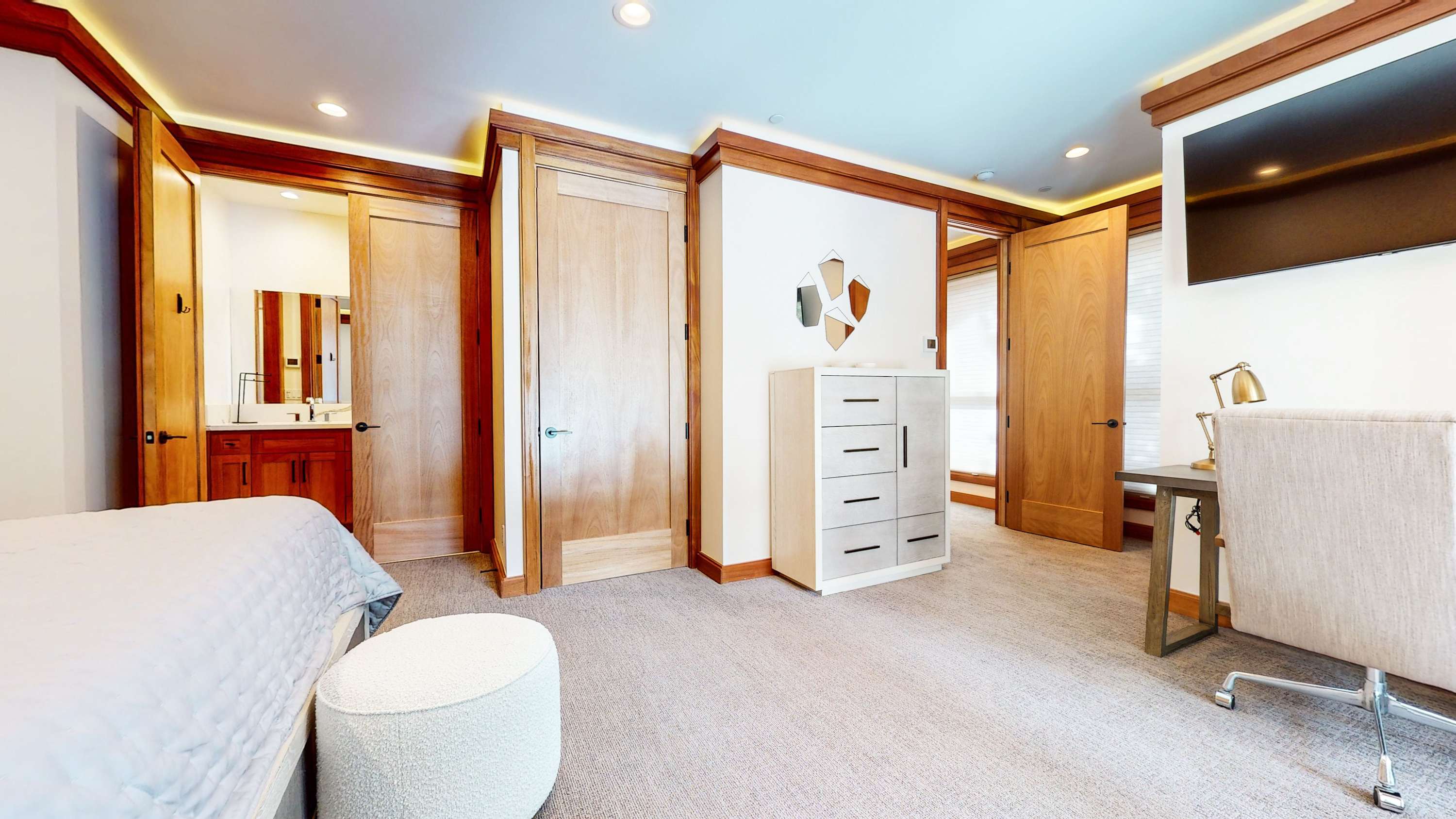 Bedroom #3 includes a queen size bed, smart TV, deck access, and ensuite bathroom with a dual vanity and walk-in shower.