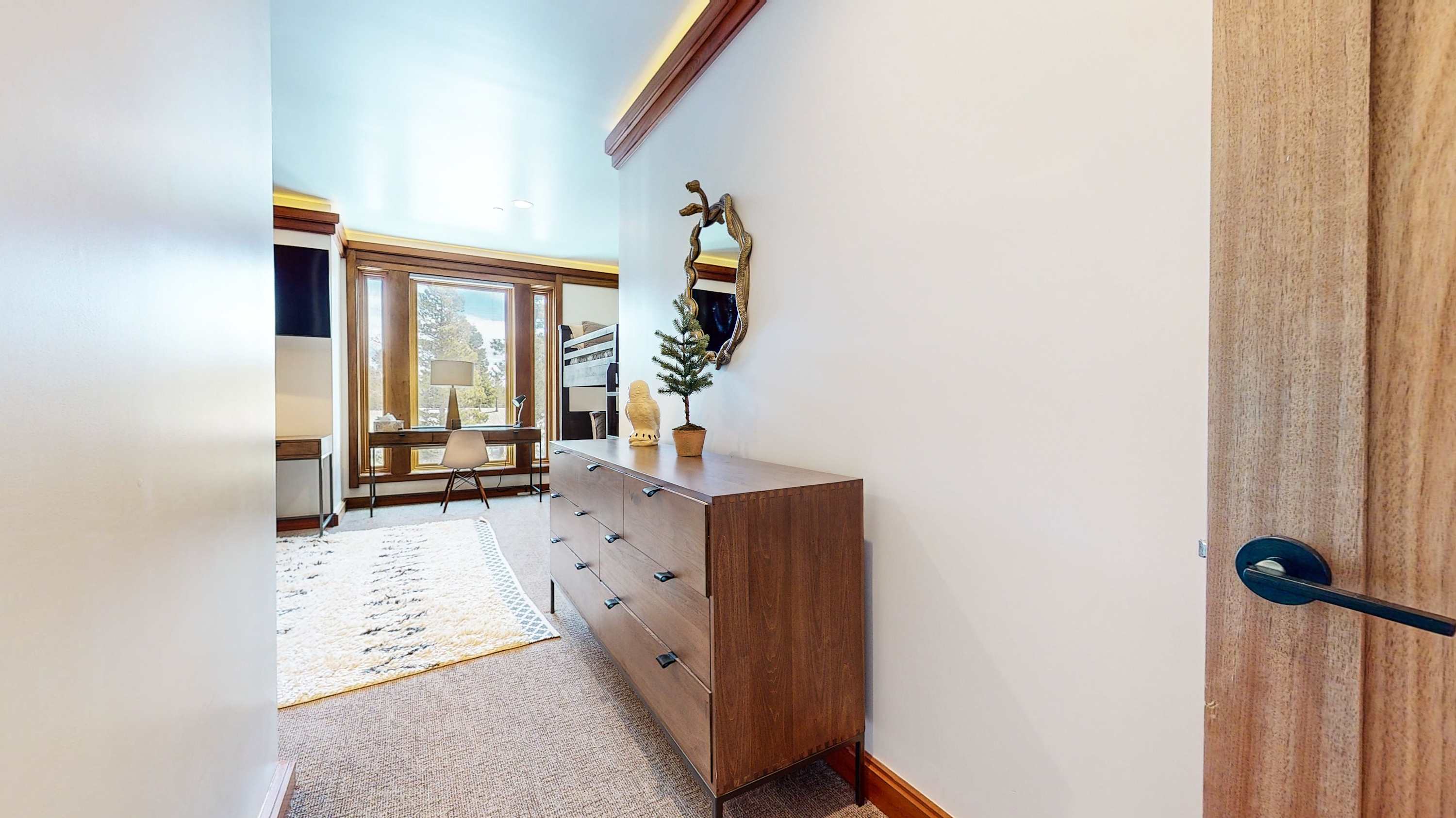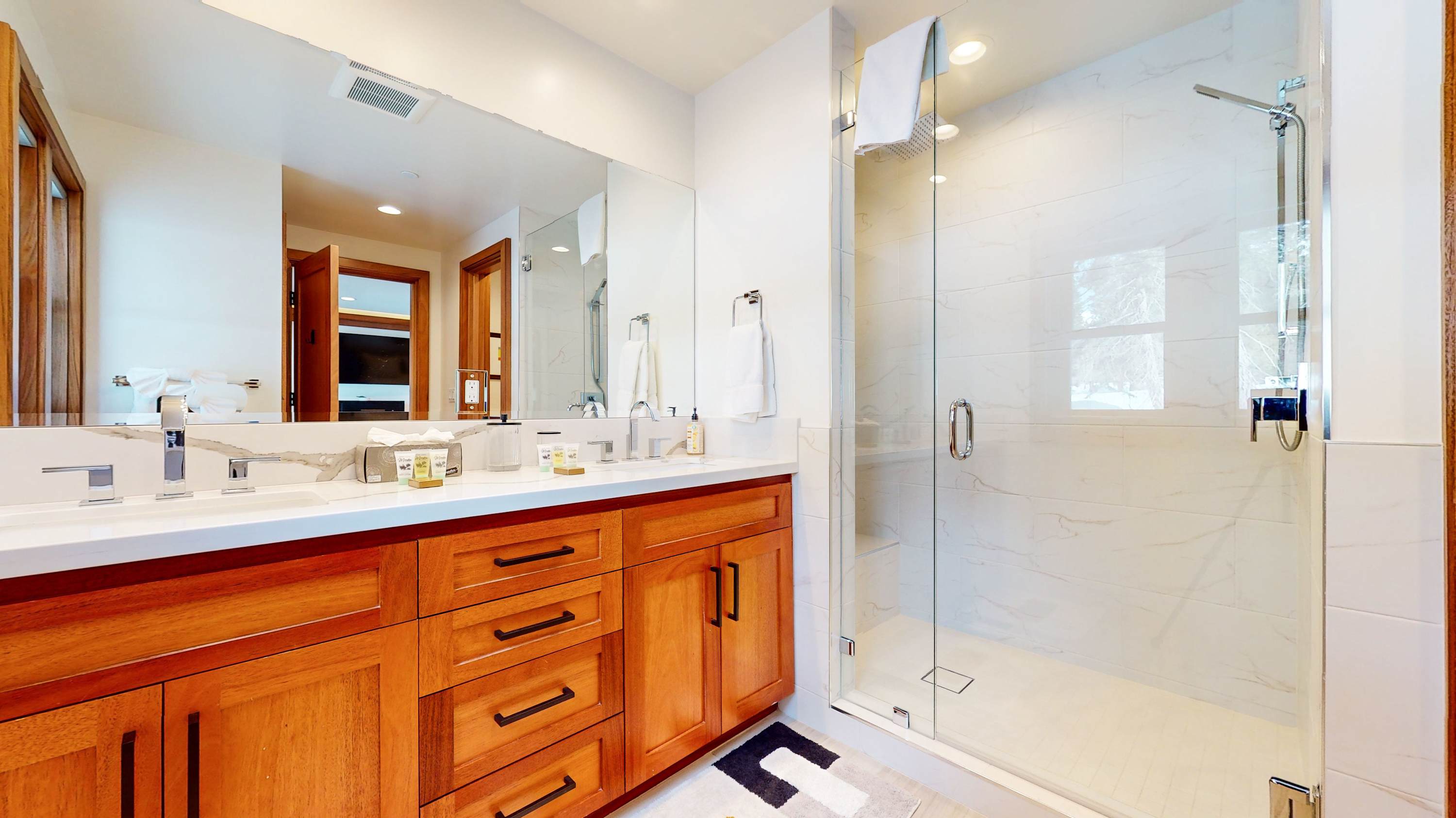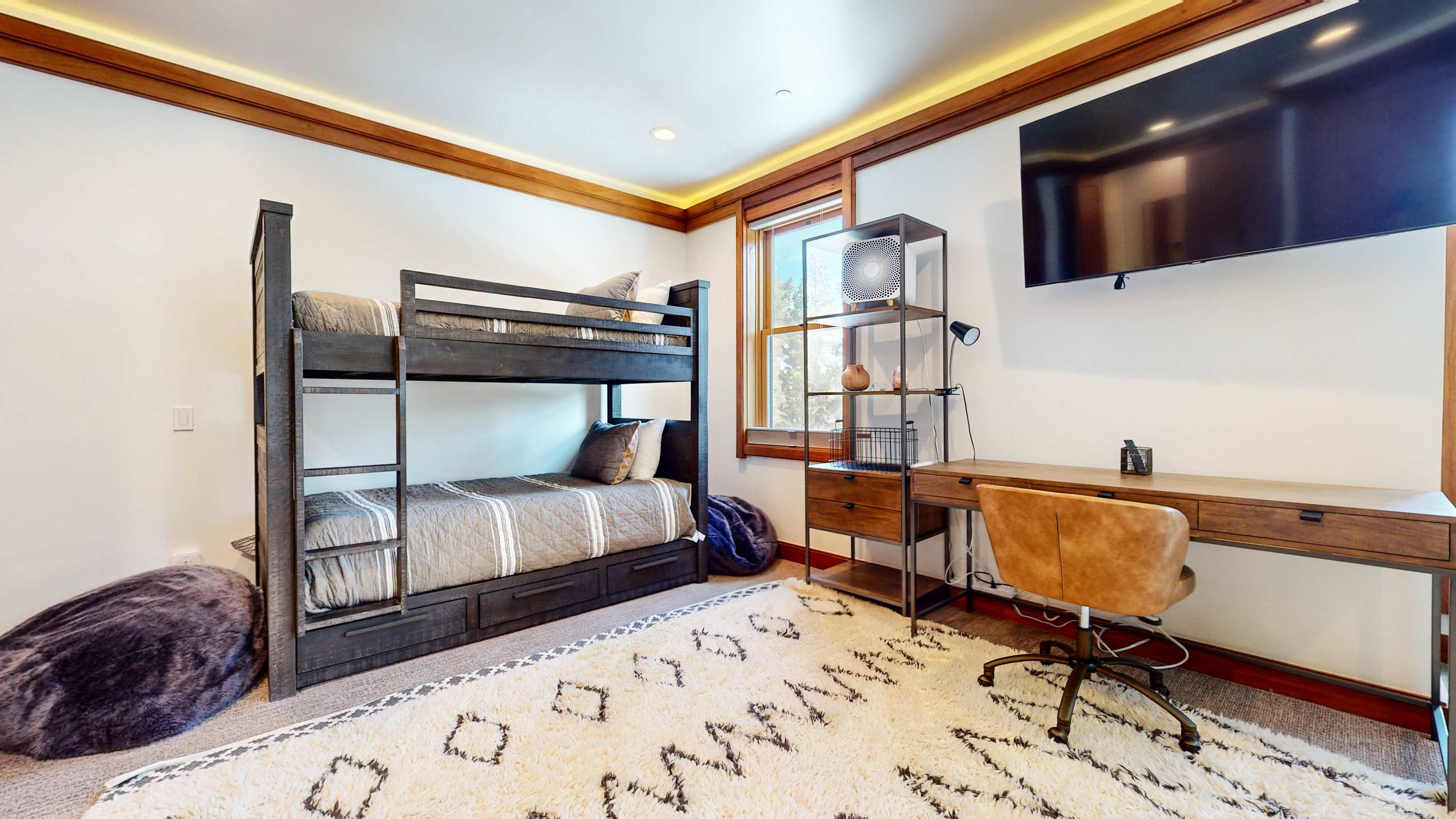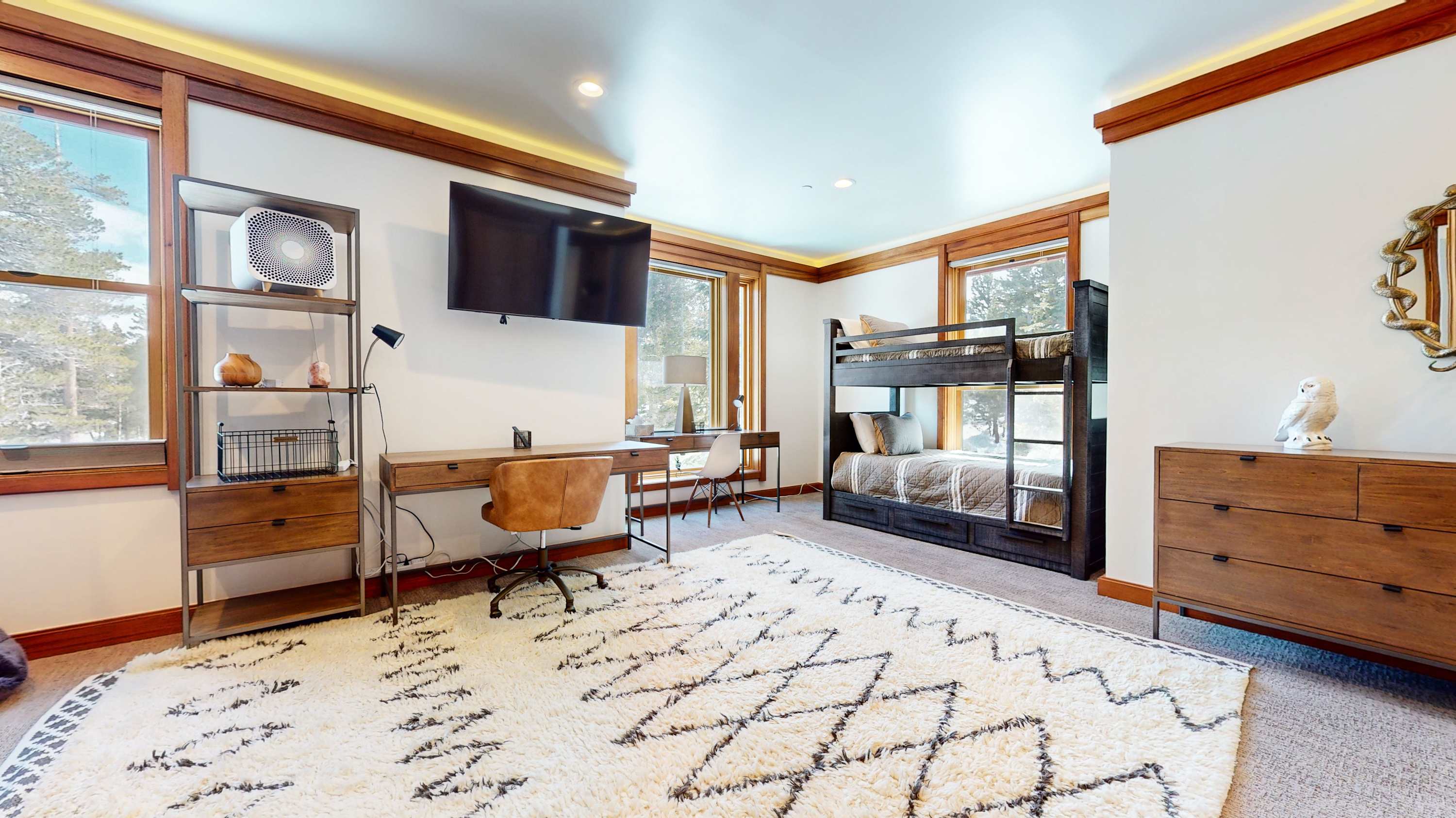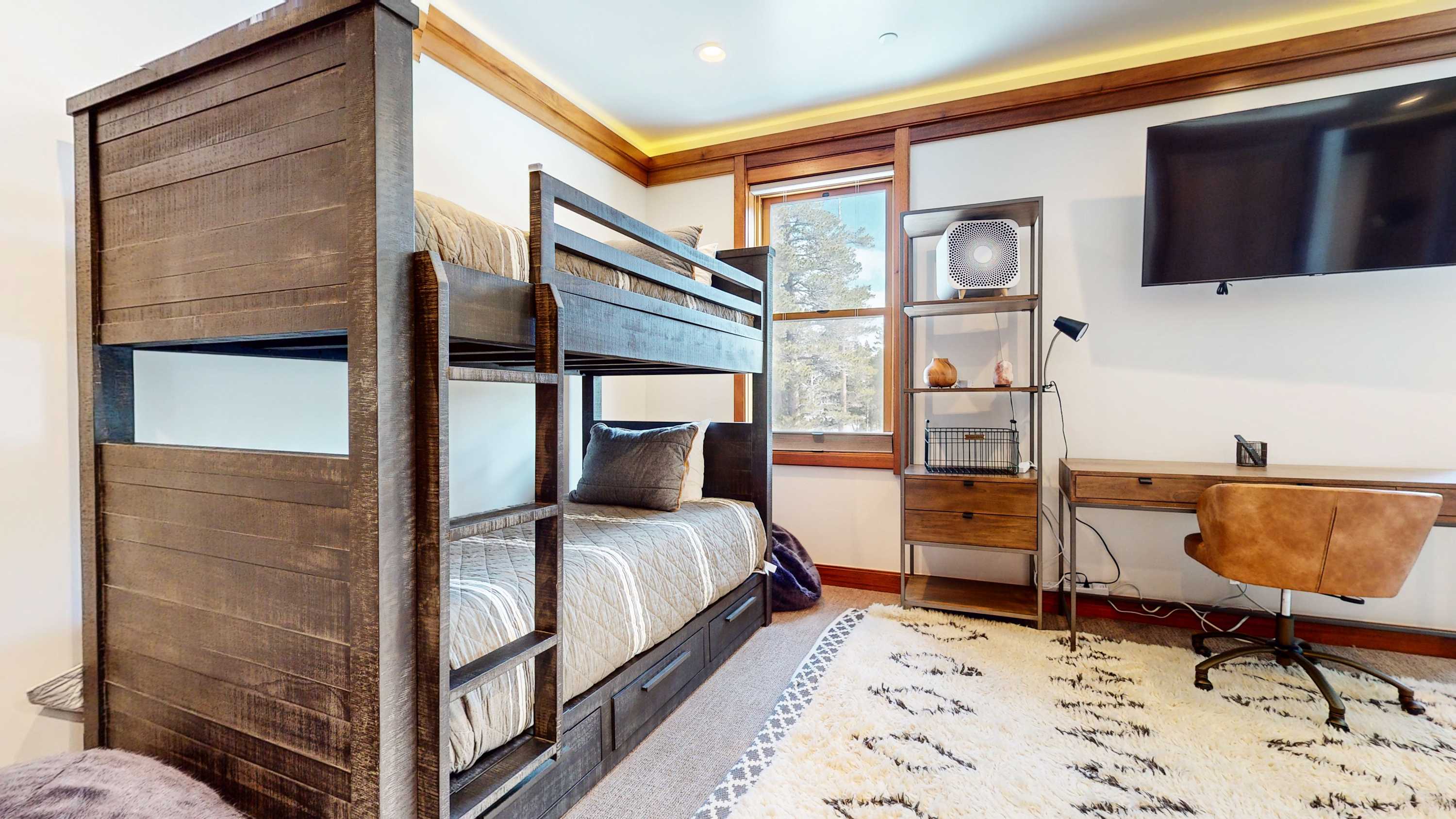 Bedroom #2 includes a twin-over-twin bunkbed, smart TV, and ensuite bathroom with a dual vanity and glass walk-in shower.