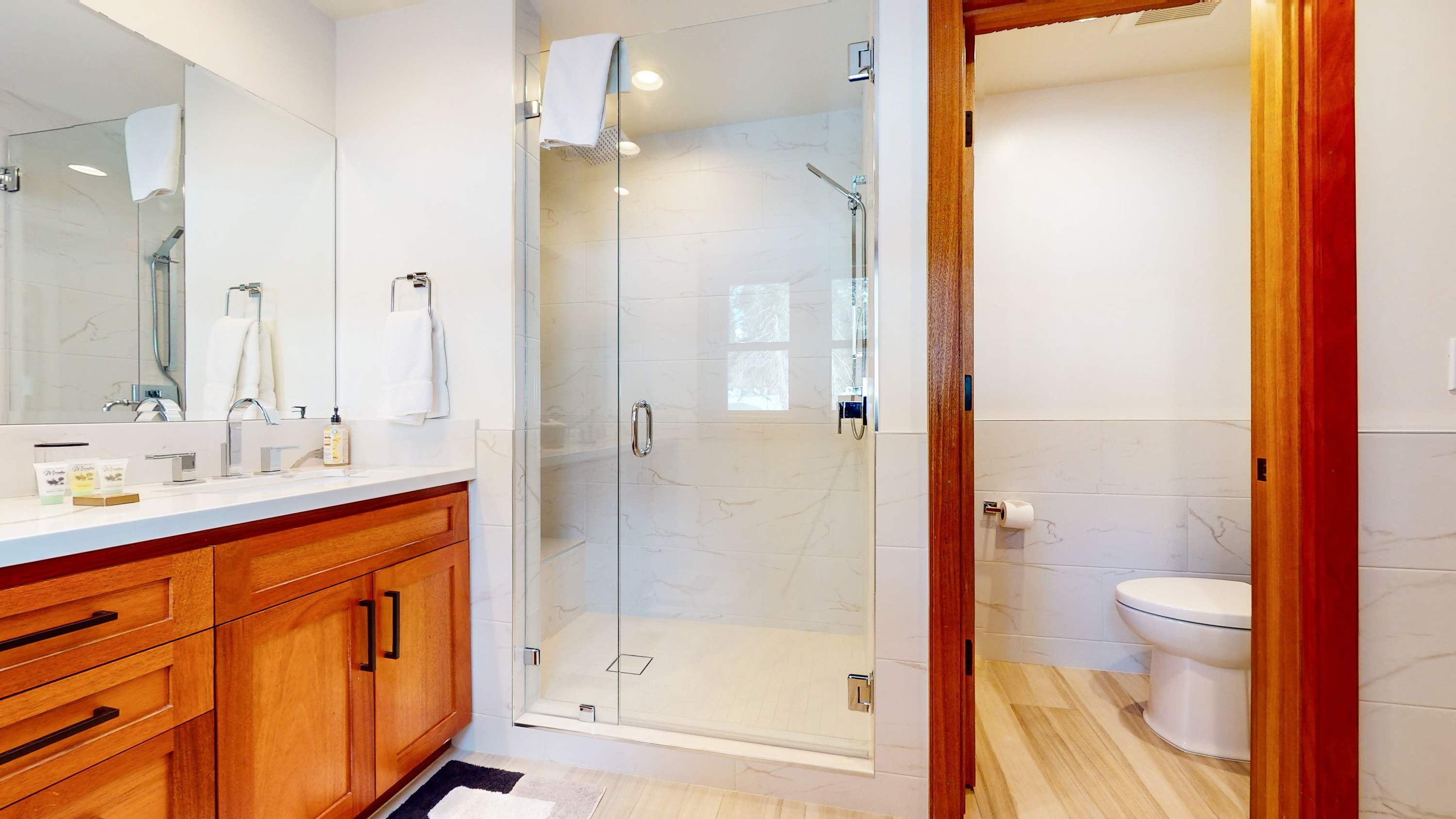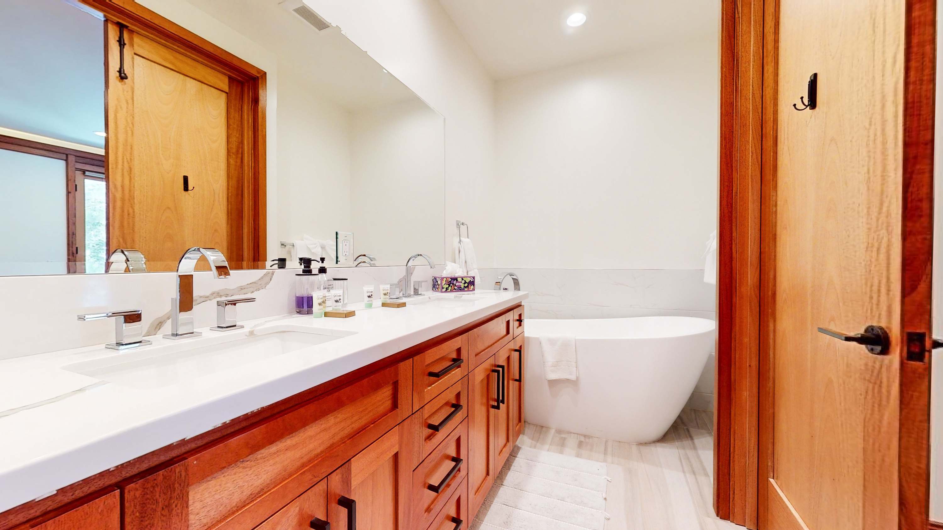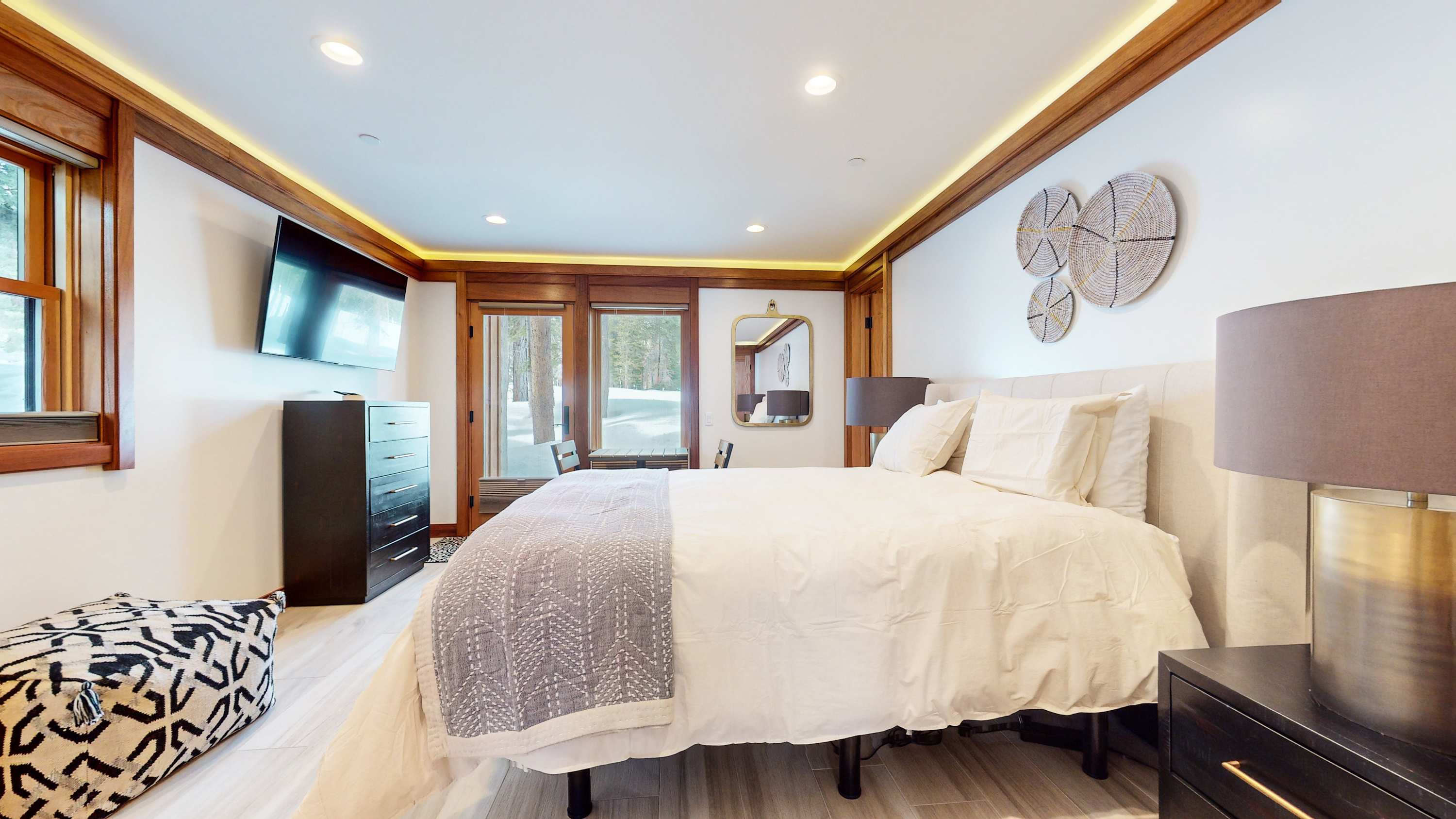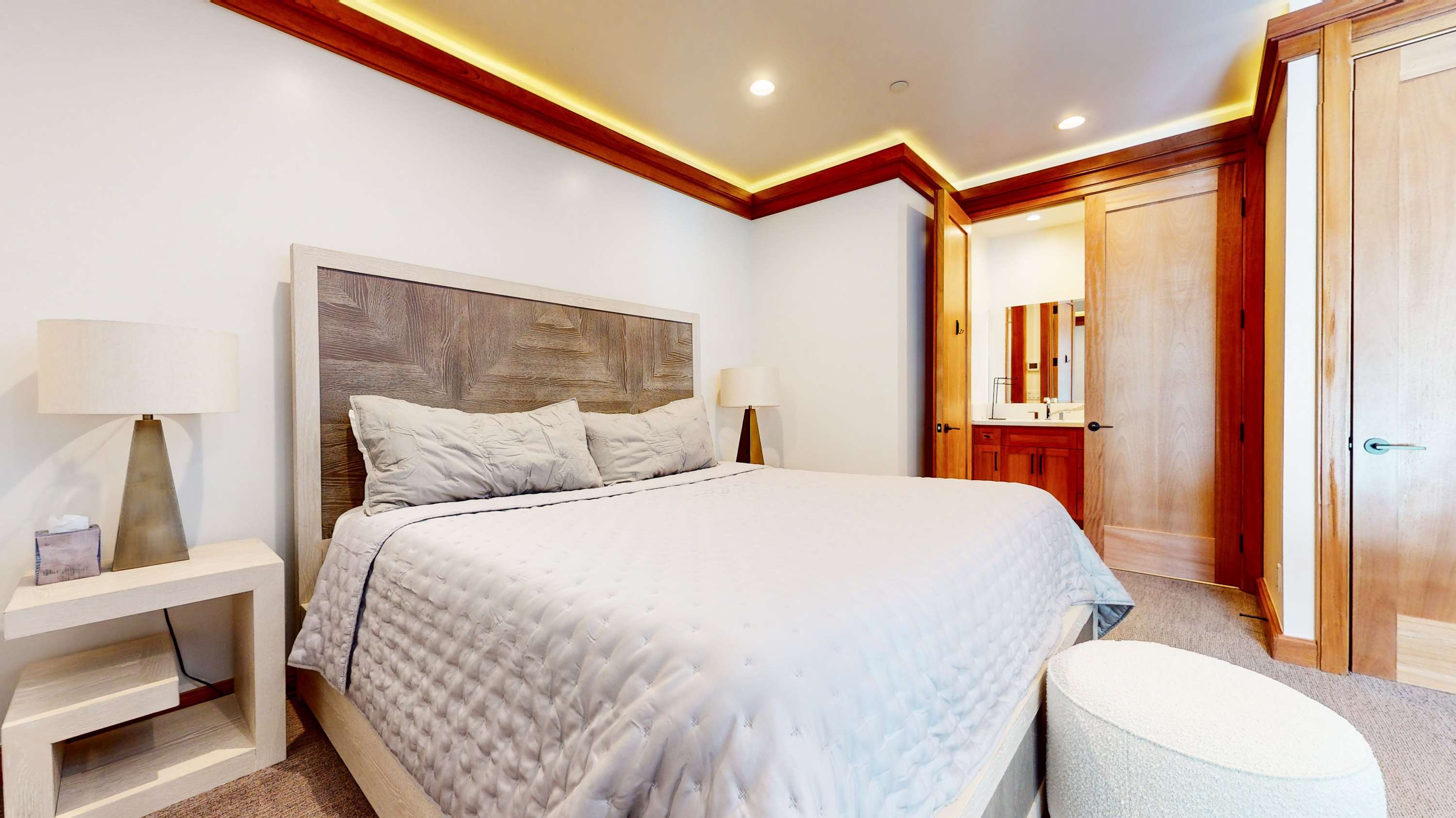 Bedroom #1 includes a California king size bed, smart TV, balcony, and ensuite bathroom with a dual vanity, soaking tub, and glass walk-in shower.
