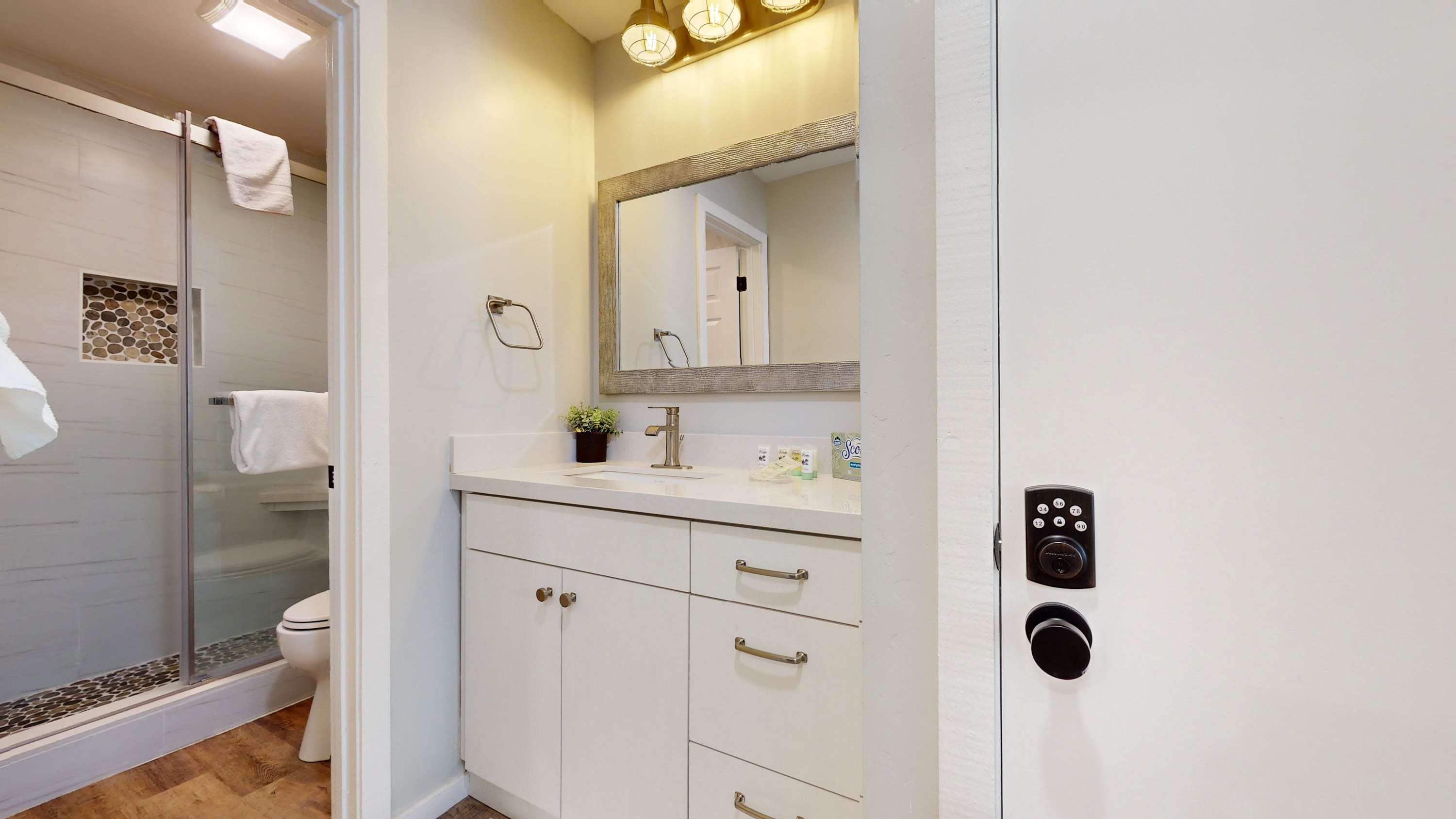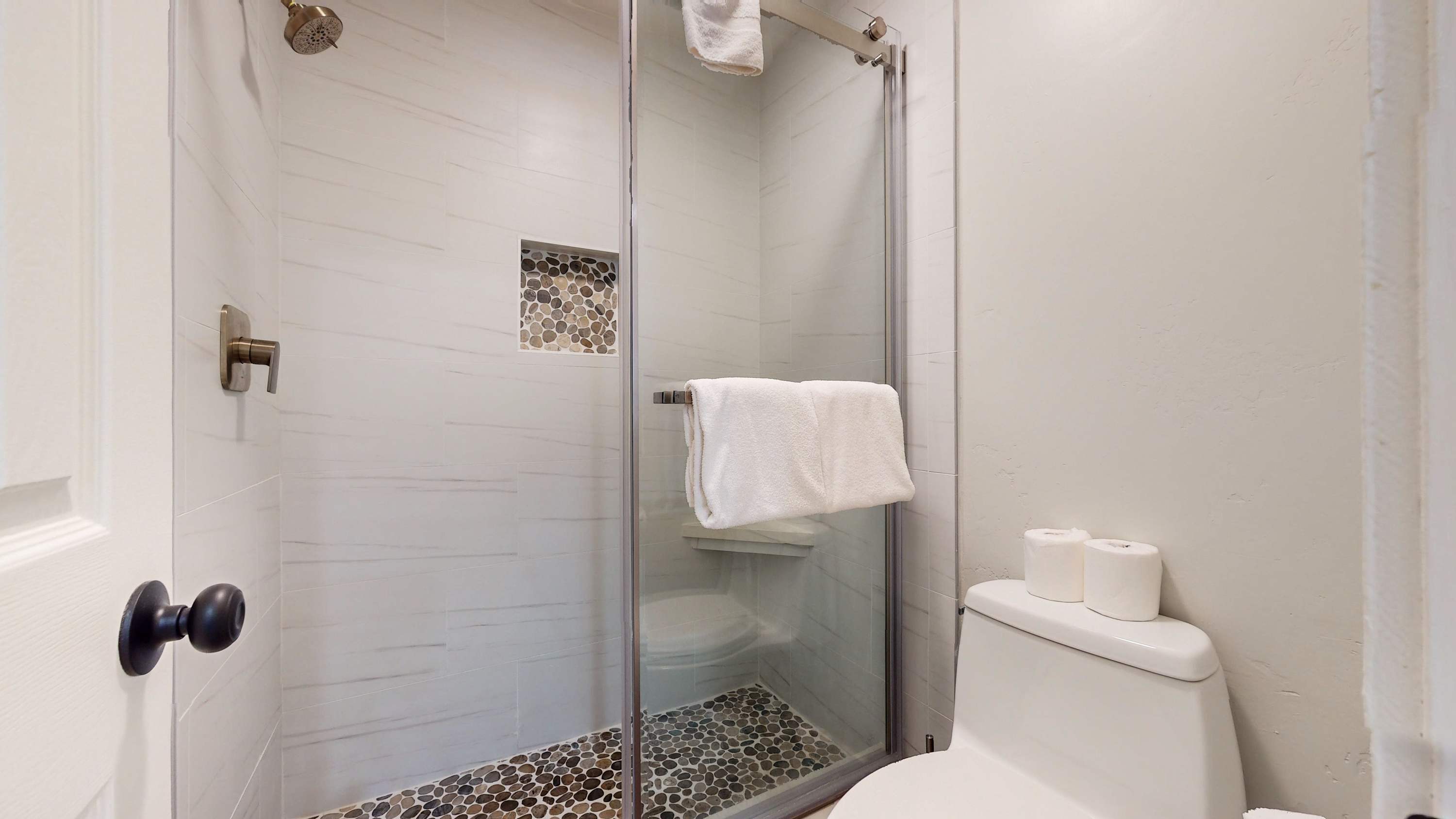 • Bathroom 1: Hall bath with single vanity and glass walk-in shower