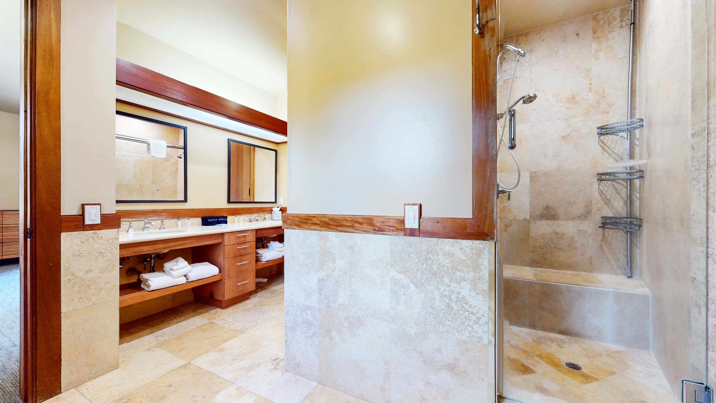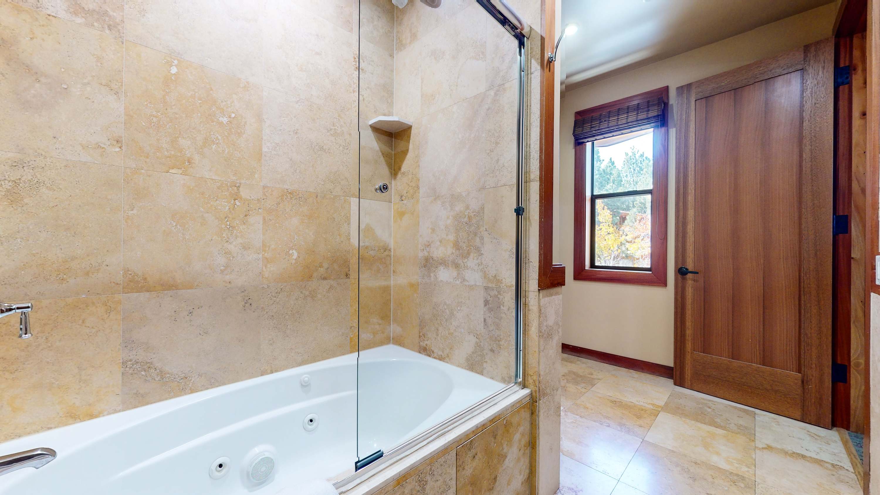 • Bathroom 1 (ensuite to Bedroom 1): Dual vanity, Jacuzzi bathtub, glass walk-in shower