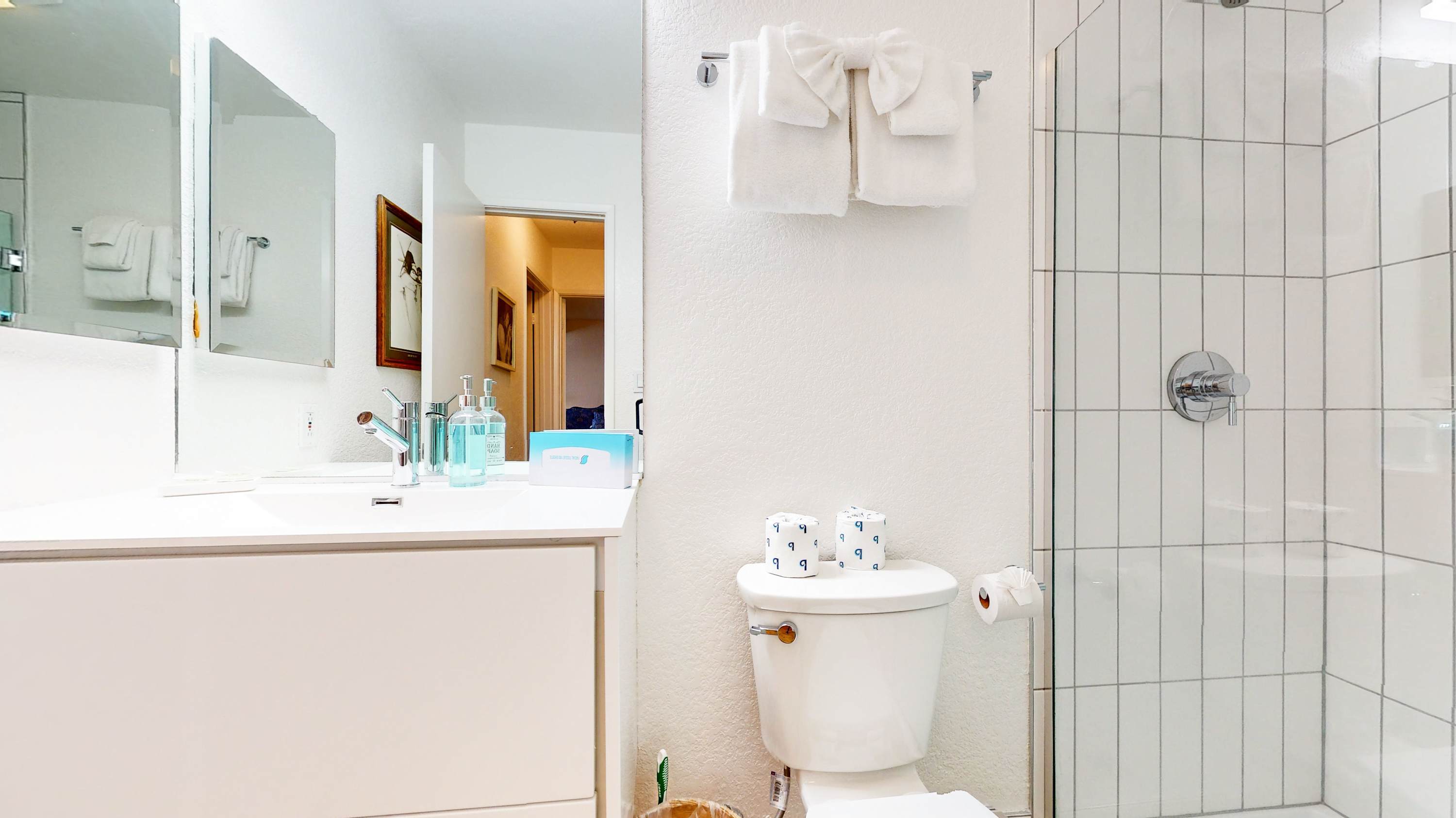 • Bathroom 2: Full bath with single vanity and glass walk-in shower