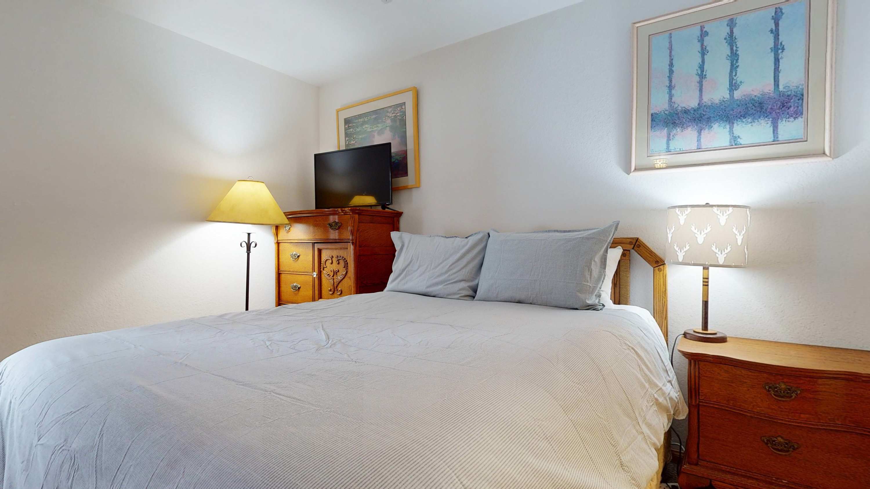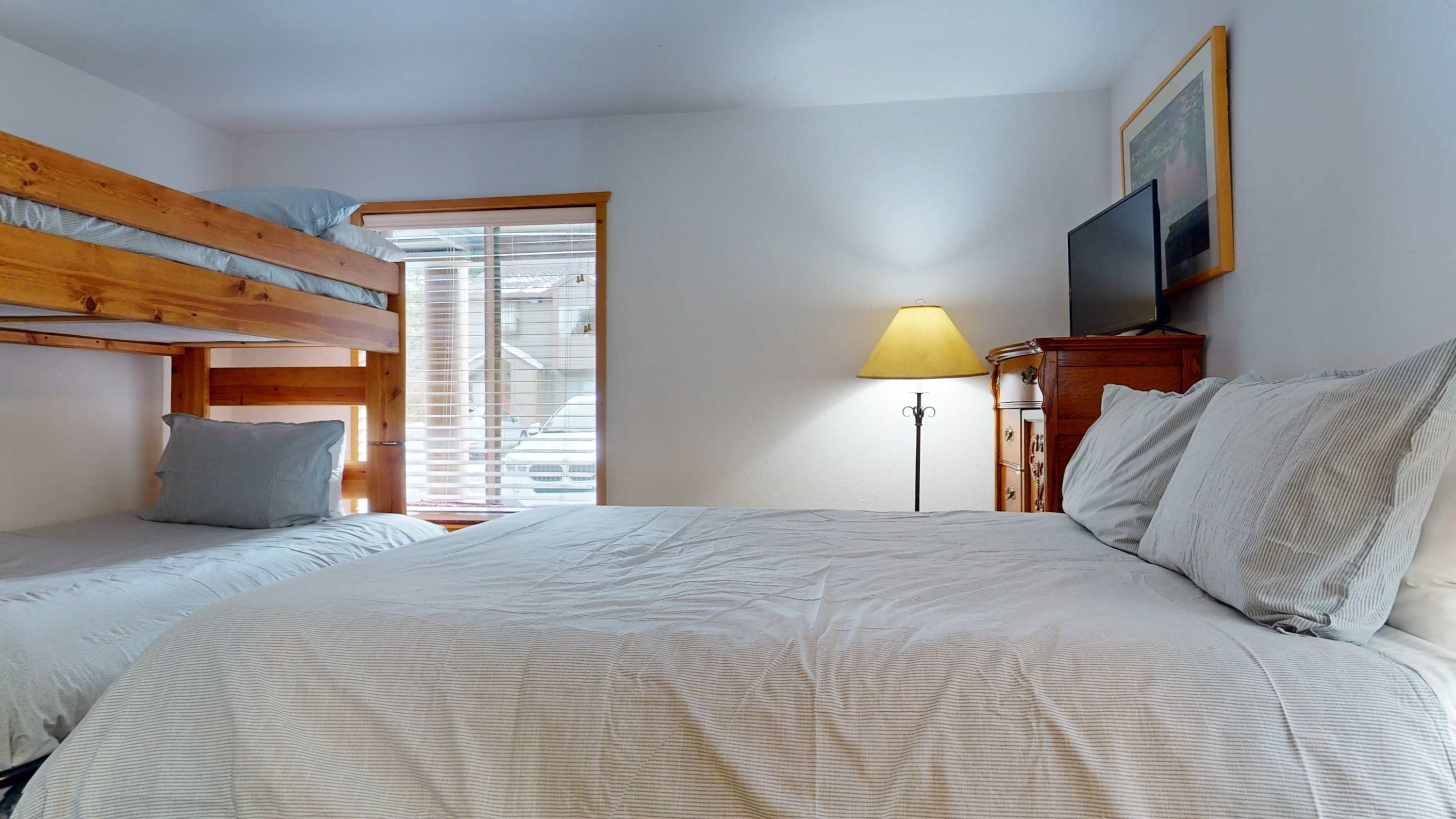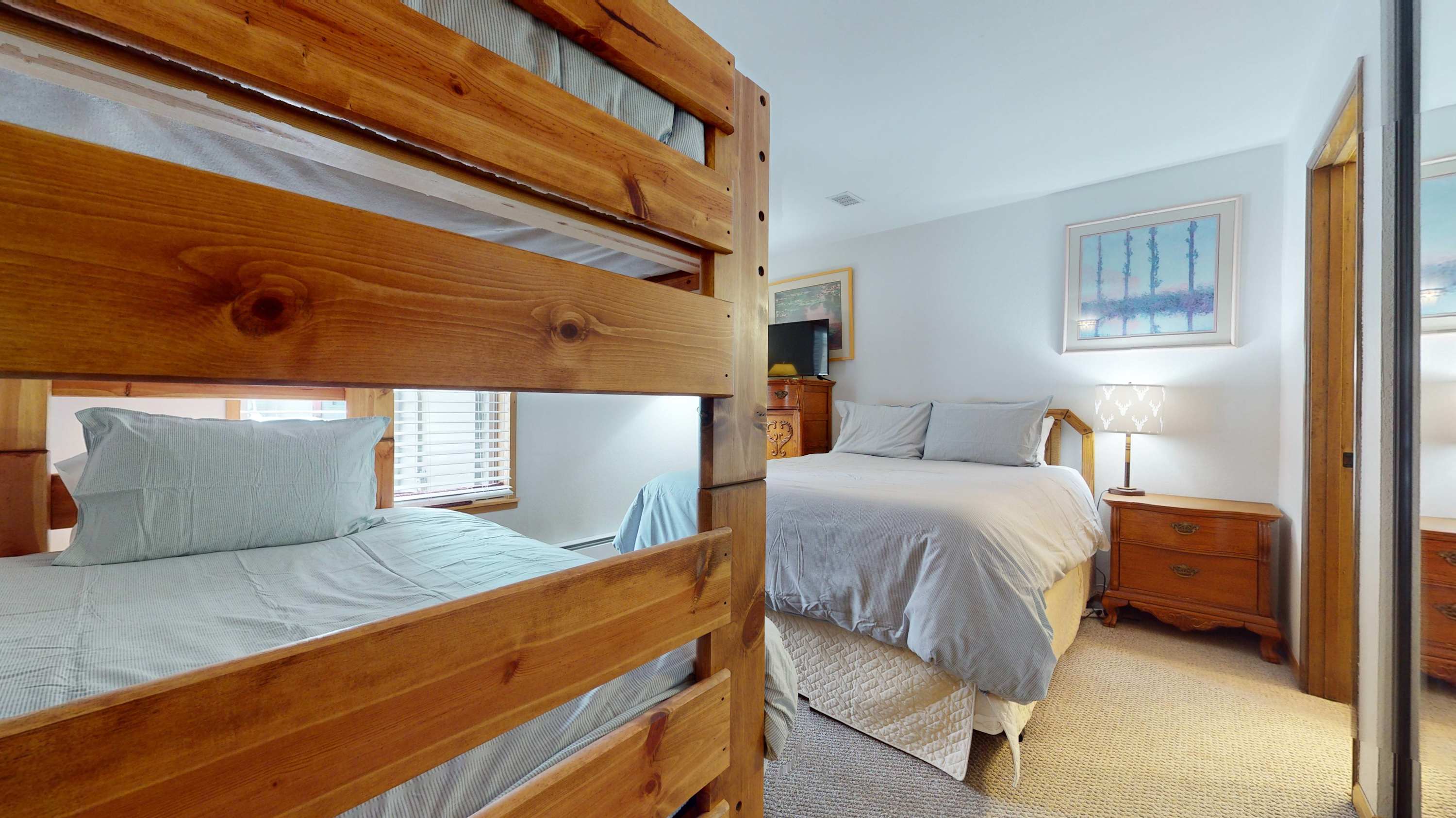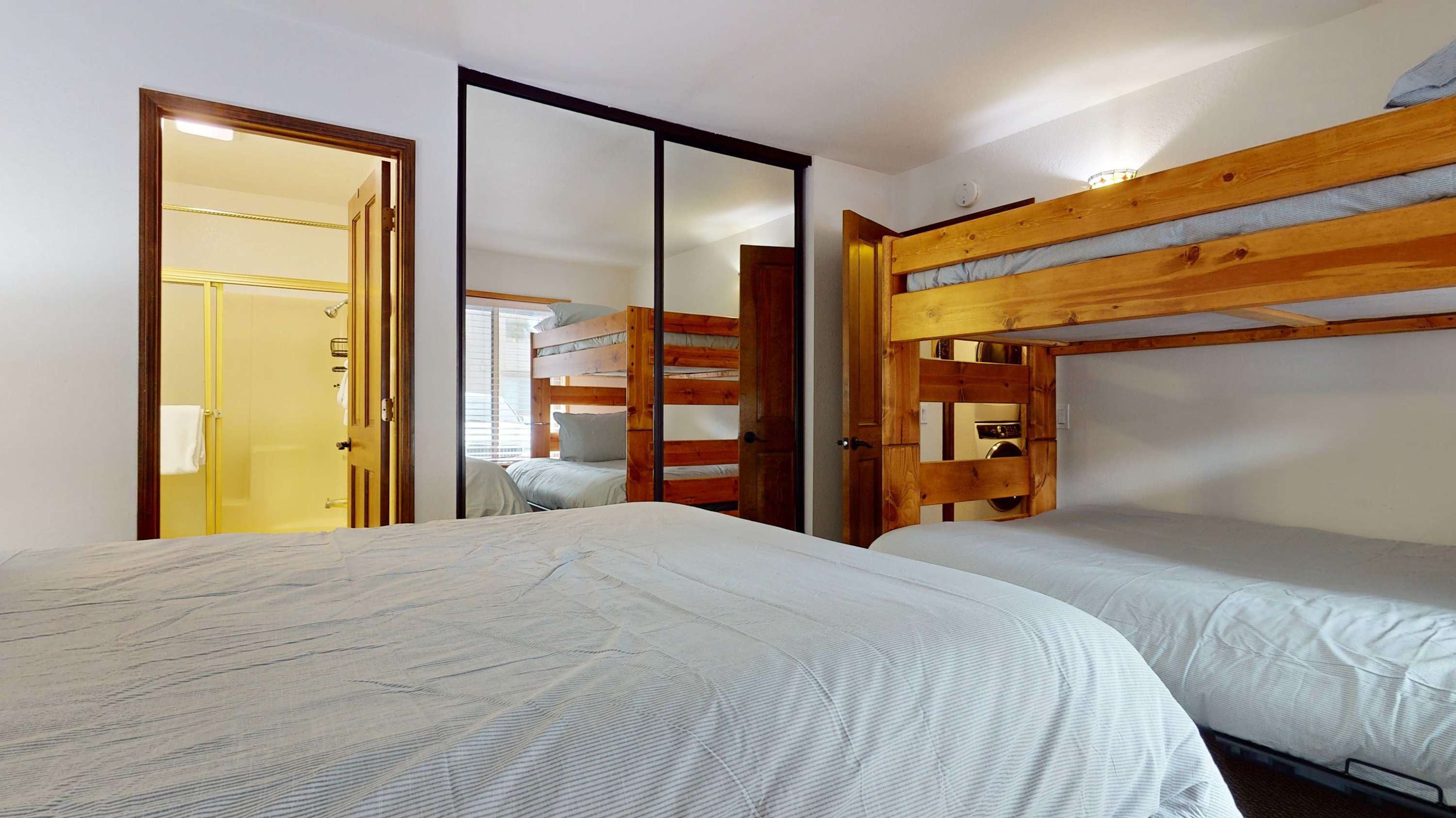 - Bedroom #1 includes a twin-over-full futon bunk bed, a queen size bed, a smart TV, and ensuite bathroom with a single vanity and shower/tub combo, two large dressers (one is in the closet), a large closet, and a nightstand.