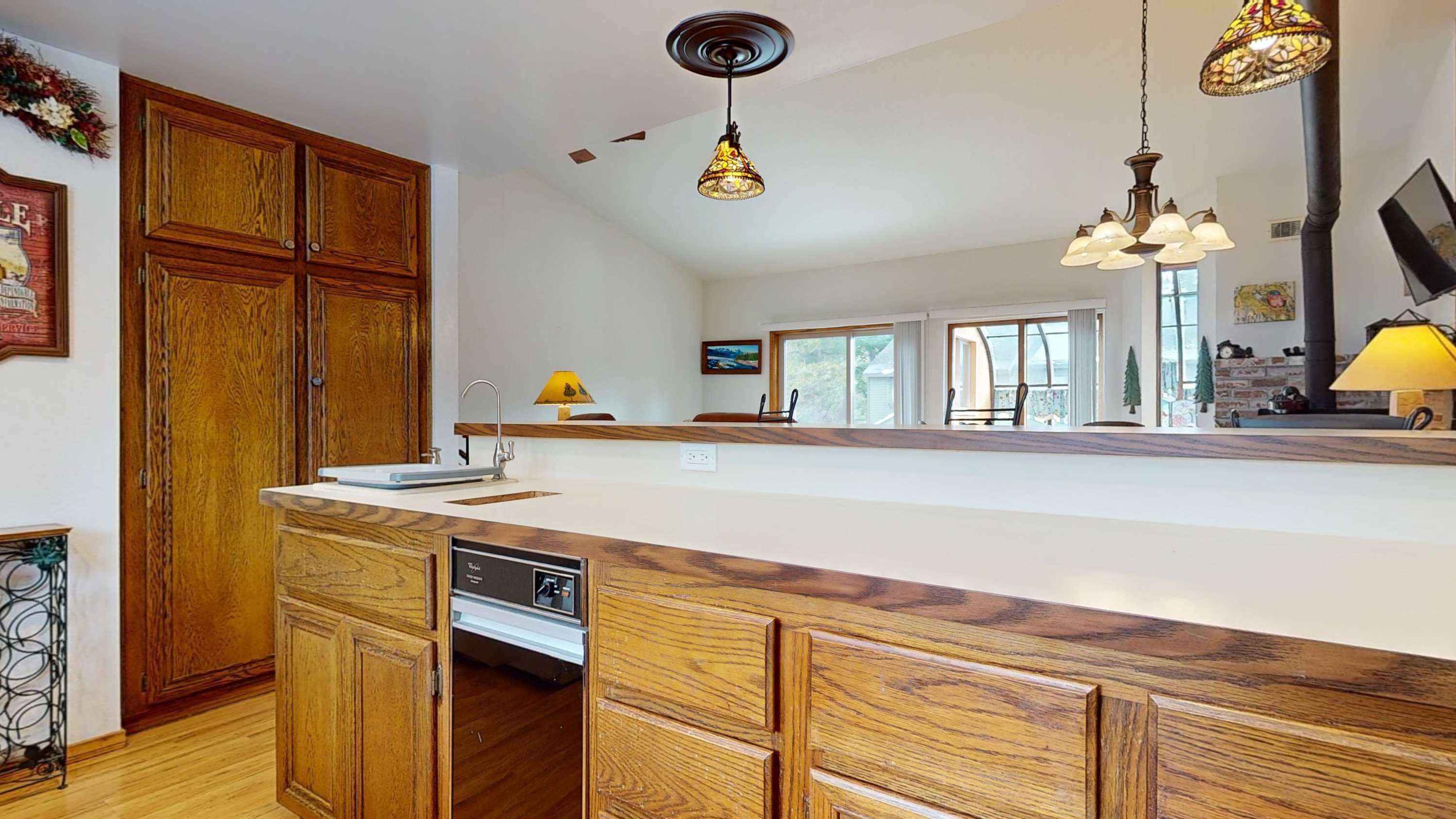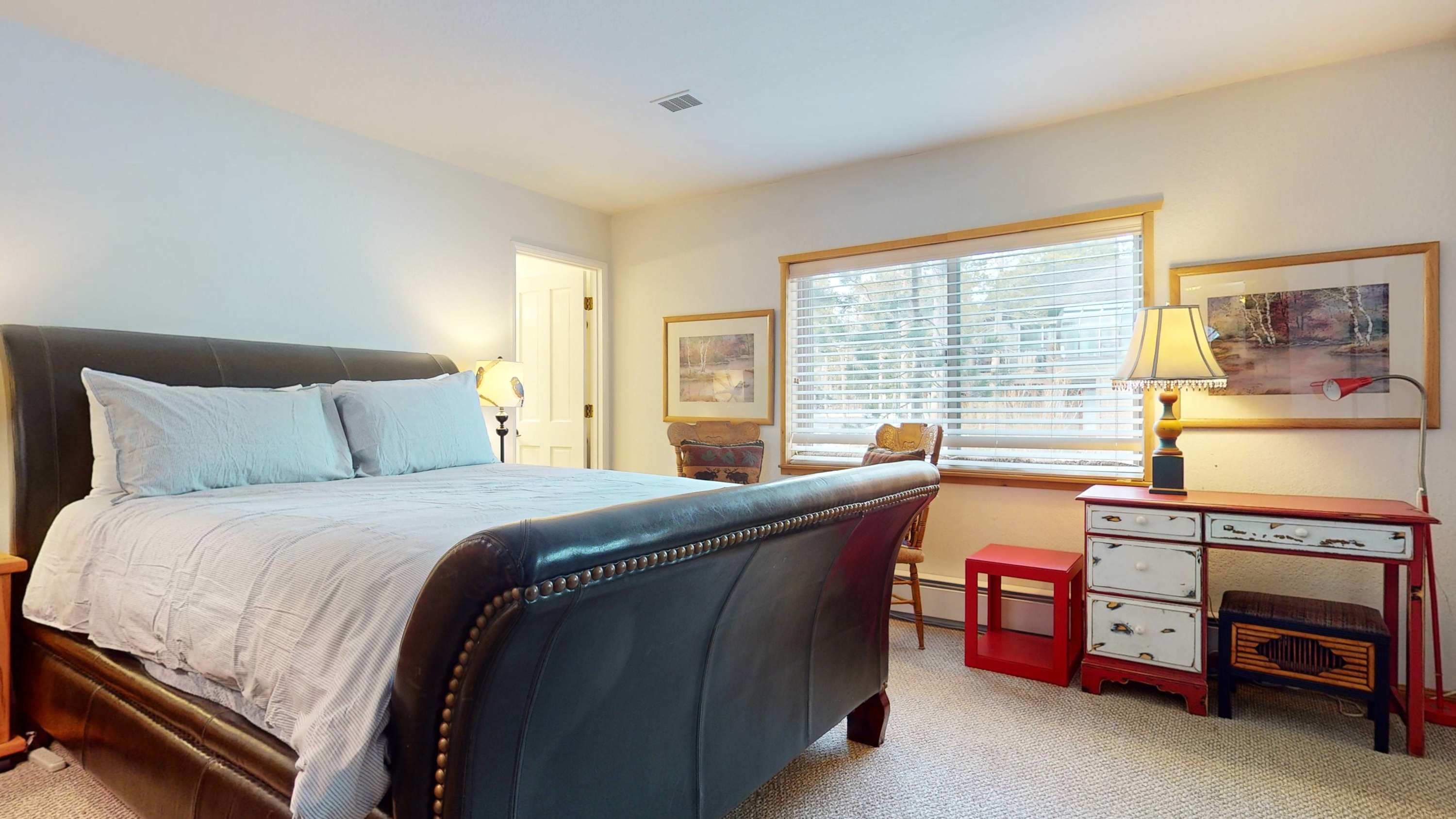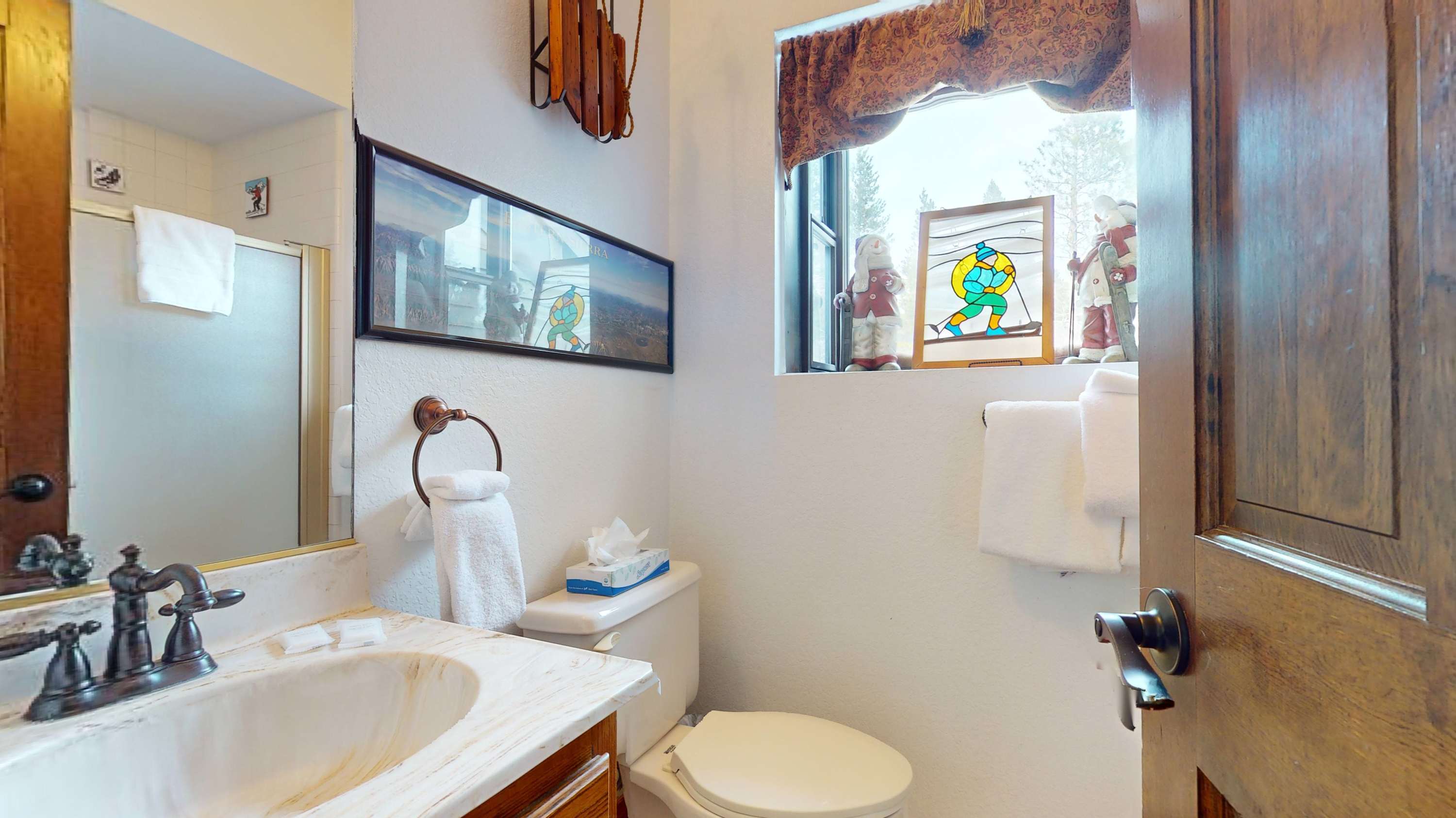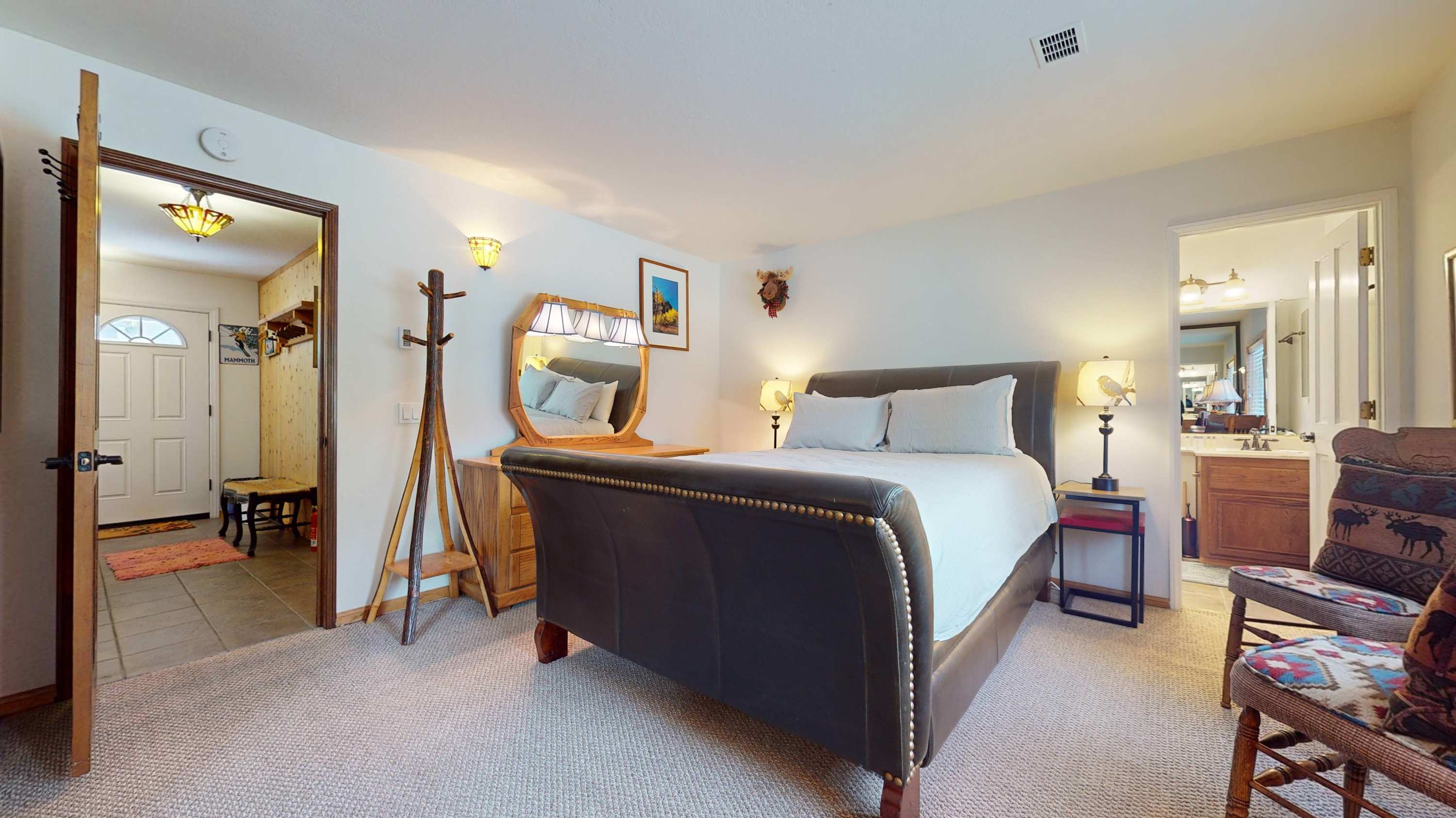 The home’s cozy interior sets the perfect ski cabin vibe, surrounding you in rustic-chic décor and comfortable furnishings. The living room is sunny and bright, with passive heat from the breakfast room and offers plush sofa and armchair seating along with a smart TV for spending precious downtime streaming your favorite shows or a new movie. Enjoy partial mountain views from the well-equipped kitchen as you whip up delicious homecooked meals, served up at the counter on high-top stool seating for 4 or at the formal table with seating for 6. It’s everything you need to have an epic Mammoth vacation and then some!