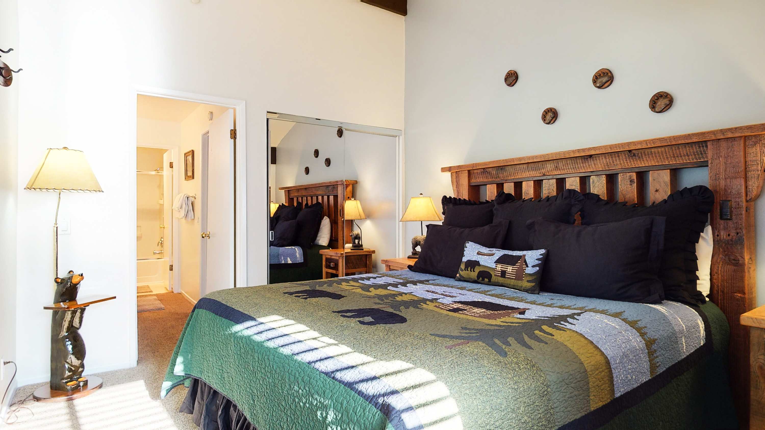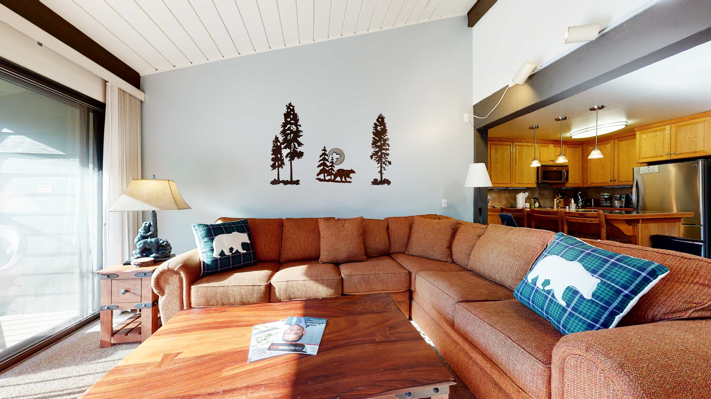 The cozy condo features charming mountain decor throughout. The living room is furnished with comfortable seating around a gas fireplace and a large 60" flat screen TV with cable. From here, you can access the balcony - enjoy your morning coffee in the crisp mountain air.