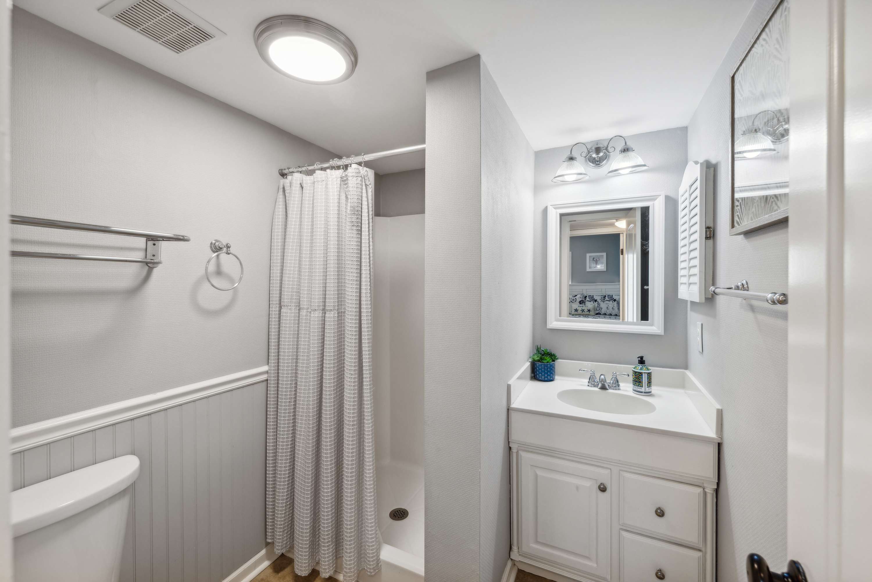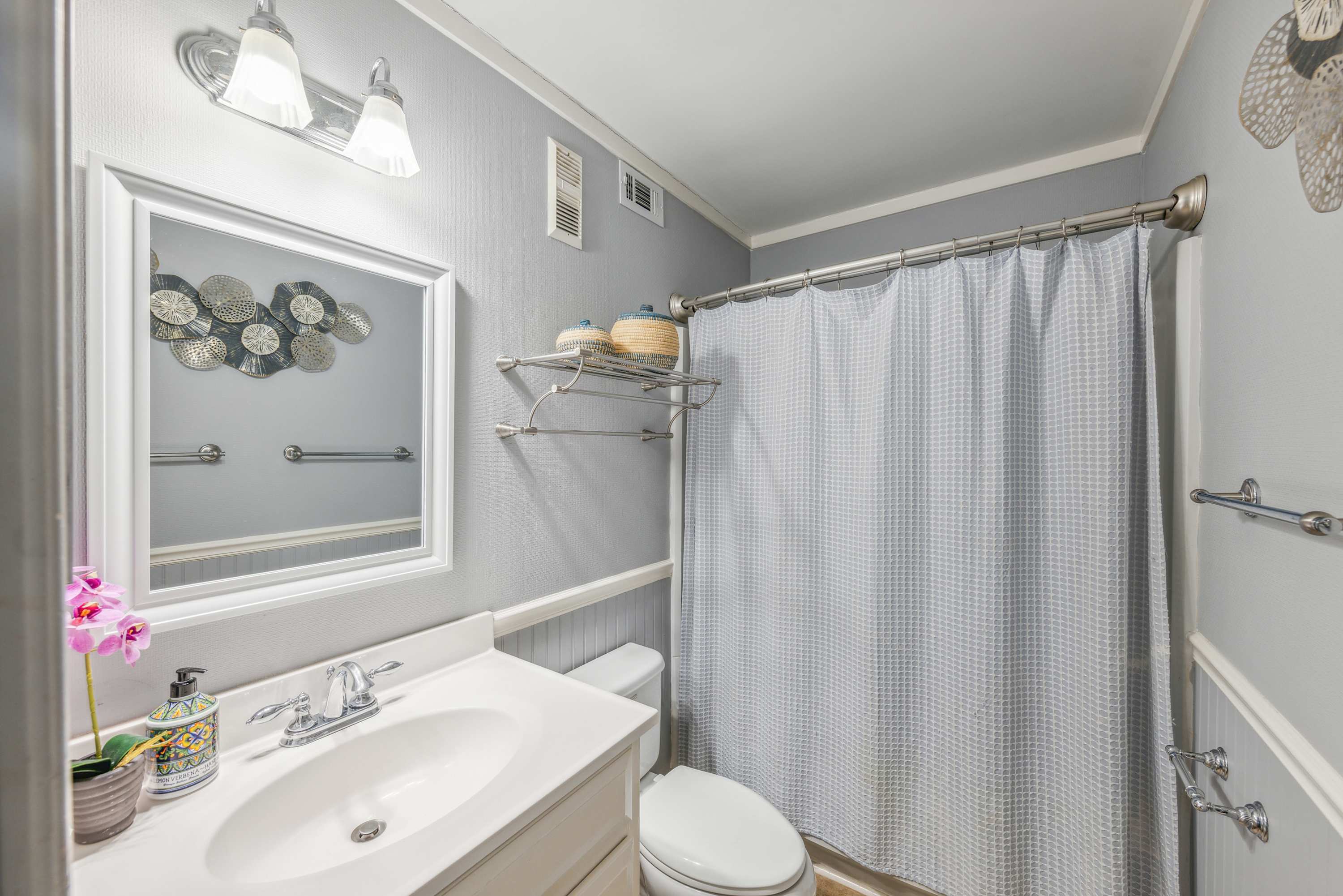 • Bathroom 2 (hall): Single vanity and walk-in shower