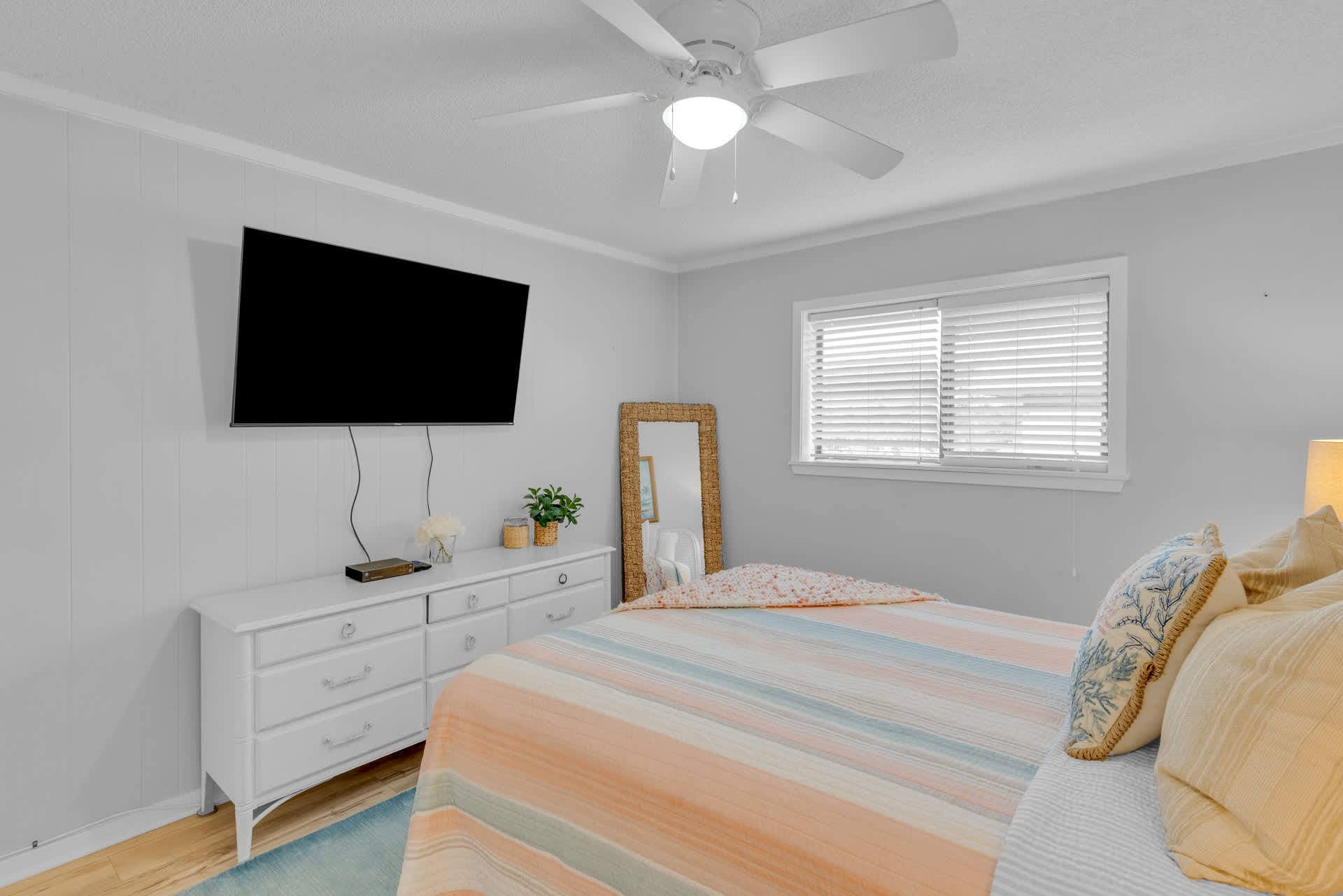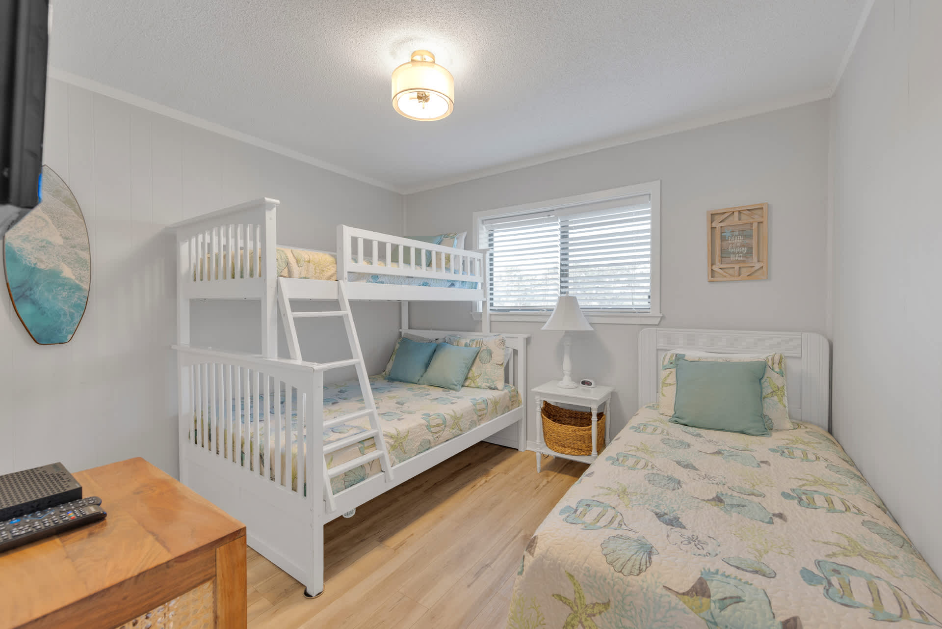 • Bedroom 2: Twin-over-full bunk plus a freestanding twin bed, smart TV; sleeps up to 4