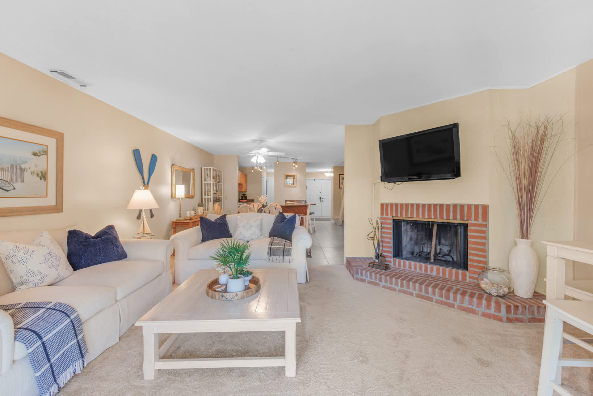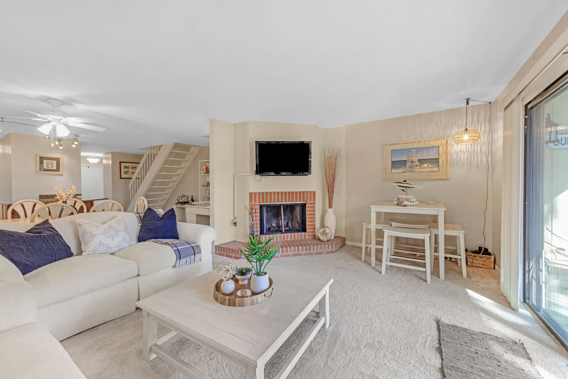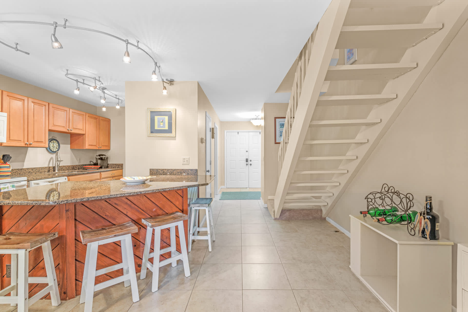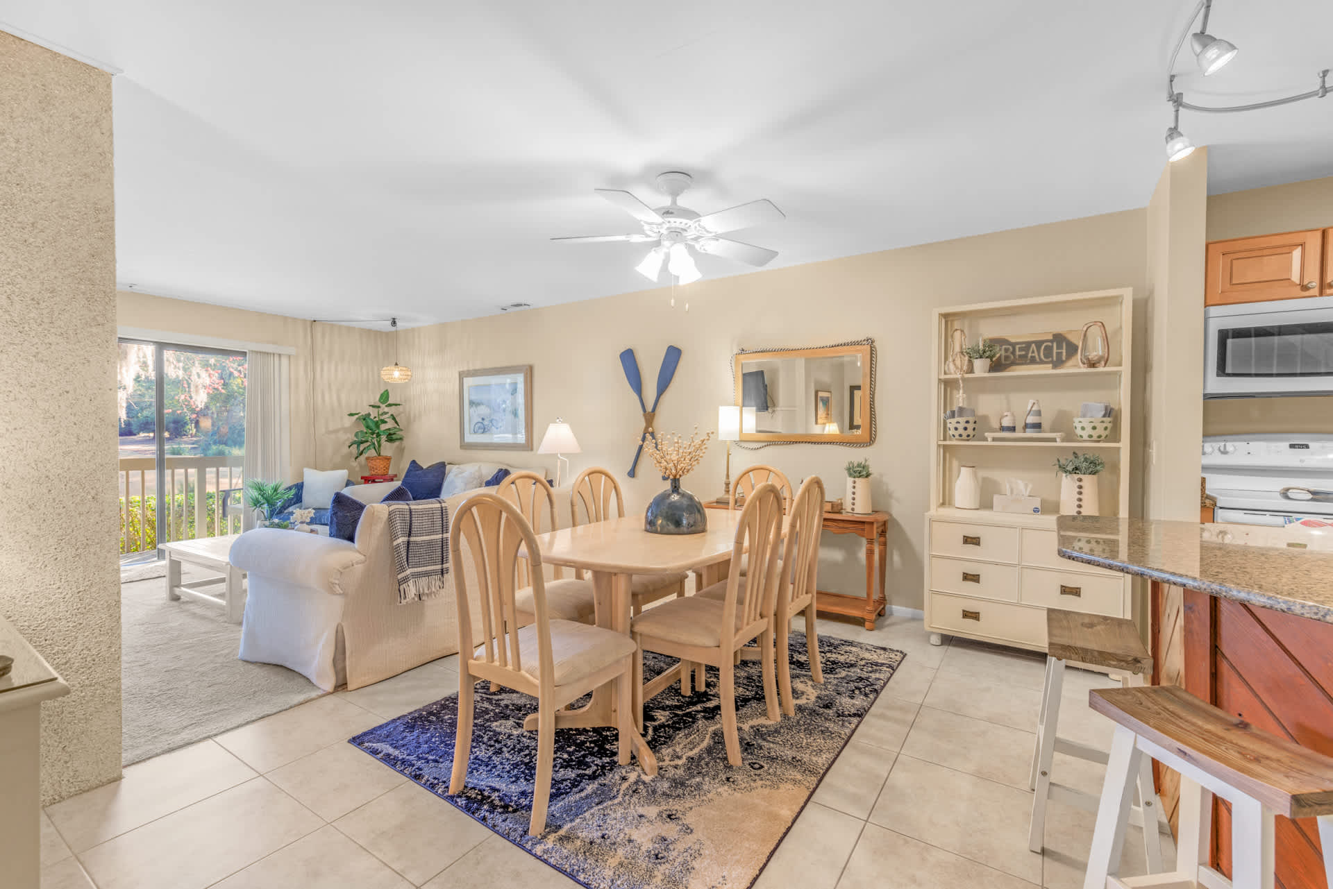 The home’s elegant interior promotes relaxation and connection through the comfortable furnishings, soothing neutral tones, and coastal-themed décor. The living room offers plush sofa seating, a smart TV for streaming all your favorite shows, a high-top 4-person card table, and sliding door access onto the deck illuminating the room in natural light. In the dining room, a 6-person table is perfect for gathering the group for formal meals, while a dedicated workspace offers a desk and chair for keeping up on those pesky emails. The modern kitchen is fully equipped for all your culinary endeavors, showcasing full-sized appliances, granite counters, and sleek cabinetry stocked with cookware and dining ware. Snag a stool at the counter to snack on a delicious spread of afternoon hors d’oeuvres. As the sun rises on a spectacular new day, brew up a fresh cup of coffee on the Keurig and head out to the deck to immerse yourself in the sights and sounds of nature.
