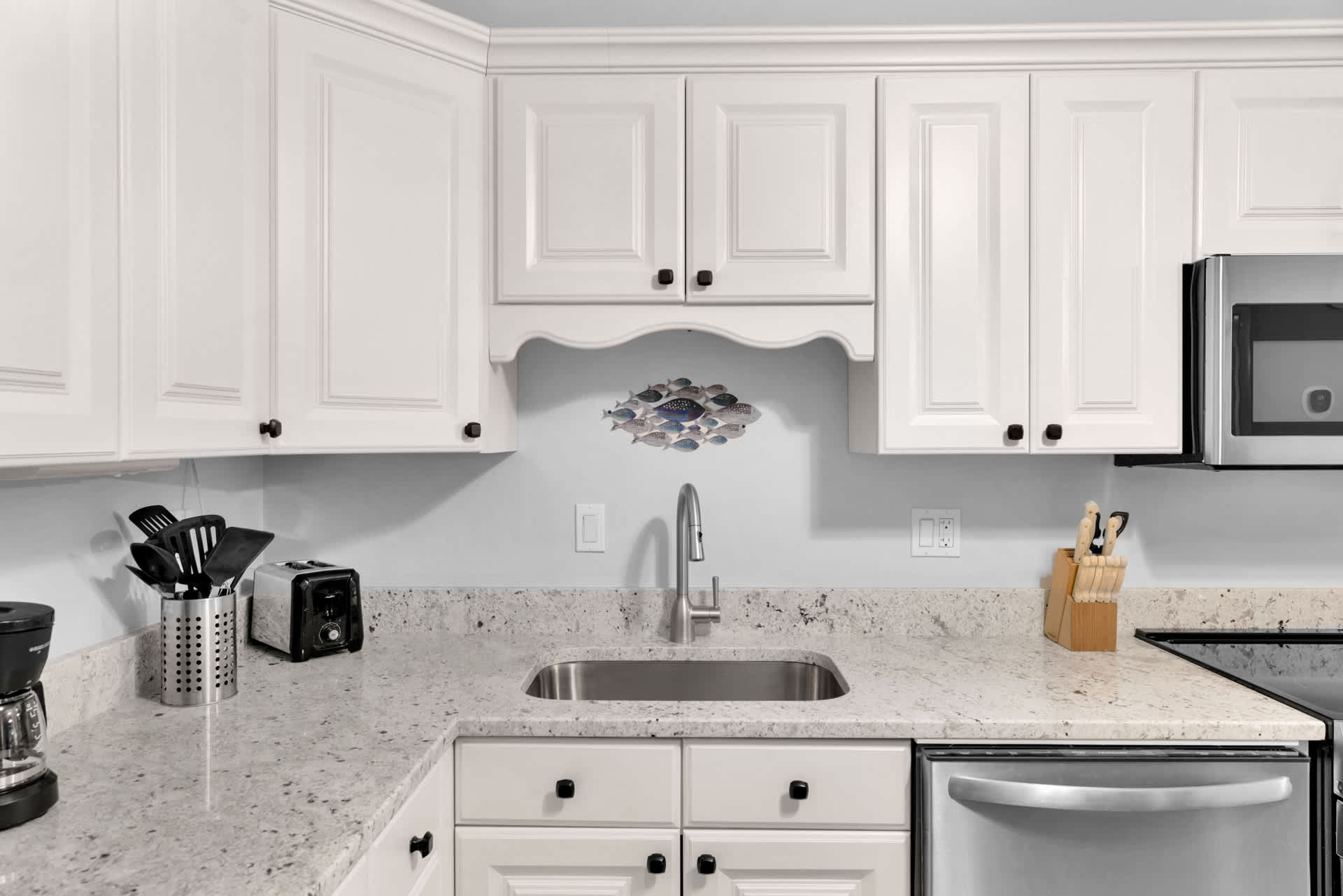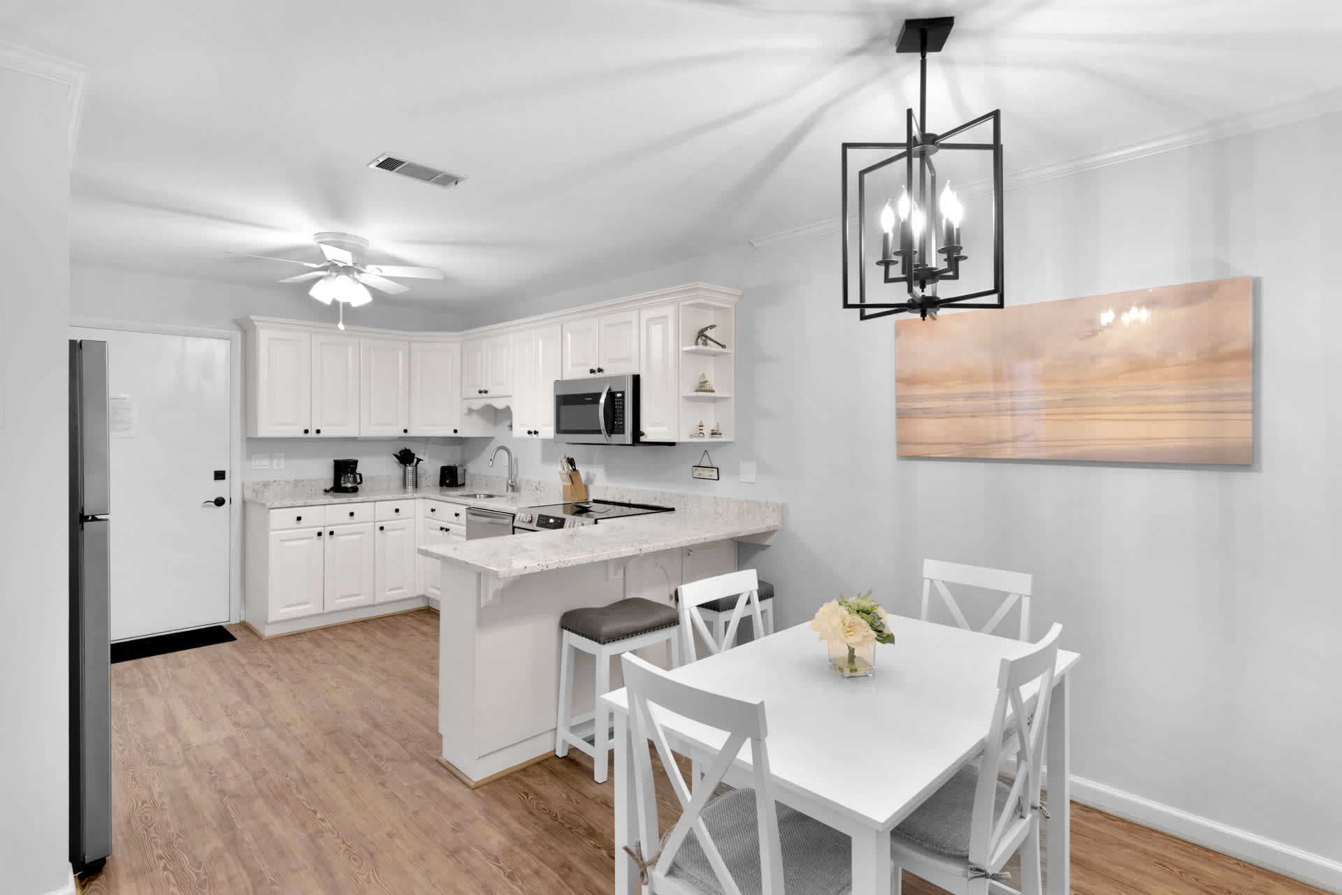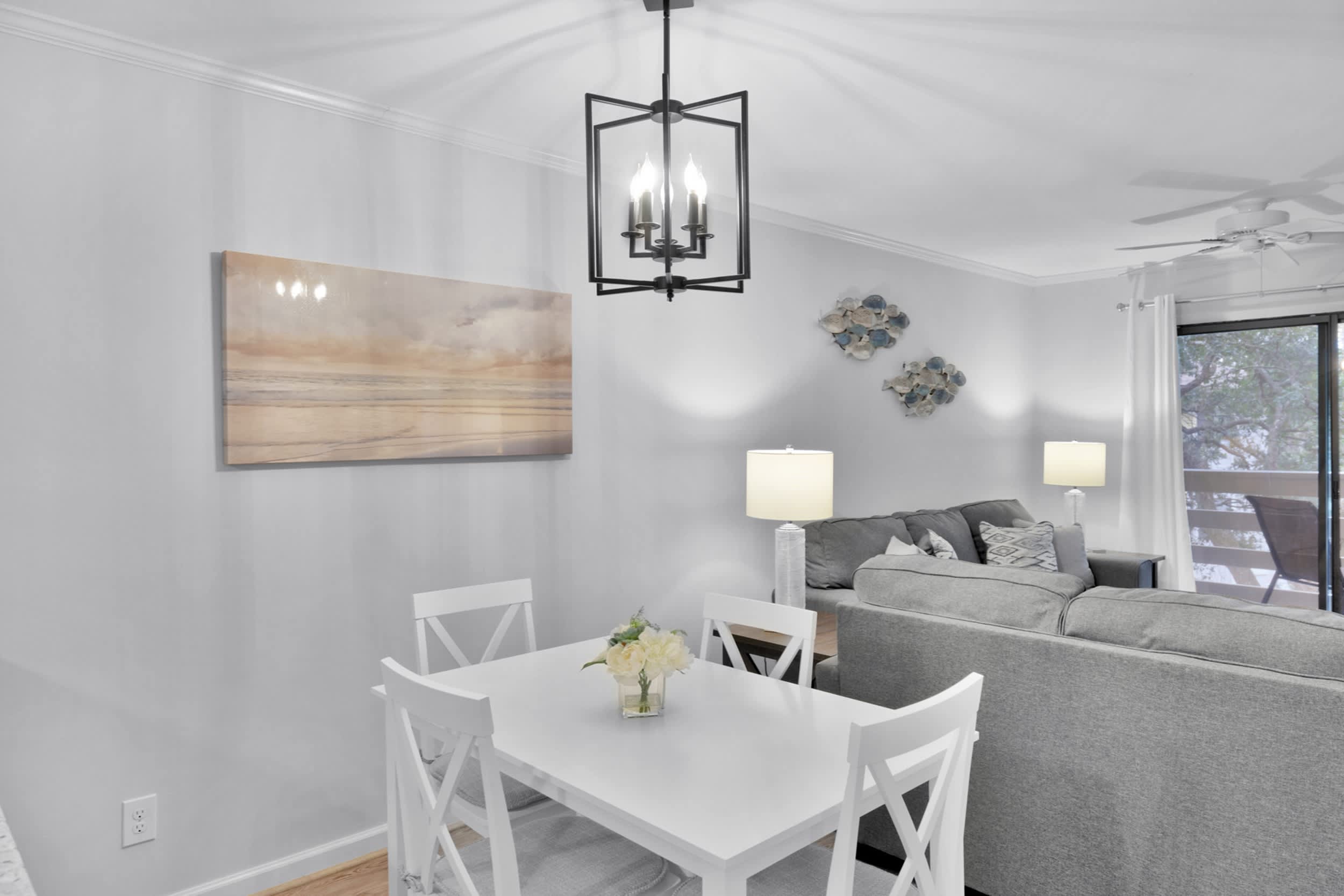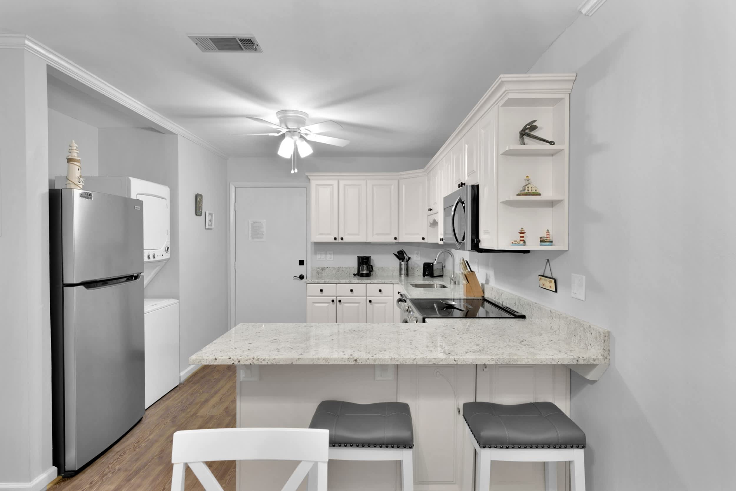 Stepping inside the home, you’ll be met with calming neutral tones and comfortable furnishings, accented with charming beach-themed décor. The cozy living room includes a plush sofa and loveseat along with a smart TV for evenings spent streaming family movies. The open floorplan will keep everyone connected whether at the dining table enjoying well-earned meals or in the kitchen preparing them. Speaking of the kitchen, you’ll find it fully equipped with stainless steel appliances, glossy stone countertops, and sleek cabinetry stocked with cookware and dining ware. Fire up the drip coffee maker first thing in the morning and relax with your fresh cup out on your private balcony at the café style seating for 2.