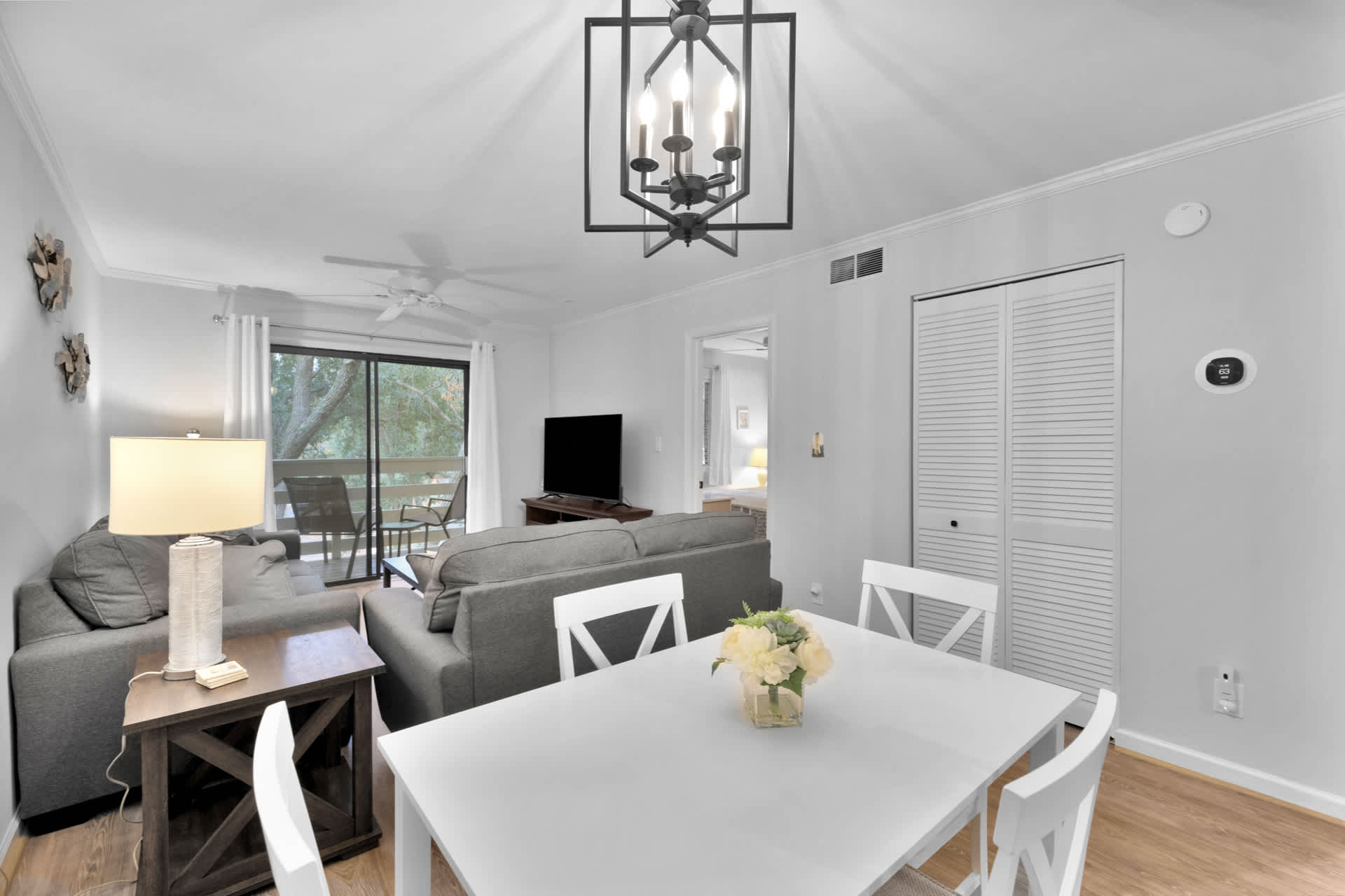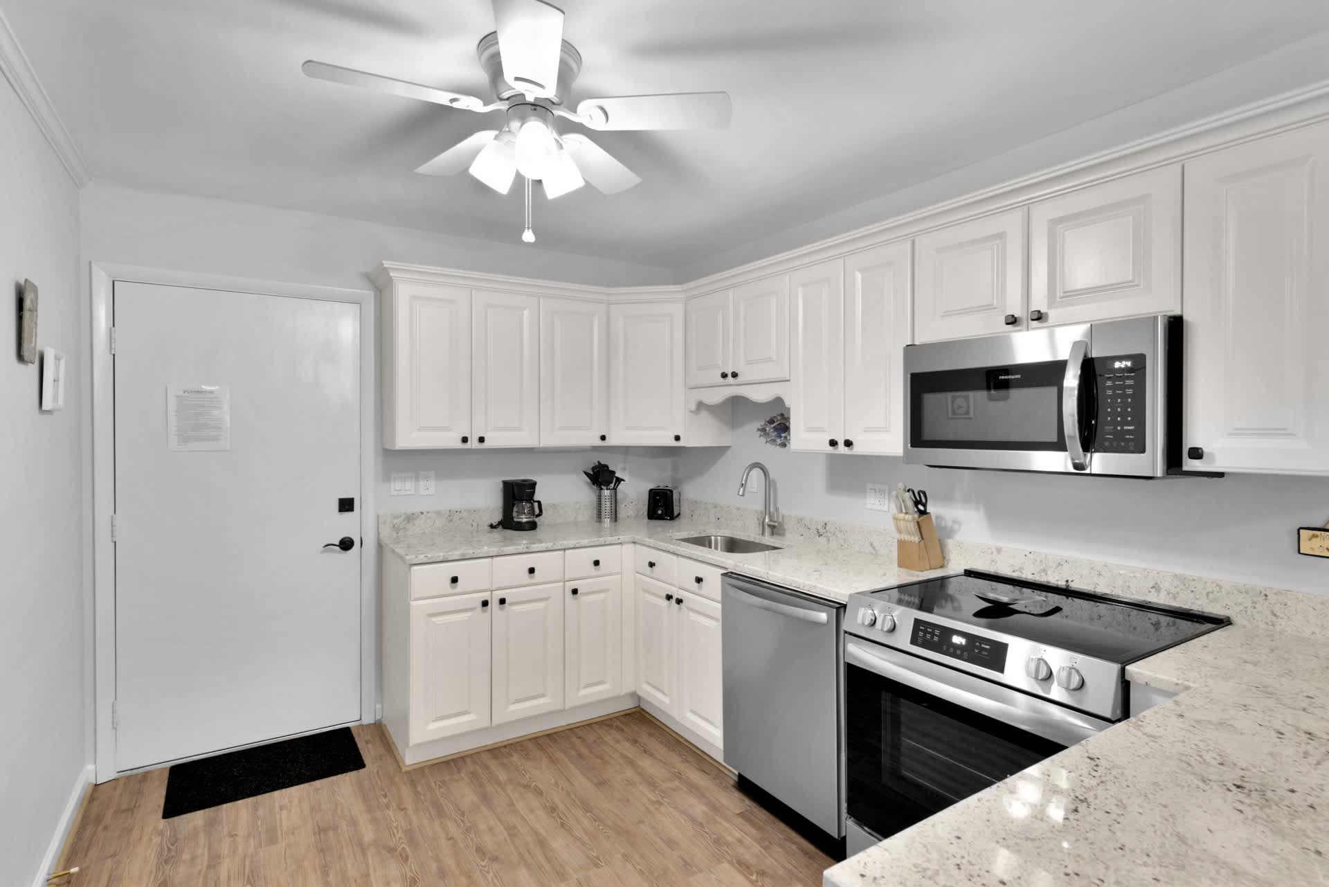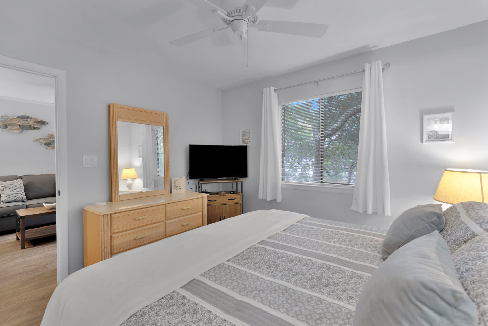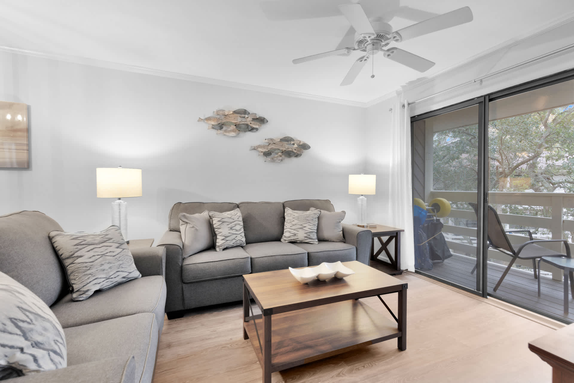 Stepping inside the home, you’ll be met with calming neutral tones and comfortable furnishings, accented with charming beach-themed décor. The cozy living room includes a plush sofa and loveseat along with a smart TV for evenings spent streaming family movies. The open floorplan will keep everyone connected whether at the dining table enjoying well-earned meals or in the kitchen preparing them. Speaking of the kitchen, you’ll find it fully equipped with stainless steel appliances, glossy stone countertops, and sleek cabinetry stocked with cookware and dining ware. Fire up the drip coffee maker first thing in the morning and relax with your fresh cup out on your private balcony at the café style seating for 2.