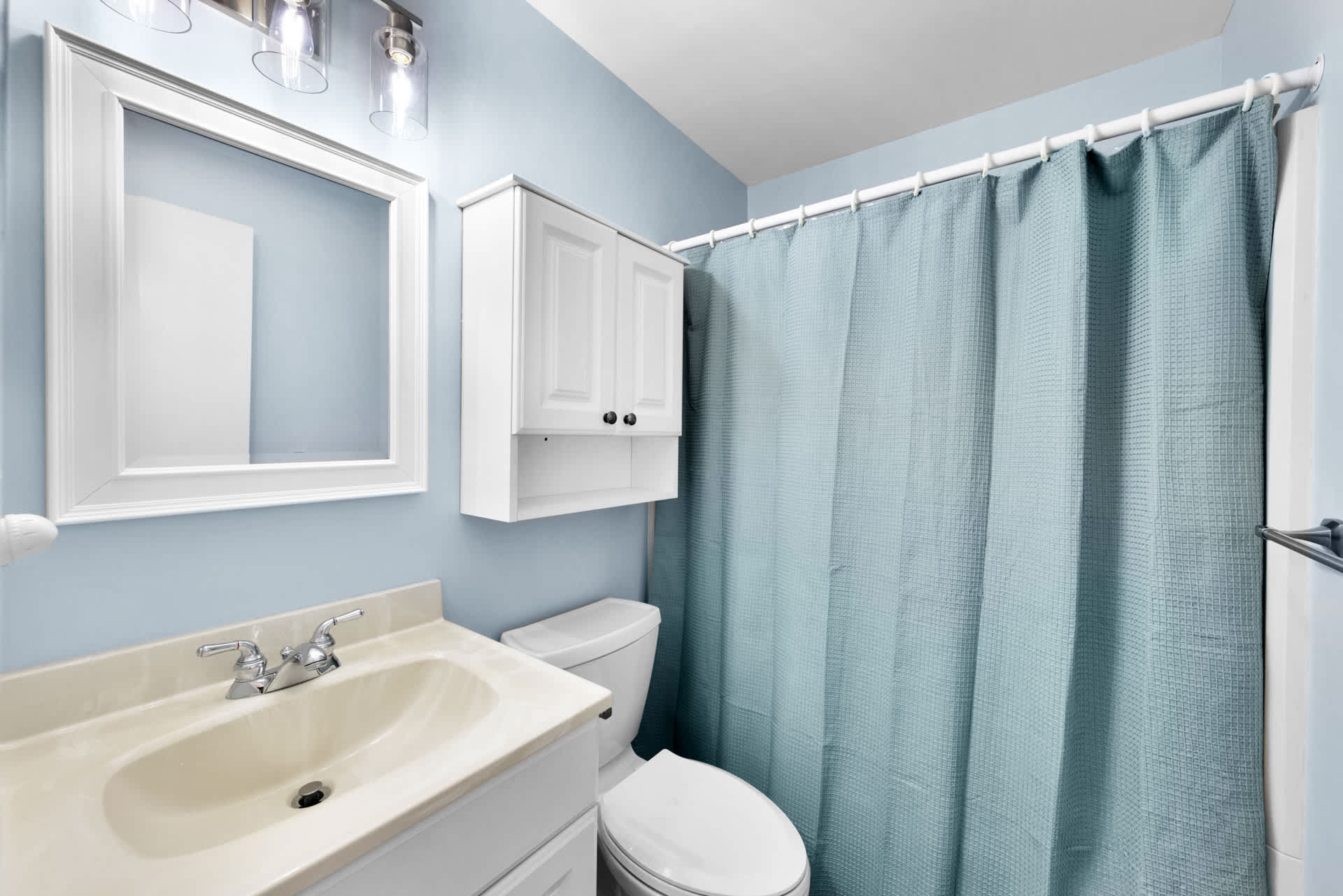 The home also includes an additional full guest bathroom with a single vanity and shower/tub combo.