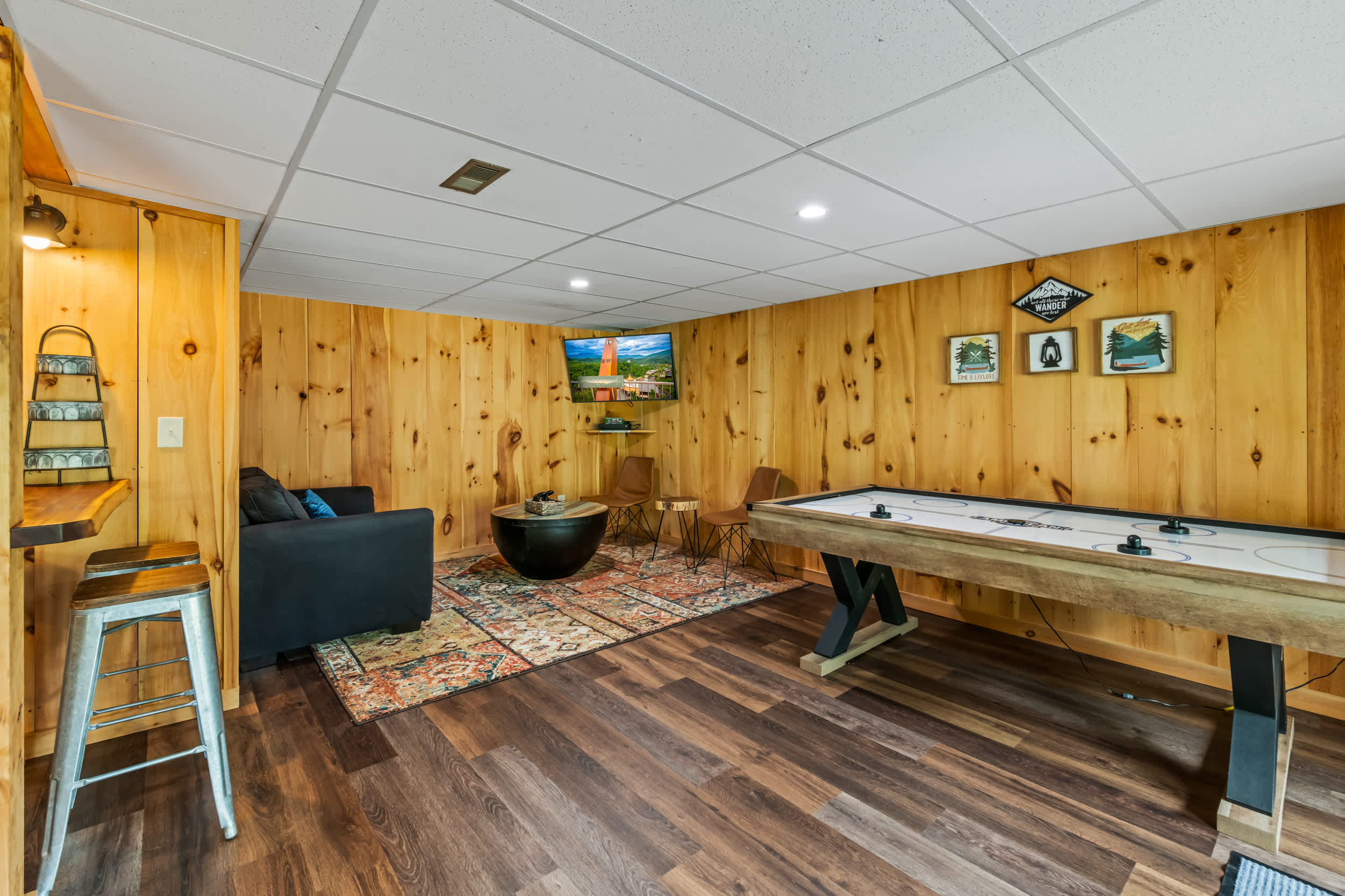 The main living area offers space to gather, with a full-size sleeper sofa for extra flexibility and a fireplace available seasonally. Head to the game room for friendly competition at the pool table and foosball table, or step outside to unwind in the hot tub. The backyard area features a fire pit and BBQ grill for evenings under the stars.