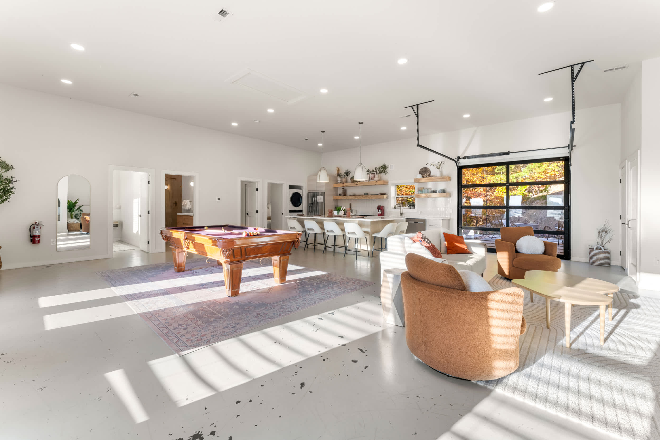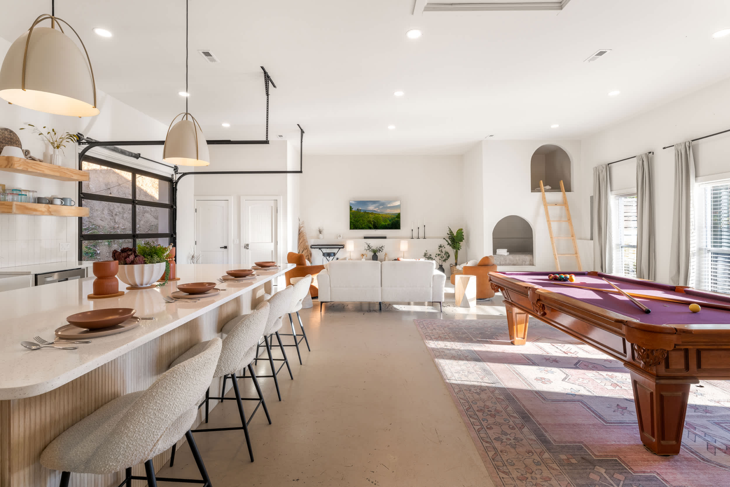 Indoors, the bright, open floorplan has been expertly curated to maximize your downtime, with contemporary furnishings and chic décor. Enjoy sweeping views of the mountainous countryside from just about any room in the home, whether you’re surfing the channels in the cozy living room on plush sofa and armchair seating or whipping up delicious culinary delights in the stylish kitchen. Stainless steel appliances, glossy stone countertops, and sleek cabinetry and shelving round out the amenities you’ll find here, and you can dine on meals both large and light at the island with high-top stool seating for 6. Tap into your competitive side at the convertible table offering pool or ping pong for hours of laughs and fun.
