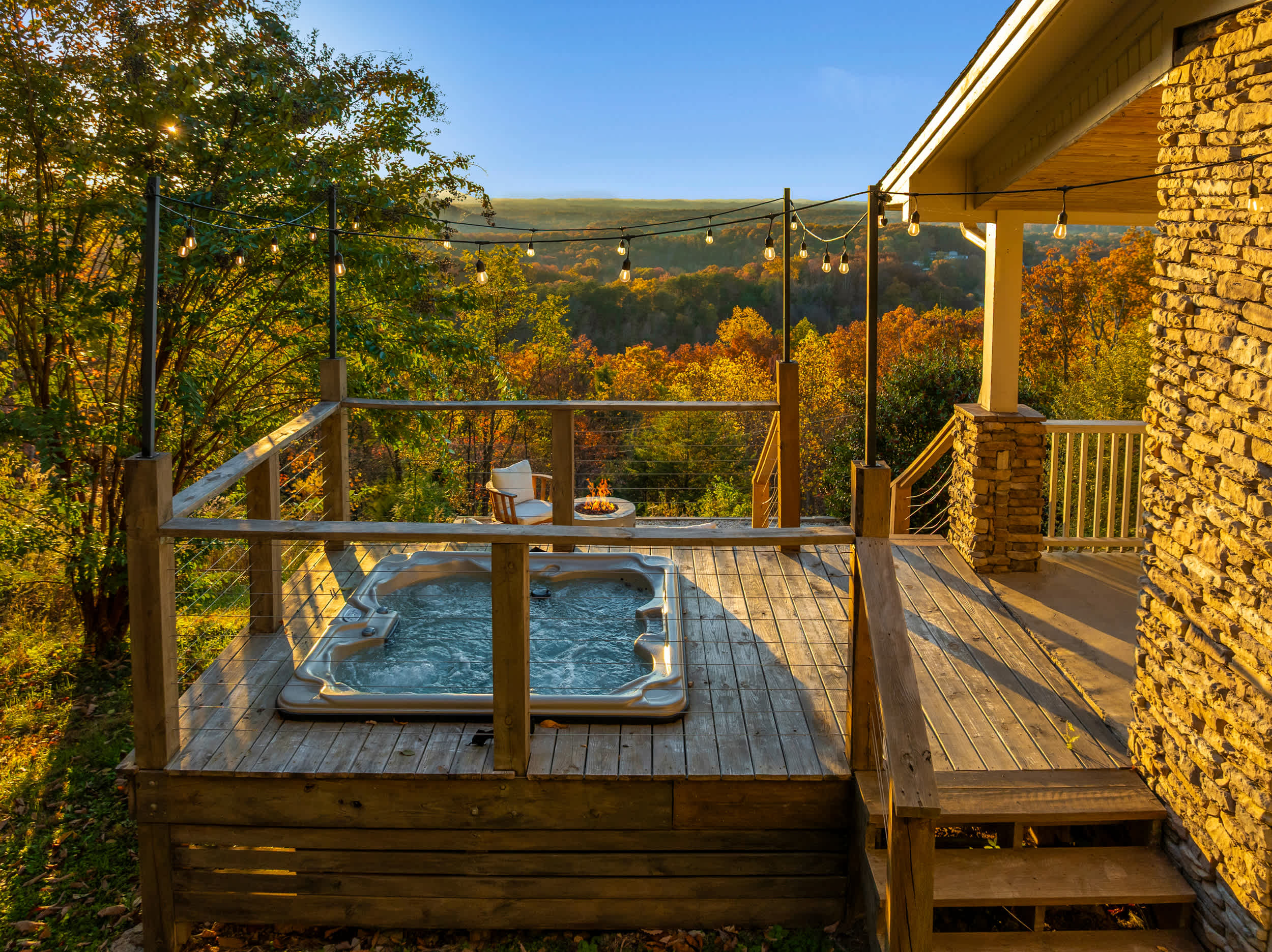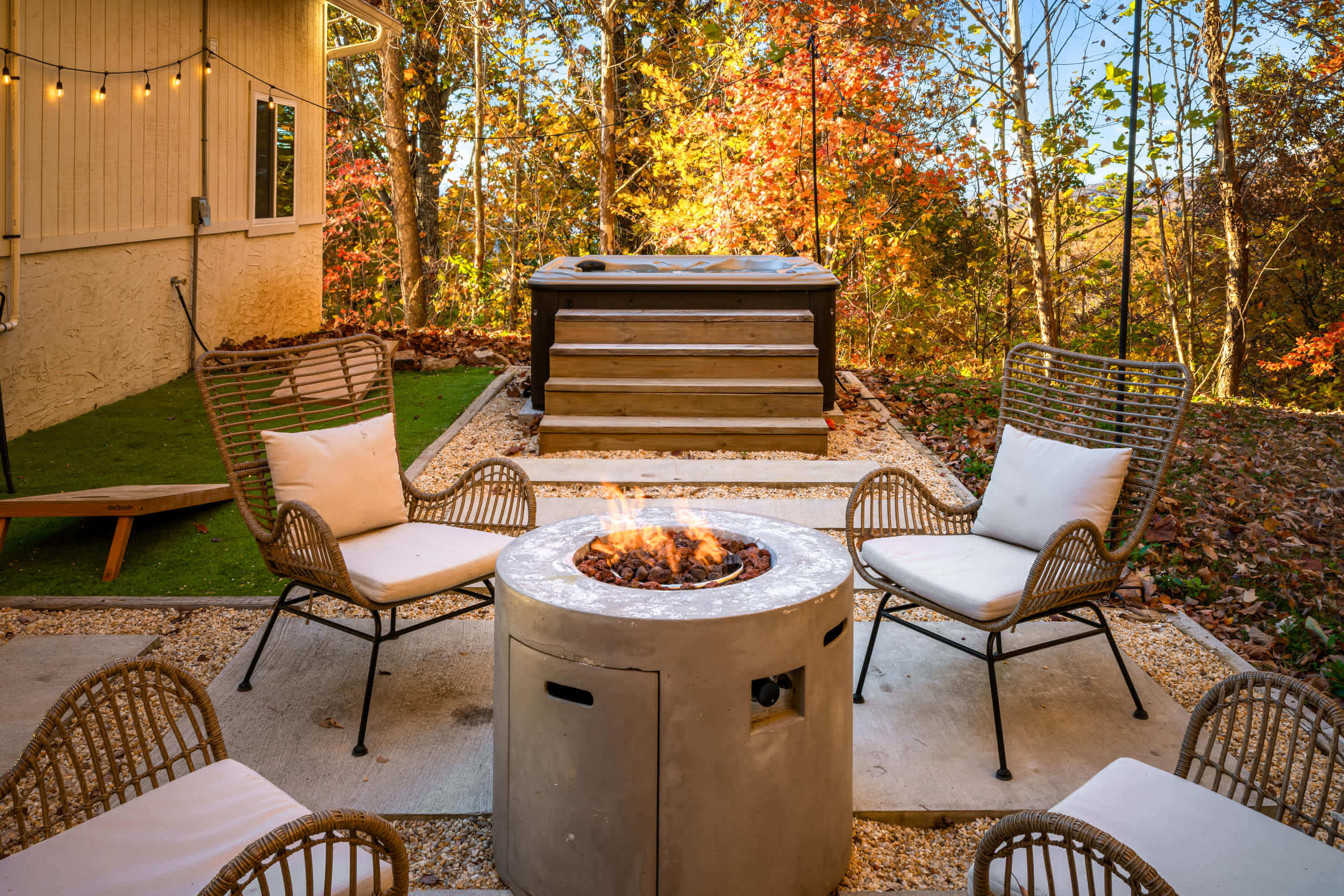 At Roxy B, the backyard oasis offers a tranquil space whether you’re gathered around the above ground firepit, toasting up tasty treats under the twinkling lights or soaking your cares away in the bubbling hot tub. Try your hand at a game or two of cornhole, while cocktails can be served up at the counter with barstool seating for 2. Indoors the open floorplan offers sweeping views of the mountainous countryside from just about any room in the home whether you’re surfing the channels on plush sofa and armchair seating or whipping up culinary delights in the kitchen. Stainless steel appliances, glossy stone countertops, and sleek cabinetry and shelving round out the amenities you’ll find here, and you can dine on meals both large and light at the island with high-top stool seating for 6. Tap into your competitive side at the convertible table offering pool or ping pong for hours of laughs and fun.