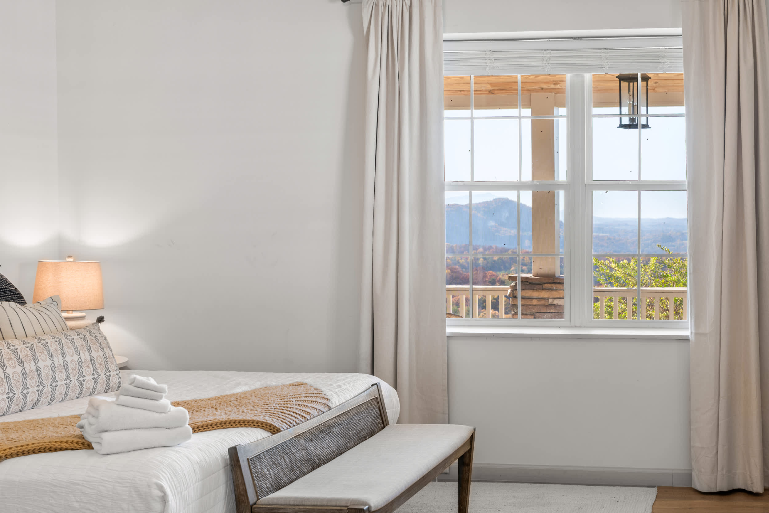At Roxy A, the spacious wraparound patio offers sweeping views of the mountainous countryside, perfect for sipping your morning coffee or soaking in the sunset with a relaxing glass of wine. A bubbling hot tub will ease the remainder of your cares away, while the above ground firepit will have you toasting up rounds of tasty treats under the vast canopy of stars. Indoors, enjoy surfing the channels or watching a movie in the living room while seated on the plush sofa, the gas fireplace providing a cozy ambiance in the cooler months. The kitchen showcases all-white appliances and cabinetry with metallic finishes, accompanied by spacious stone countertops for preparation and storage. Dine together at the formal table with seating for 6 or enjoy a more casual seat at the counter for snacks and hors d’oeuvres.