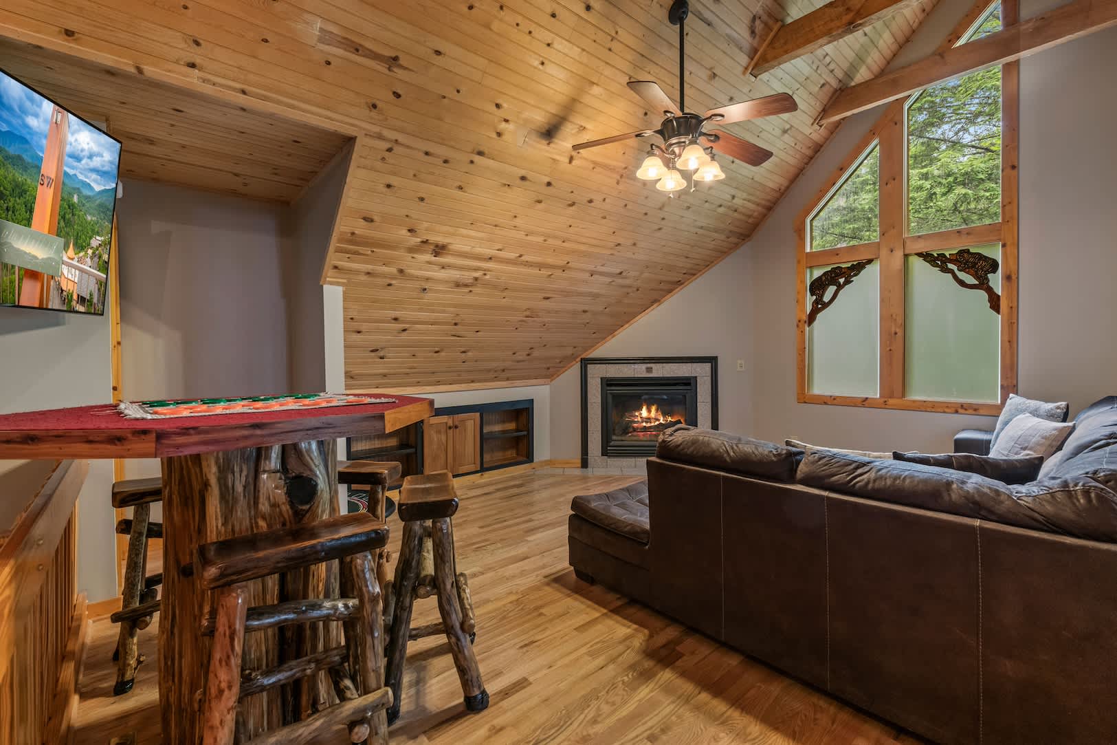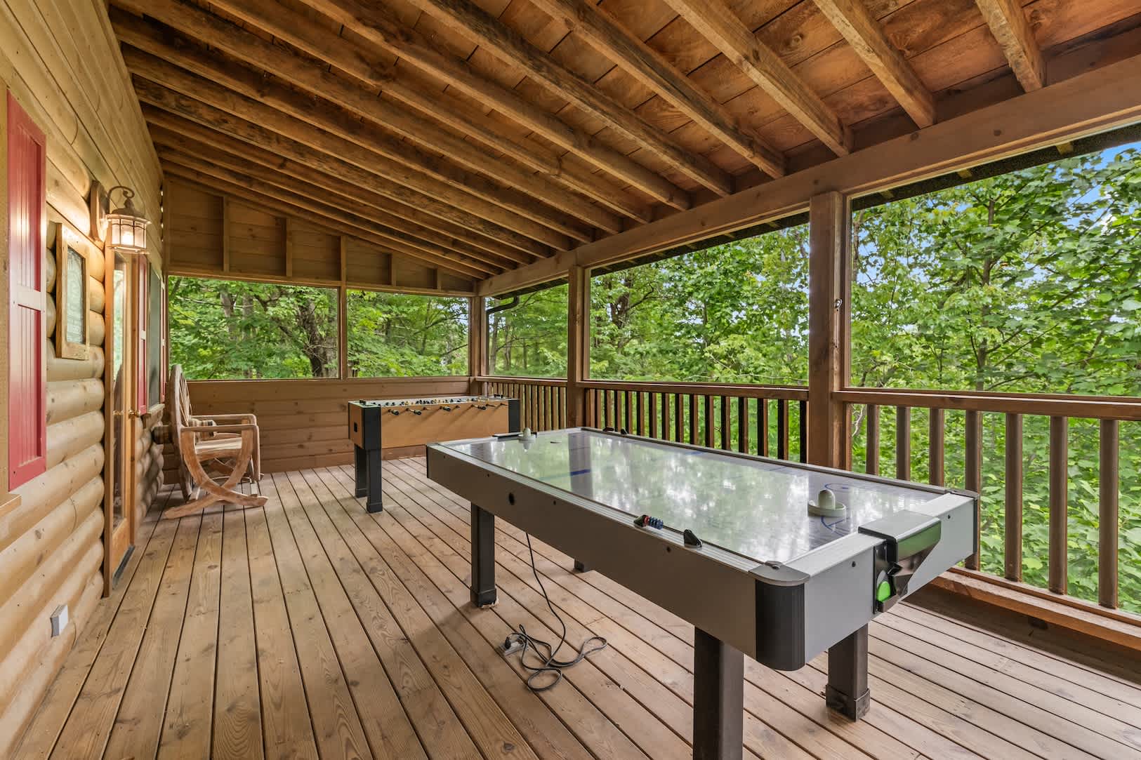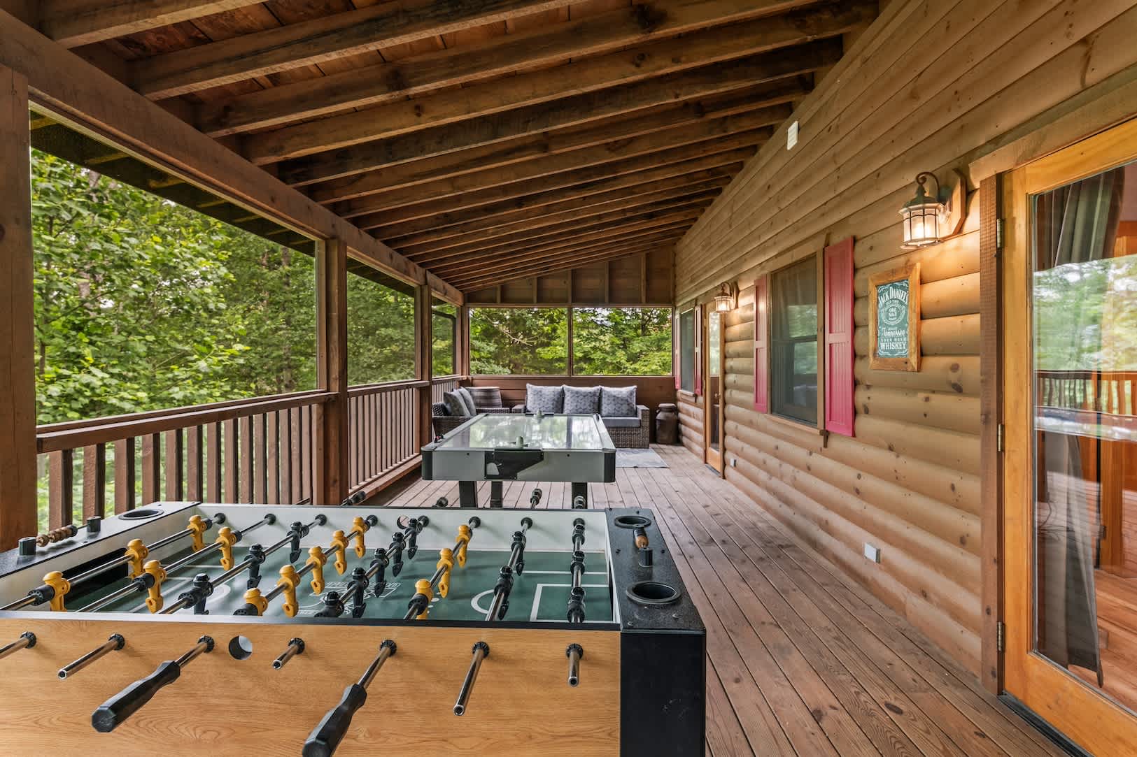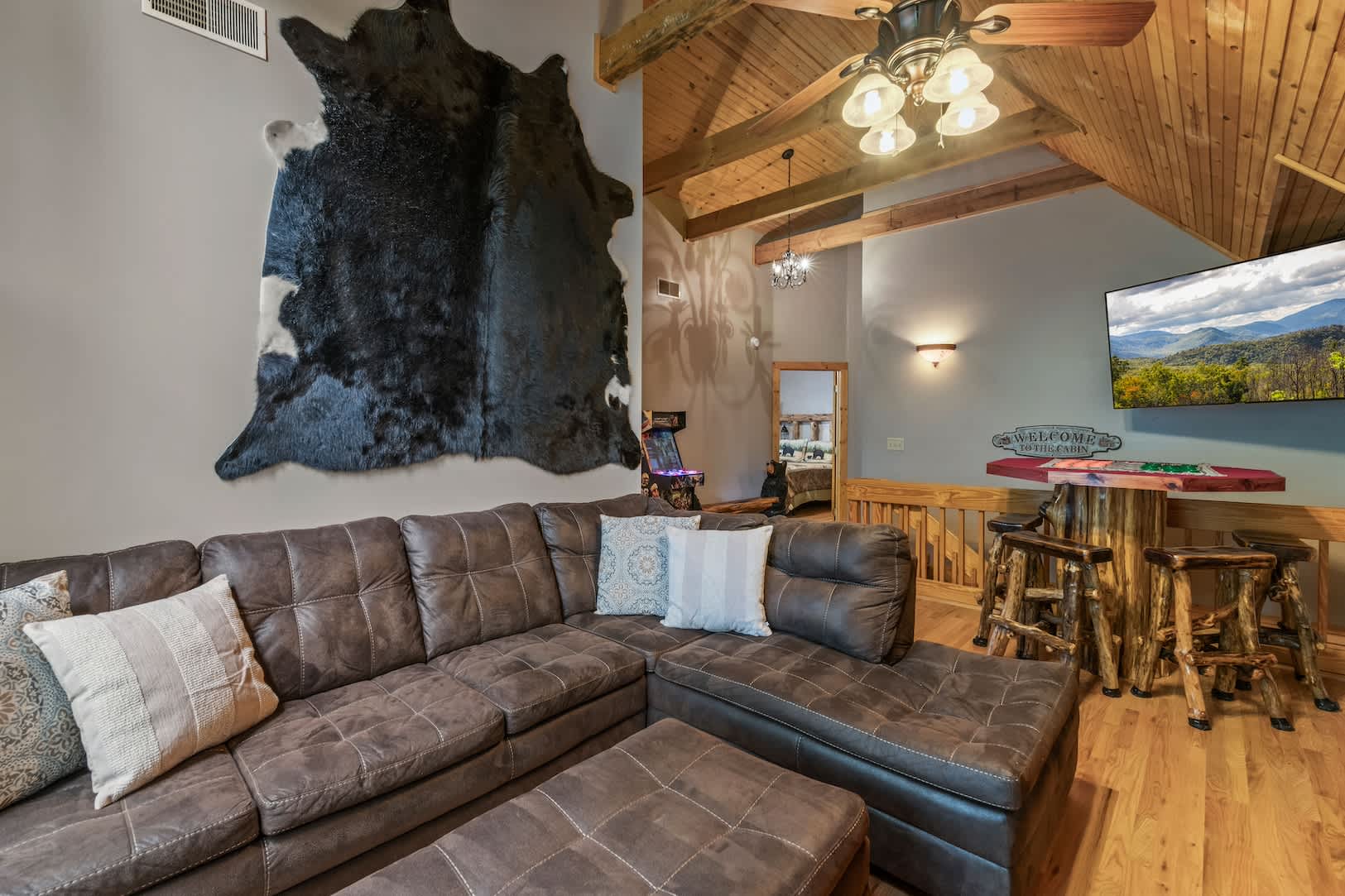Speaking of the deck, you’ll find each level well-equipped with exciting features. On the lower level, find your inner grill master and whip up a delicious, authentic southern barbeque for the whole family, or spend your evening soaking all your cares away in the bubbling hot tub with a refreshing cocktail in hand. On the upper level, hours of adrenaline await between the foosball and air hockey tables, or you can cheer on the fun from the comfortable outdoor sofa seating. Back inside, the fun continues in the game room featuring a card table and an additional living area with smart TV and fireplace.