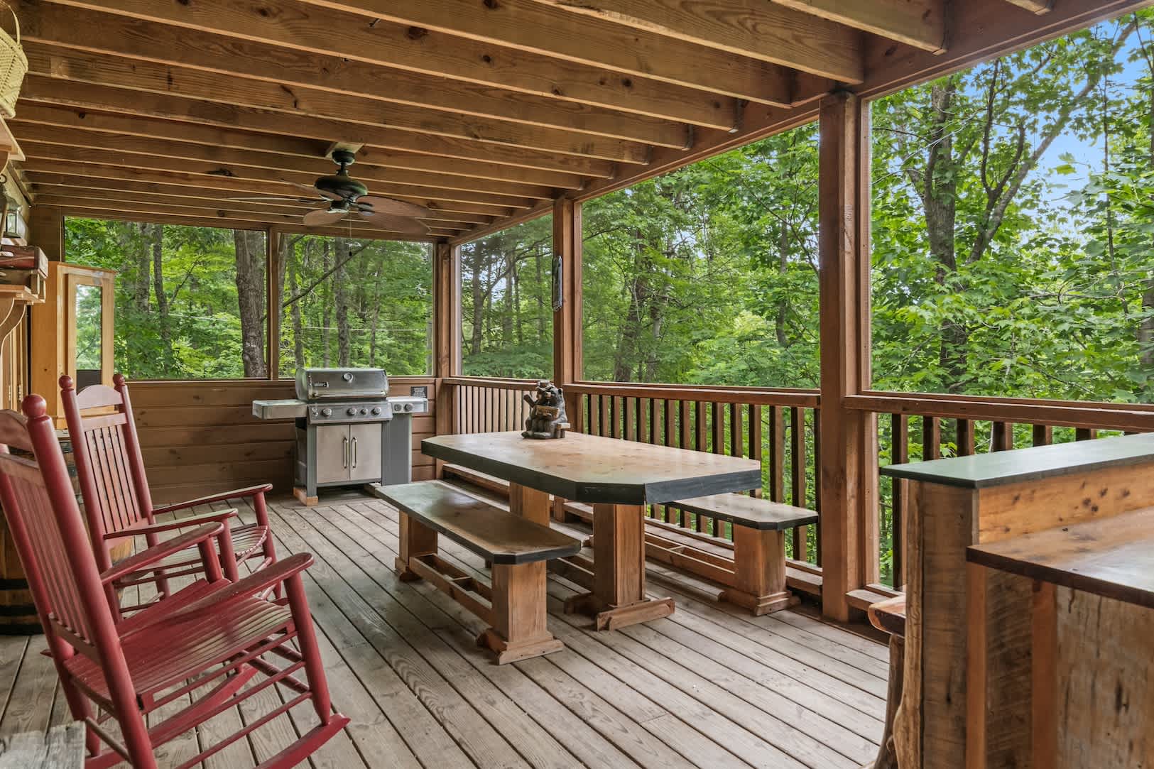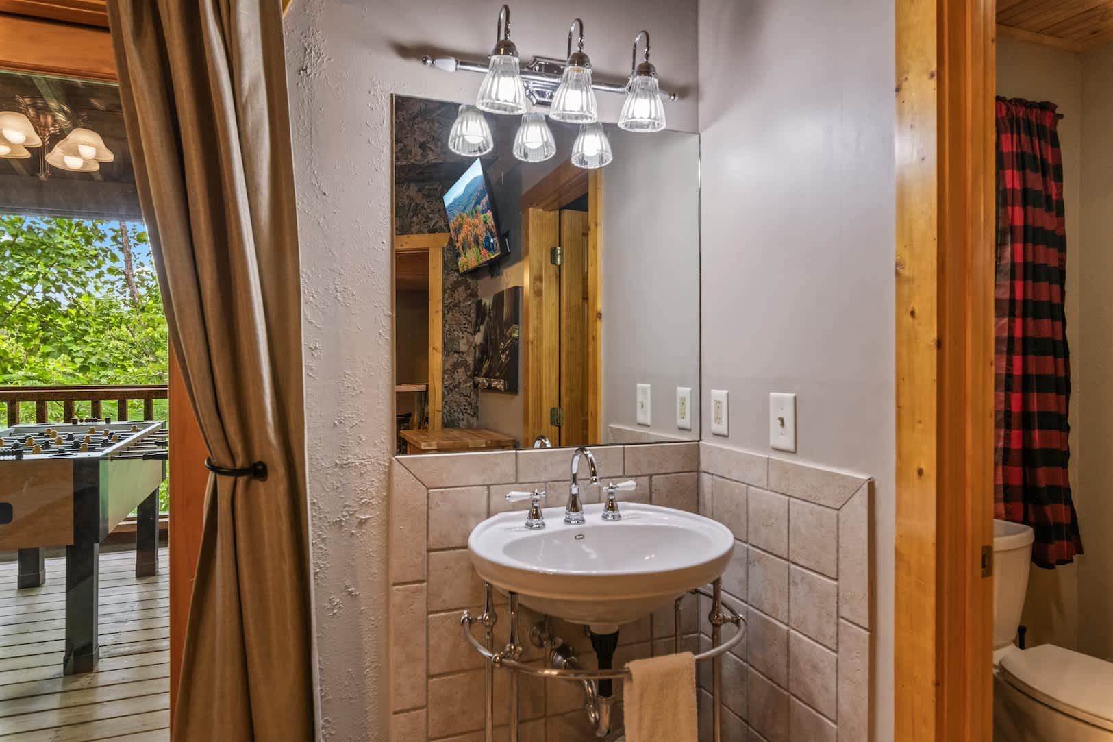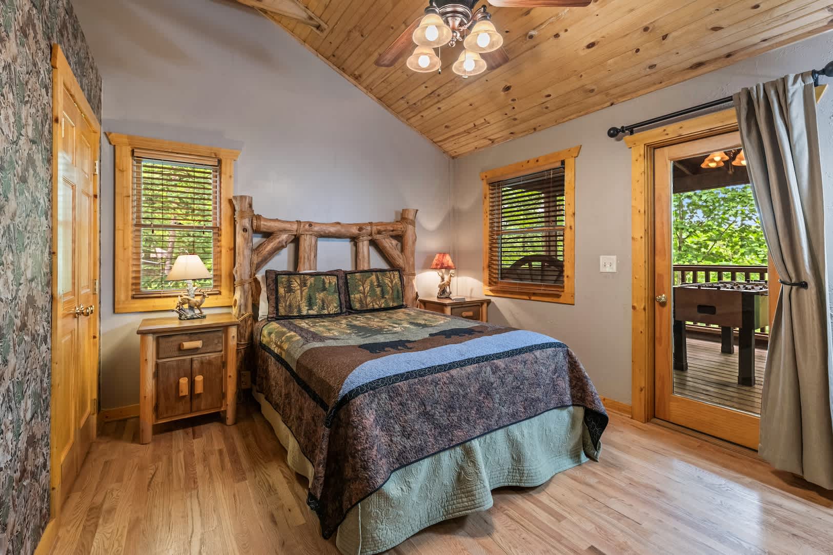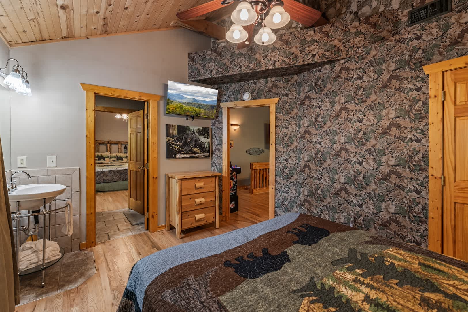 Speaking of the deck, you’ll find each level well-equipped with exciting features. On the lower level, find your inner grill master and whip up a delicious, authentic southern barbeque for the whole family, or spend your evening soaking all your cares away in the bubbling hot tub with a refreshing cocktail in hand. On the upper level, hours of adrenaline await between the foosball and air hockey tables, or you can cheer on the fun from the comfortable outdoor sofa seating. Back inside, the fun continues in the game room featuring a card table and an additional living area with smart TV and fireplace.