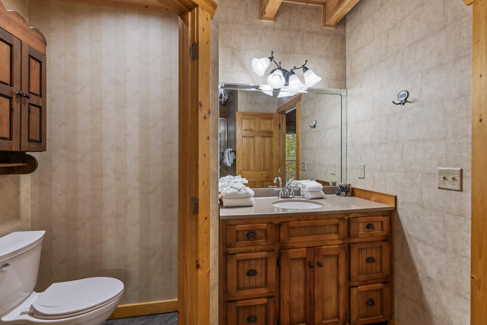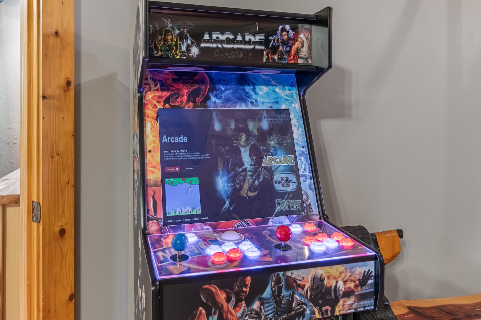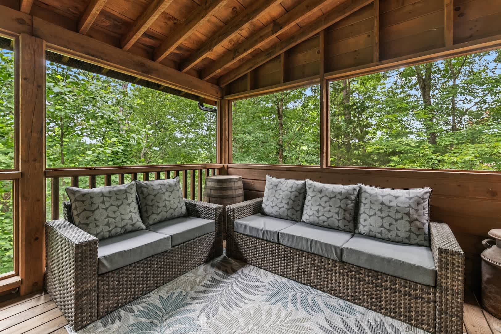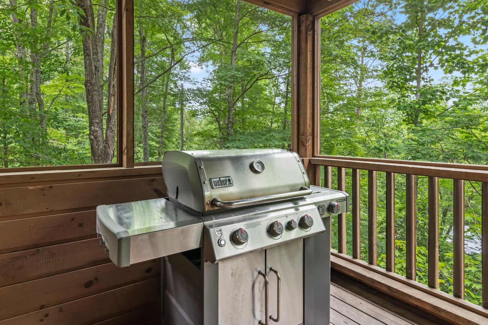 Speaking of the deck, you’ll find each level well-equipped with exciting features. On the lower level, find your inner grill master and whip up a delicious, authentic southern barbeque for the whole family, or spend your evening soaking all your cares away in the bubbling hot tub with a refreshing cocktail in hand. On the upper level, hours of adrenaline await between the foosball and air hockey tables, or you can cheer on the fun from the comfortable outdoor sofa seating. Back inside, the fun continues in the game room featuring a card table and an additional living area with smart TV and fireplace.