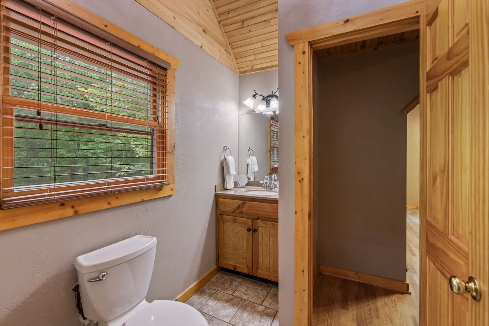At this coveted log cabin home, peace and serenity are in abundance, a tranquil escape from the hustle and bustle of everyday life. The wood-forward interior blends seamlessly with the exterior’s forested surroundings, creating warm spaces that promote connectivity and catching up with loved ones. Sink into plush leather sofa seating in the living room while you stream all your favorite shows and movies, the gas fireplace keeping you warm and toasty during the cooler months. Steps away, the stylish kitchen showcases stainless steel appliances alongside plentiful counterspace and cabinetry for preparing meals both large and light. Dine together at the elegant wood table with bench-style seating, or head outdoors to the deck to enjoy your meal al fresco among the fresh forest air.