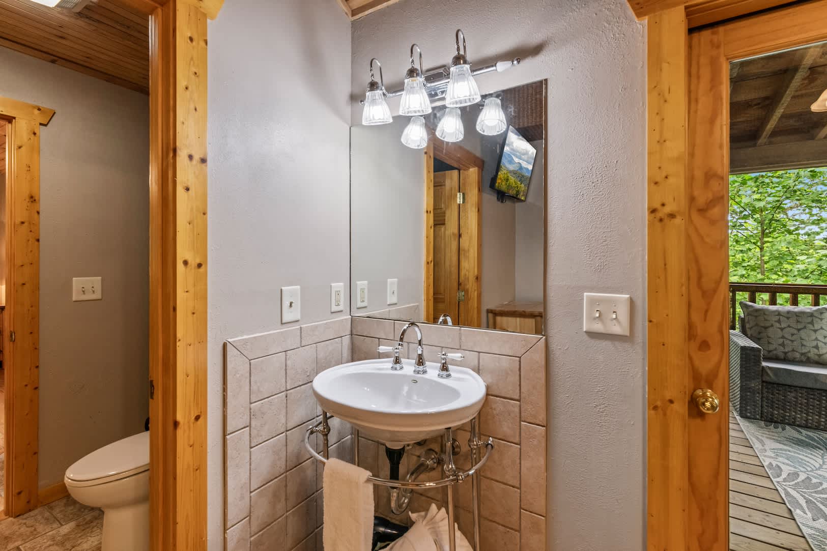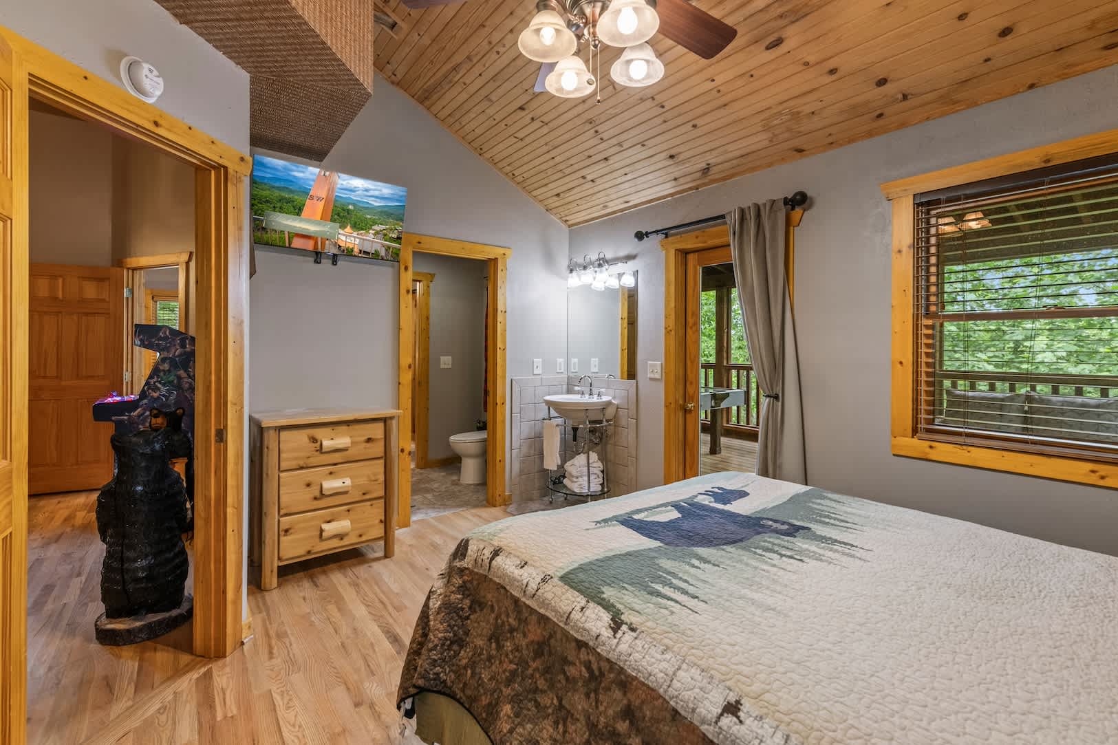 Bedroom #4 includes a queen size bed, smart TV, deck access, pedestal sink, and Jack & Jill bathroom shared with bedroom #3 with a shower/tub combo.