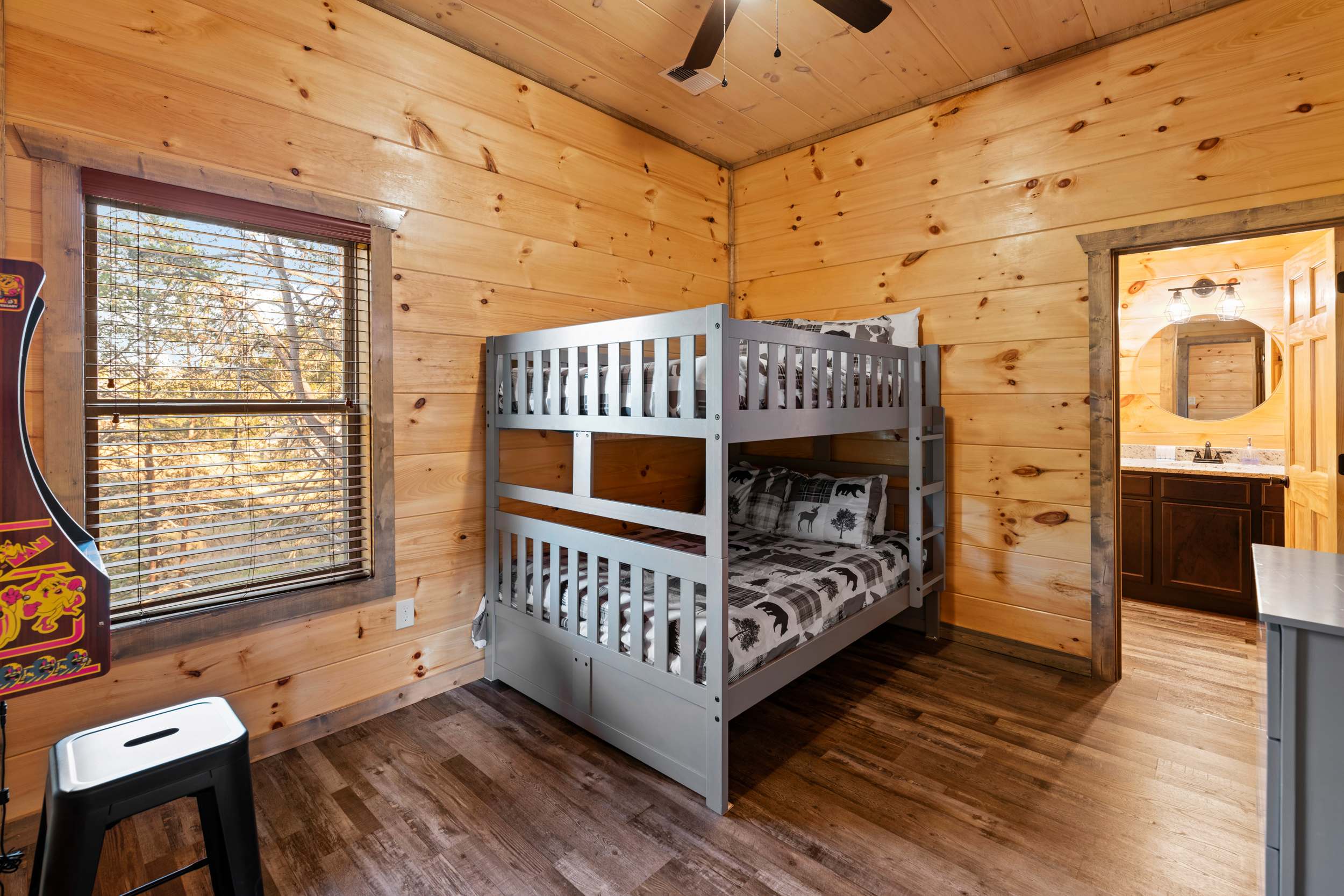 • Bedroom 3: Full-over-full bunk bed, smart TV, and ensuite bathroom with single vanity and shower/tub combo; sleeps up to 4