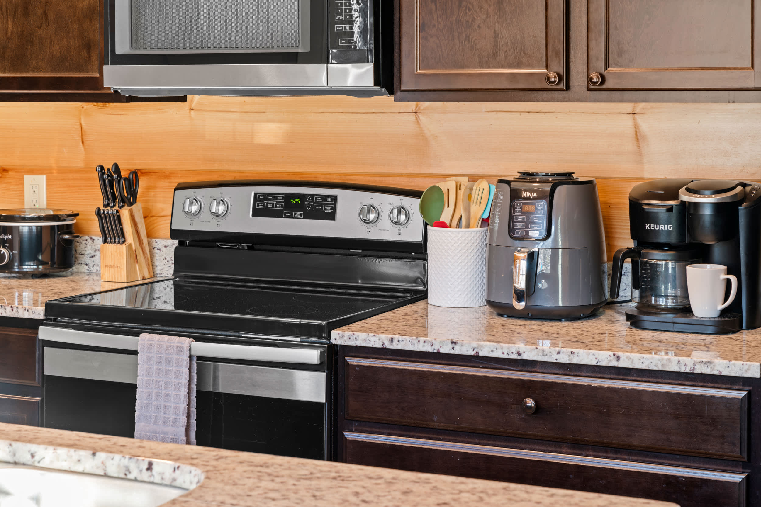 Head outside for a soak in the hot tub or fire up the outdoor BBQ grill for simple evening meals. Inside, you’ll find multiple smart TVs (one in each bedroom), a laptop-friendly workspace for checking in with the office, and an in-home washer and dryer to keep gear fresh between adventures. A private pool adds an extra dose of resort-style fun right at home.