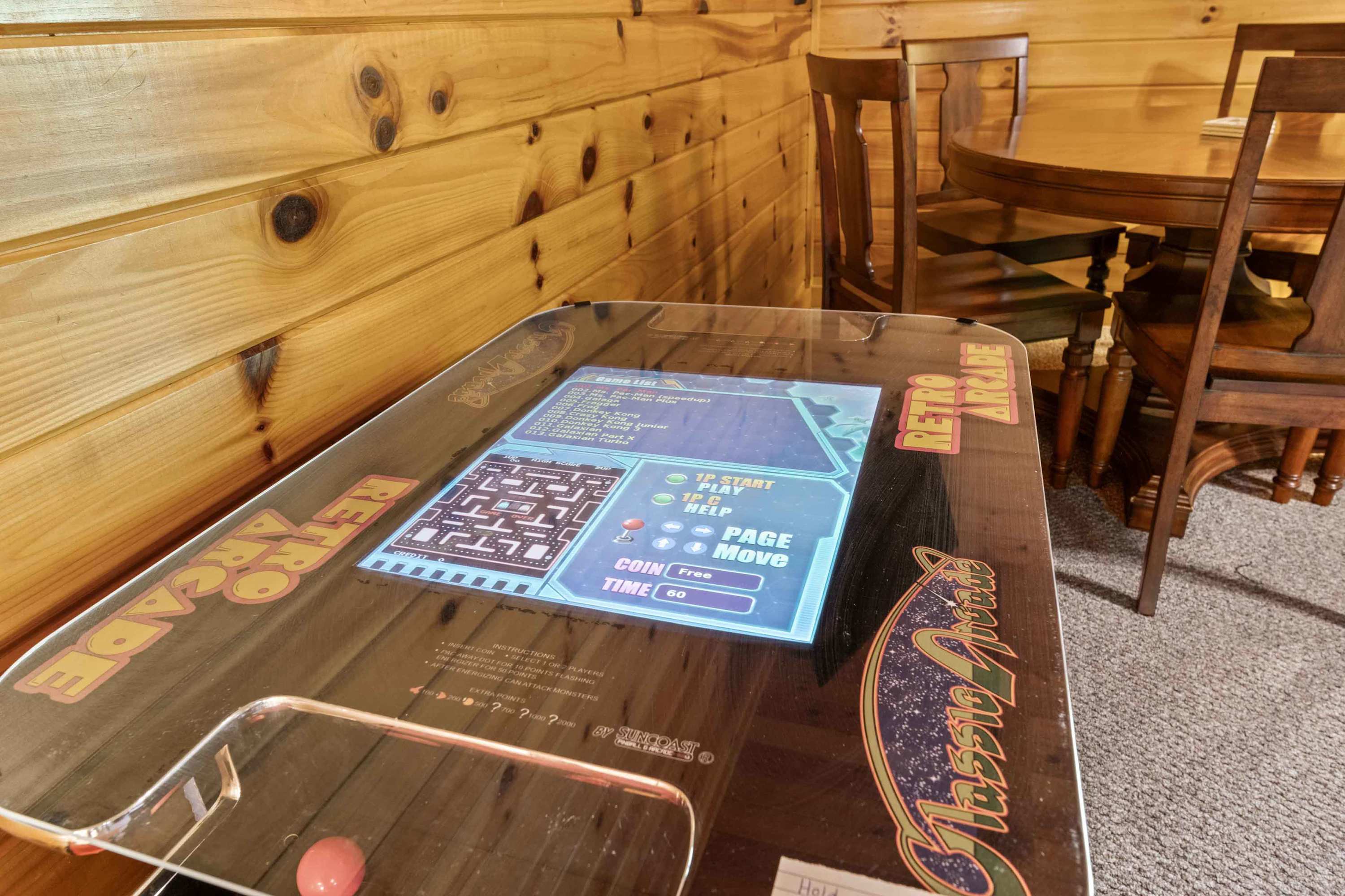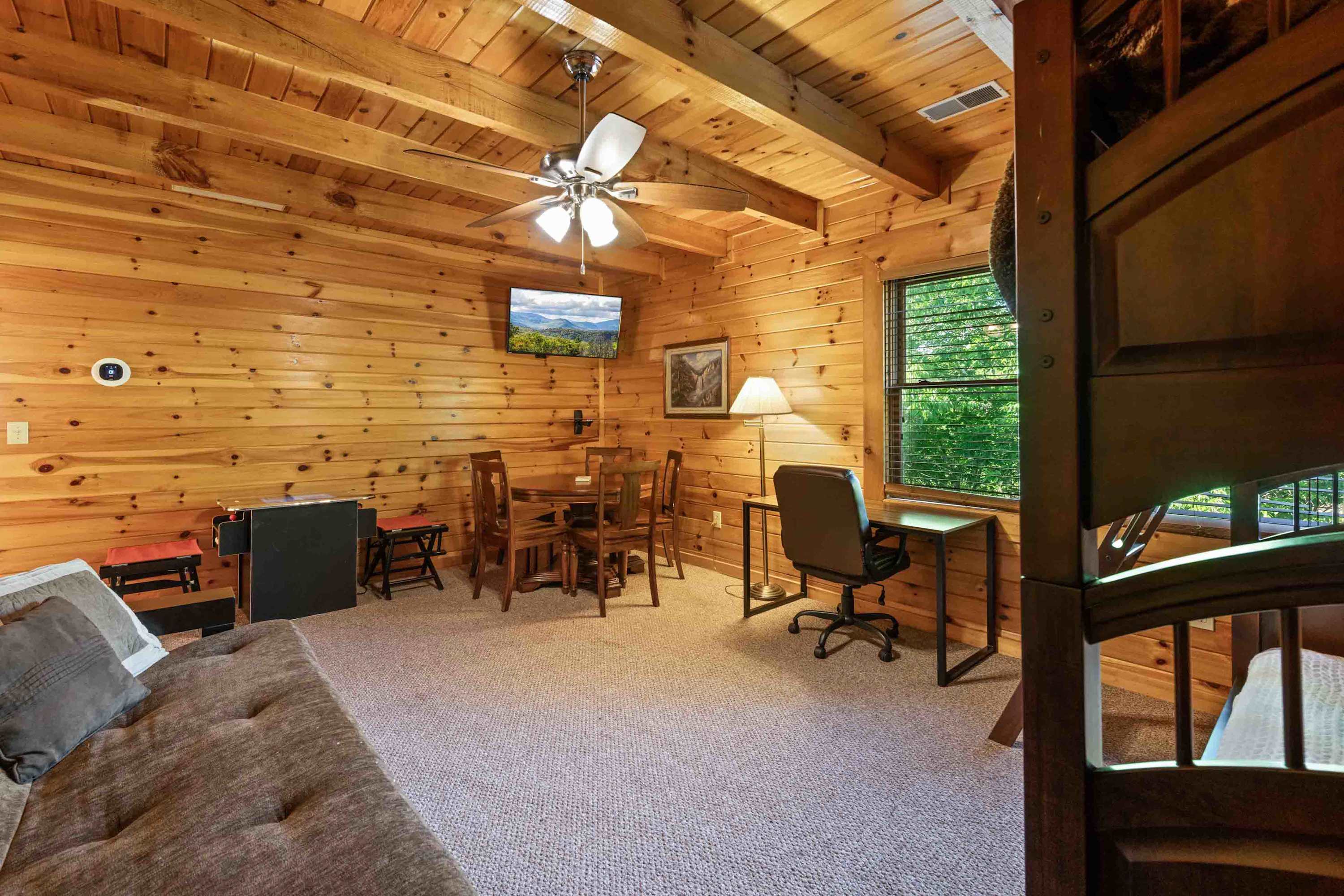 The loft includes a twin-over-twin bunk bed, queen size futon, smart TV, card table, and Pac-Man tabletop arcade game.