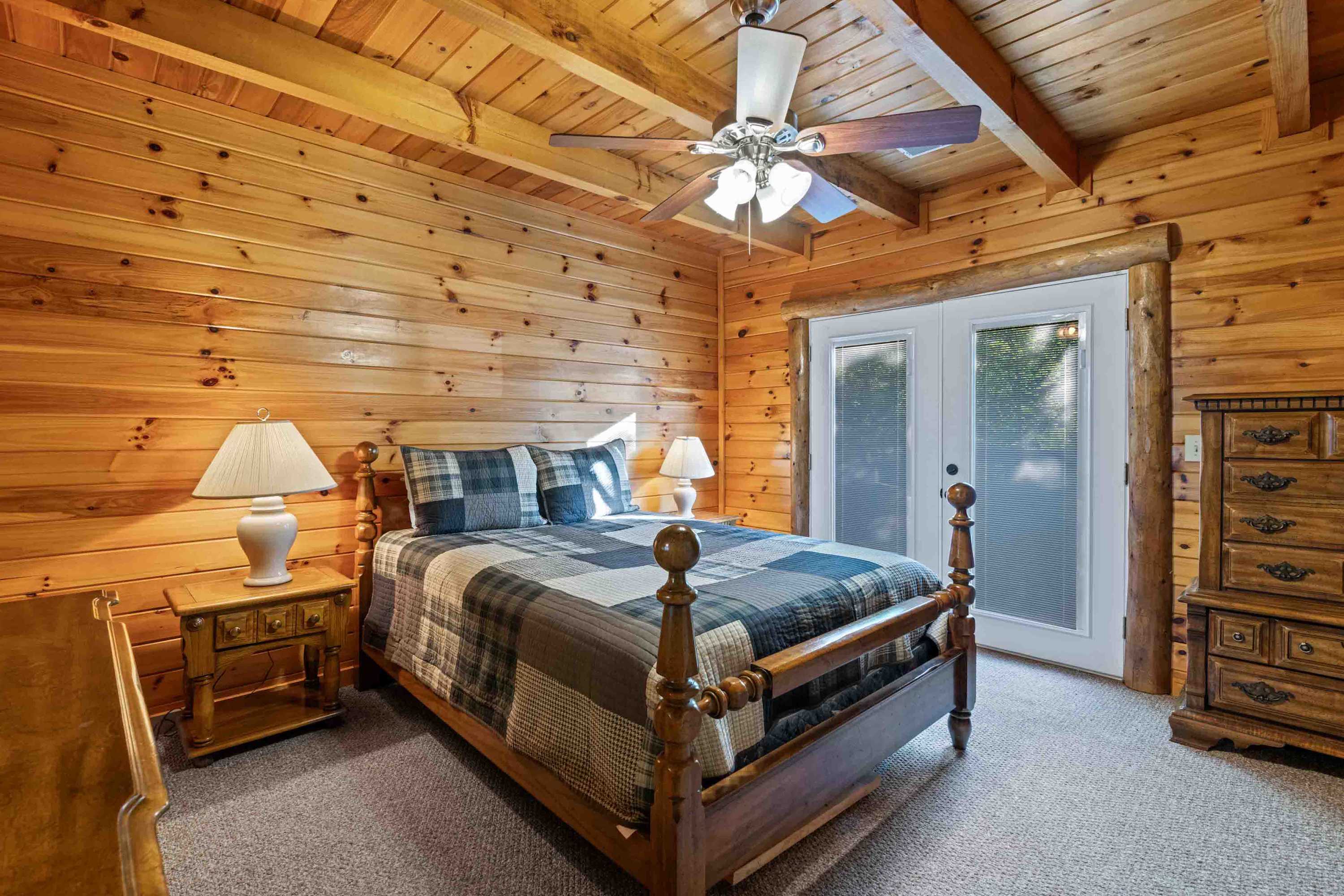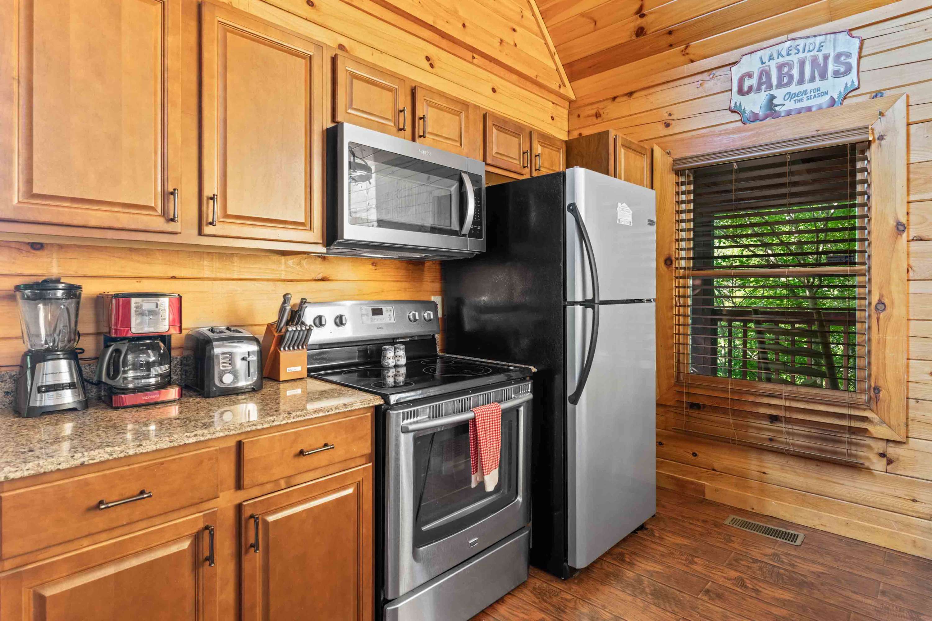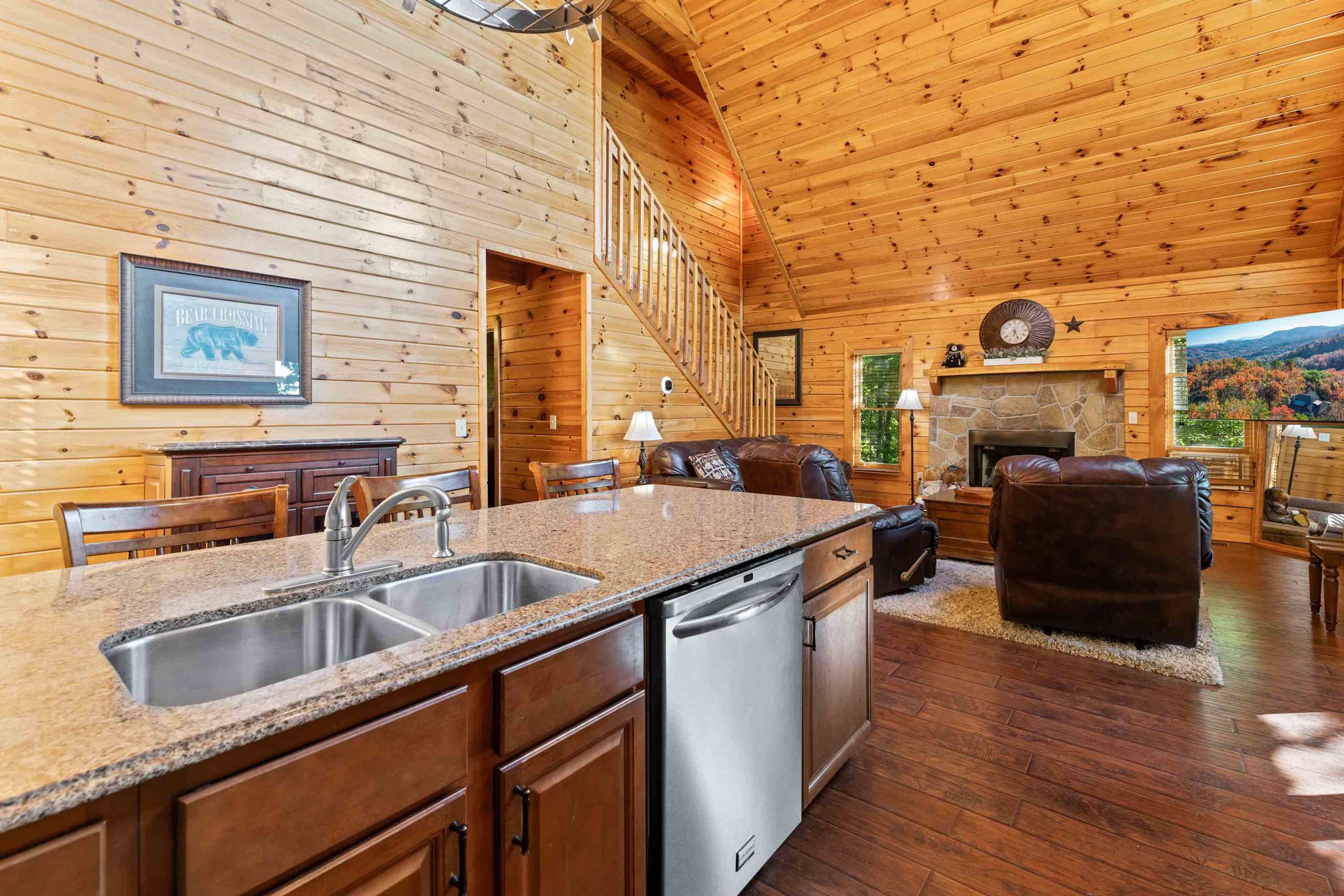 The home’s cabin-chic interior showcases soaring vaulted ceilings sitting atop open spaces illuminated in natural light. Sink into plush living room sofa and recliner seating while you queue up a movie or your favorite shows on the large, mounted smart TV. Steps away, the fully equipped kitchen has everything you need to whip up delicious meals in the convenience of home, with full-sized appliances, glossy stone countertops, and ample cabinetry stocked with cookware and dining ware. High-top stool seating at the island is perfect for quick and casual bites or dining on formal meals alike.