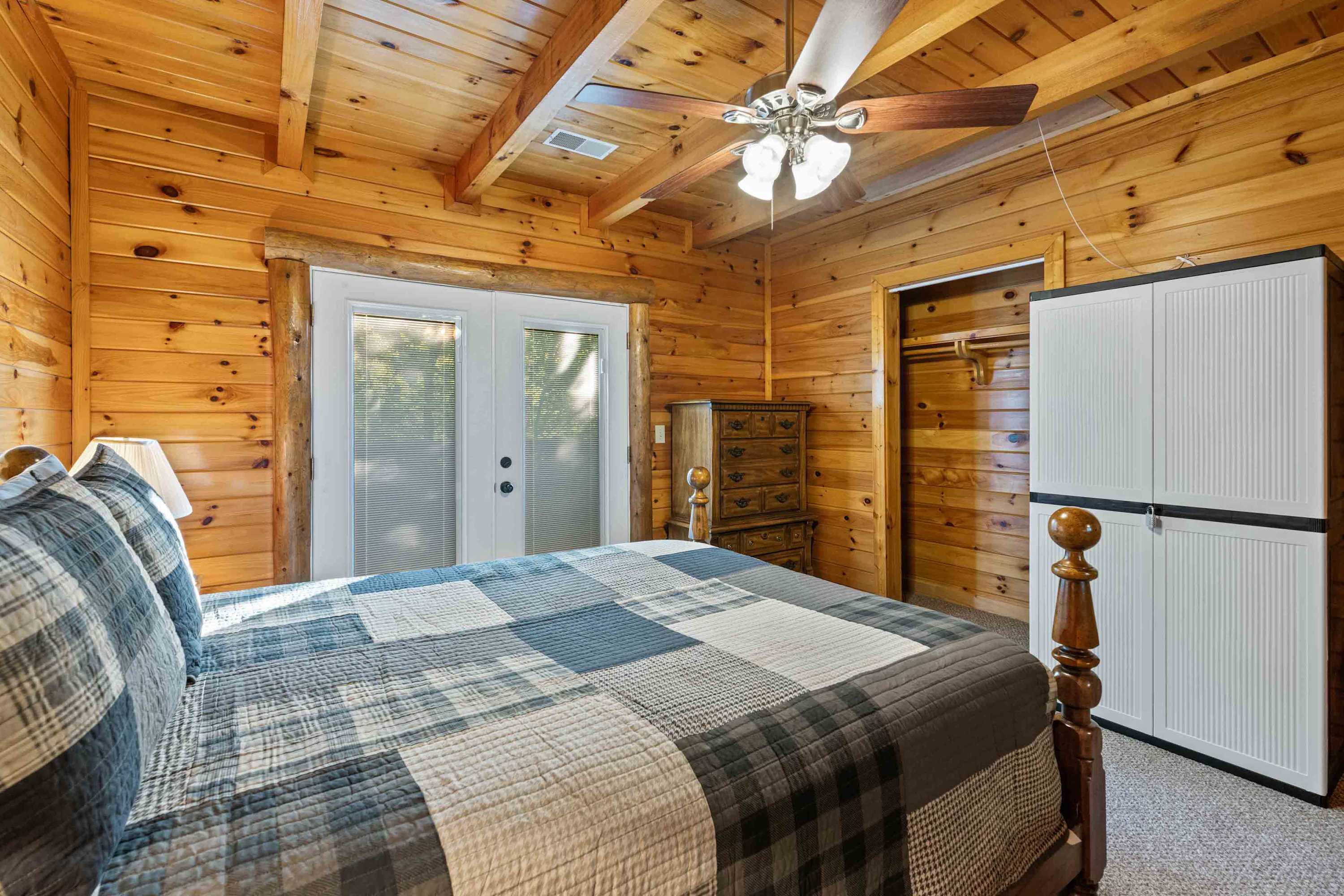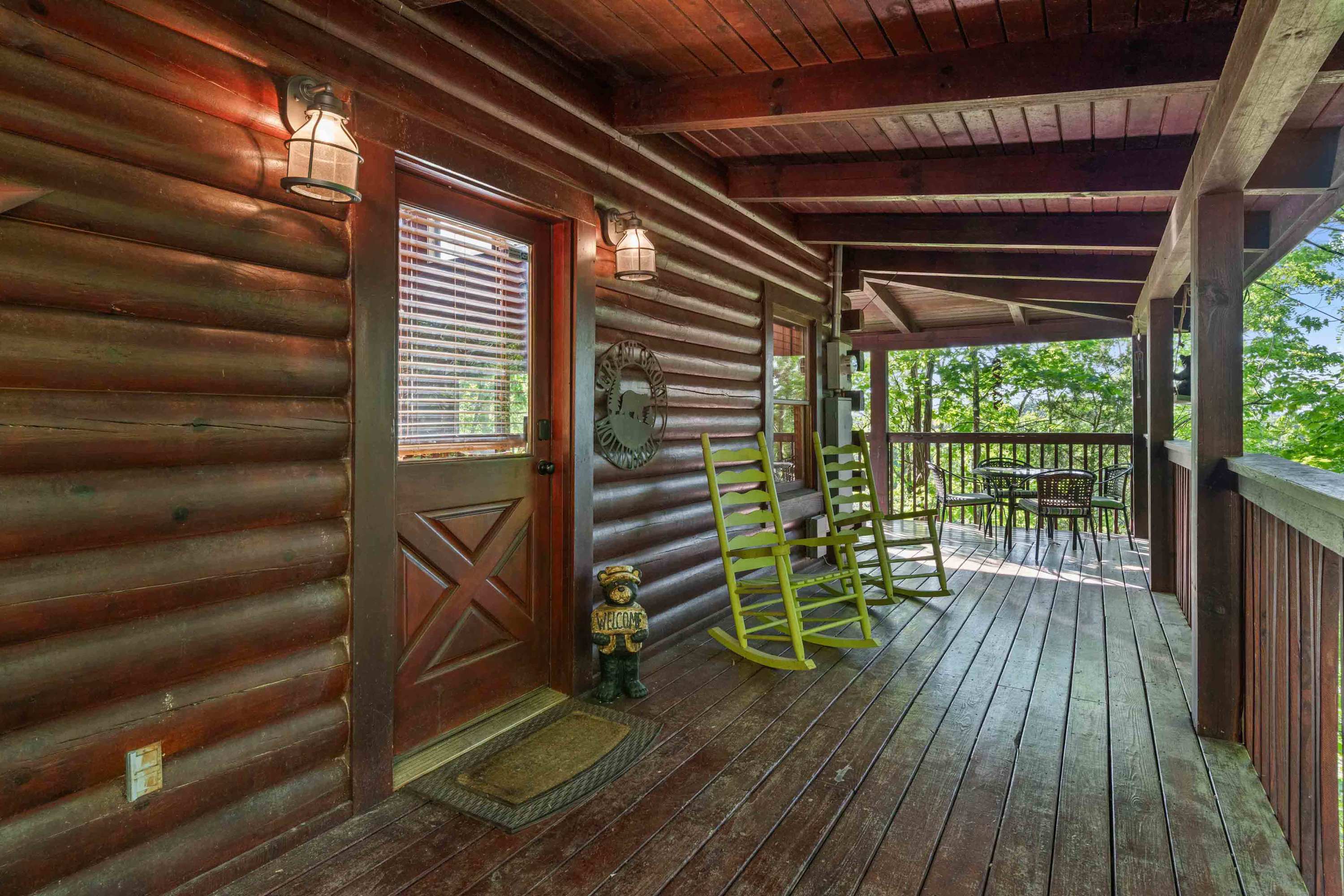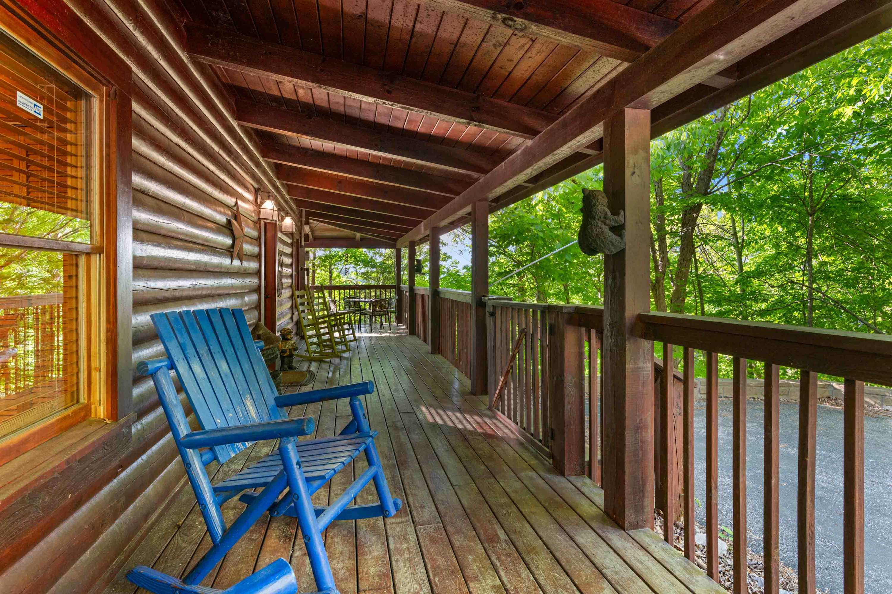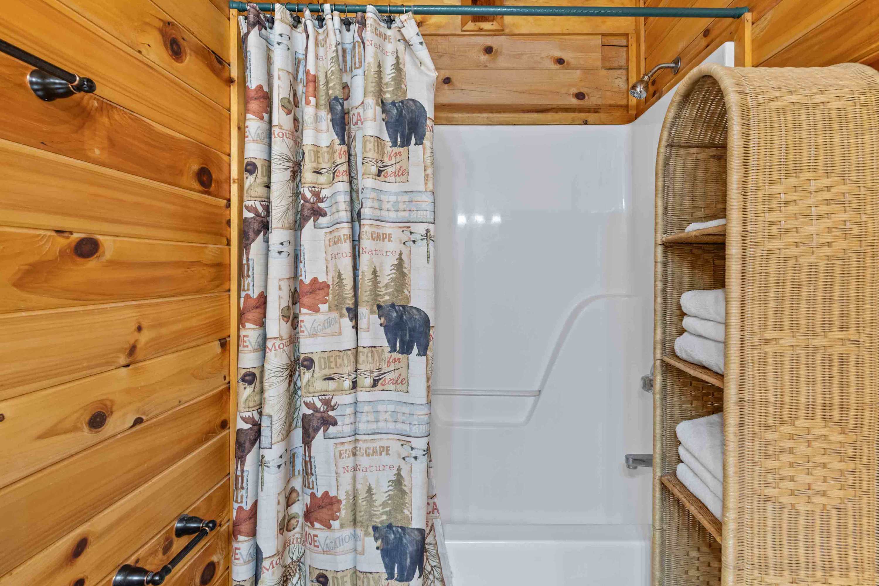 The home’s cabin-chic interior showcases soaring vaulted ceilings sitting atop open spaces illuminated in natural light. Sink into plush living room sofa and recliner seating while you queue up a movie or your favorite shows on the large, mounted smart TV. Steps away, the fully equipped kitchen has everything you need to whip up delicious meals in the convenience of home, with full-sized appliances, glossy stone countertops, and ample cabinetry stocked with cookware and dining ware. High-top stool seating at the island is perfect for quick and casual bites or dining on formal meals alike.