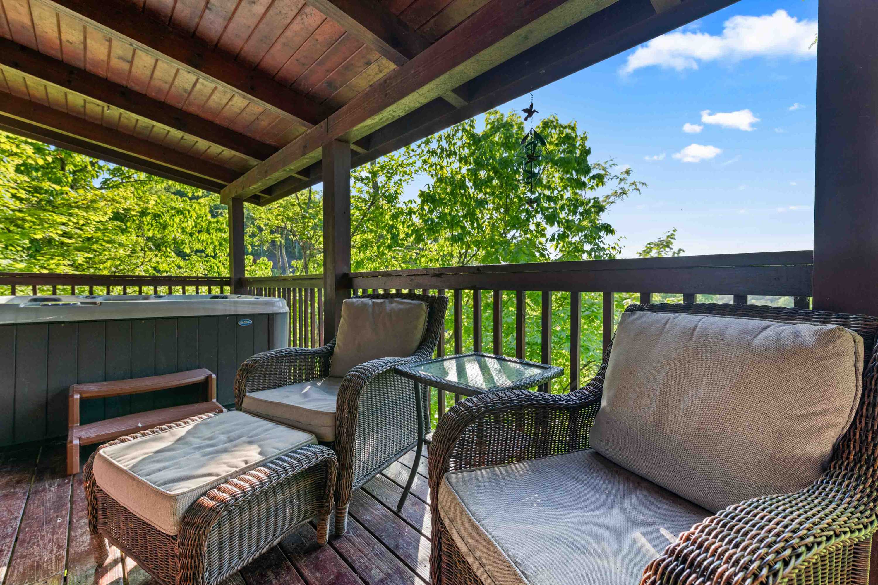 Nestled in a secluded haven, the home provides views of the lake and forested surroundings, where the shimmering waters meet lush greenery. Imagine waking up to the soothing sounds of nature, with the sun gently casting its golden hues across the water, inviting you to embrace the day. Out on the home’s deck, comfortable outdoor seating provides quiet spaces for turning the pages of a good book, enjoying casual conversation with friends, or whipping up a delicious barbeque lunch on the grill. The private hot tub will help soak your remaining cares away at the end of long days as you sip on a refreshing cocktail.