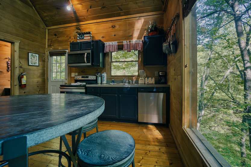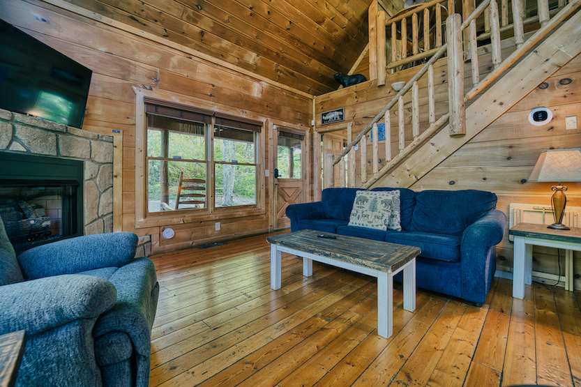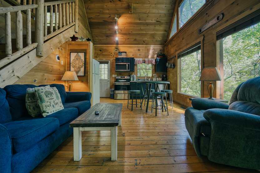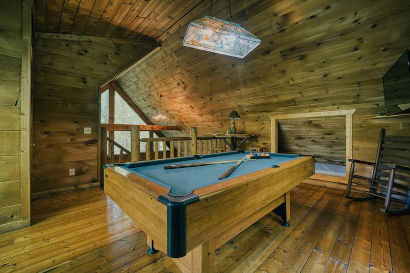 The home’s cozy, quintessential cabin interior showcases soaring wood ceilings, large picture windows filling the space in abundant natural light, and comfortable furnishings waiting to welcome you home at the end of long days of exploration. Sink into plush sofa or recliner seating while you catch up on episodes of your favorite shows on the smart TV, a fireplace nearby to keep you warm during cooler months. The open floorplan leads you right into the well-equipped kitchen where whipping up homecooked meals is a breeze between the full-sized appliances and ample cabinetry stocked with cookware and dining ware. Take a seat at the high-top table for dining or a quick game of cards while you work up an appetite. For bigger stakes, the loft offers a pool table where the shark in you can tap into your competitive side.