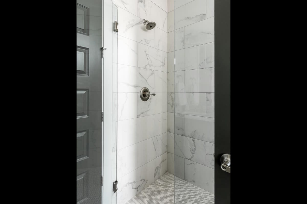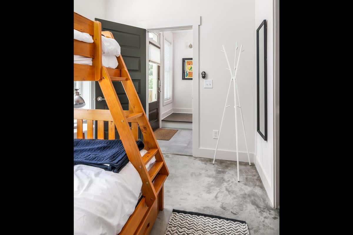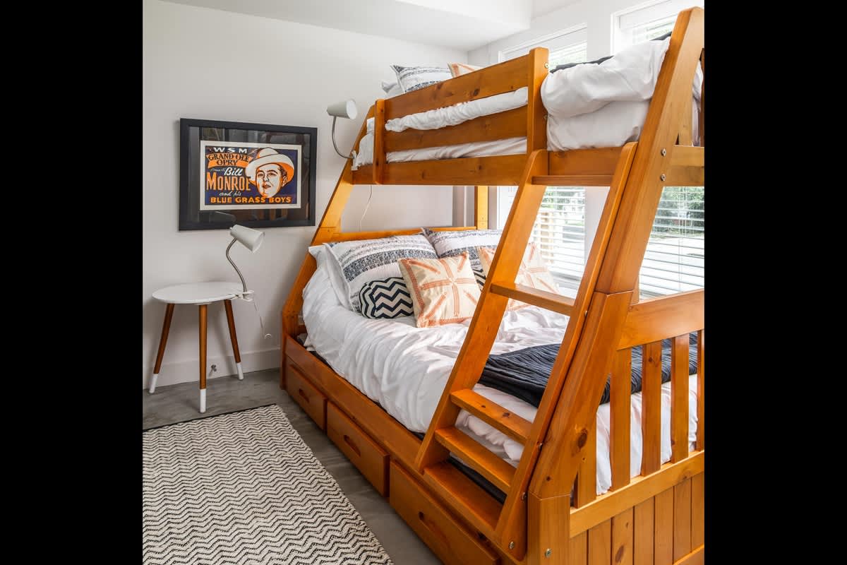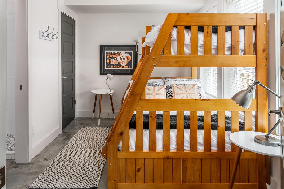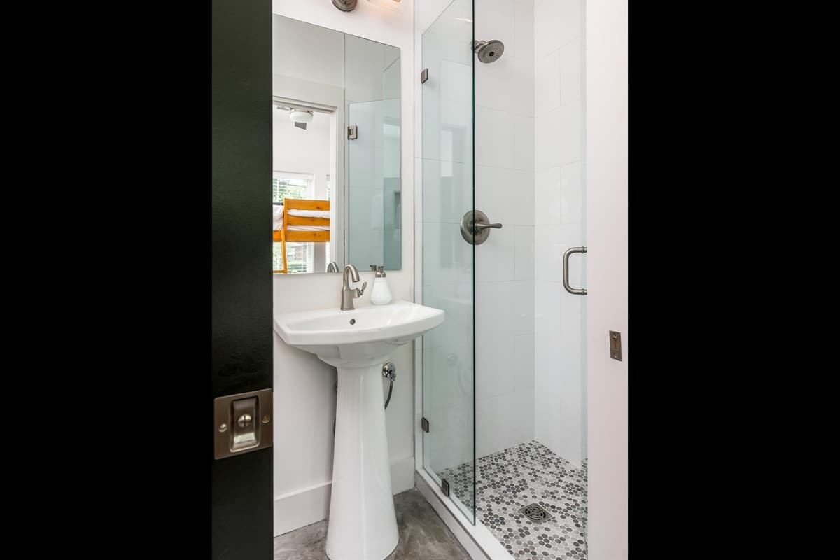 Bedroom #1 is located on the ground floor and has a Twin-over-Full bunk bed. Steps away, there’s a full bathroom with a pedestal sink and tile standing shower.
