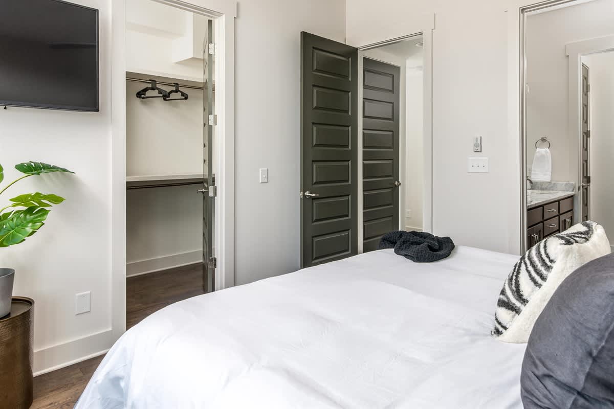 Bedroom #2 is located on the third floor and offers a Queen bed, closet, smart TV, and private bathroom with shower/tub combo.
