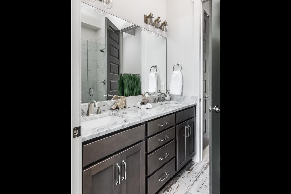 Bedroom #3, the master bedroom, is also located on the third floor and has a King bed, smart TV, walk-in closet, and en-suite. The en-suite boasts a double vanity and a standing shower with custom tilework.