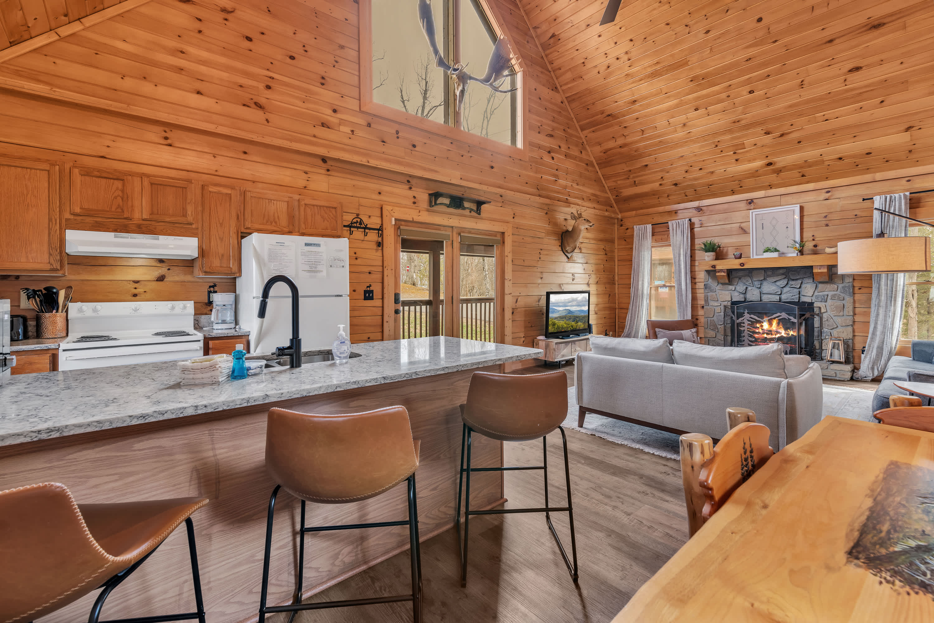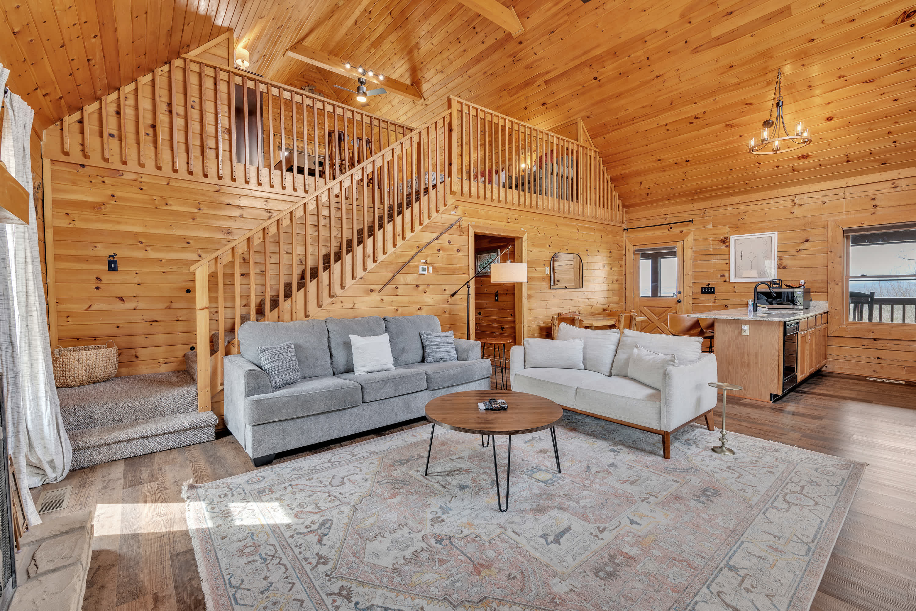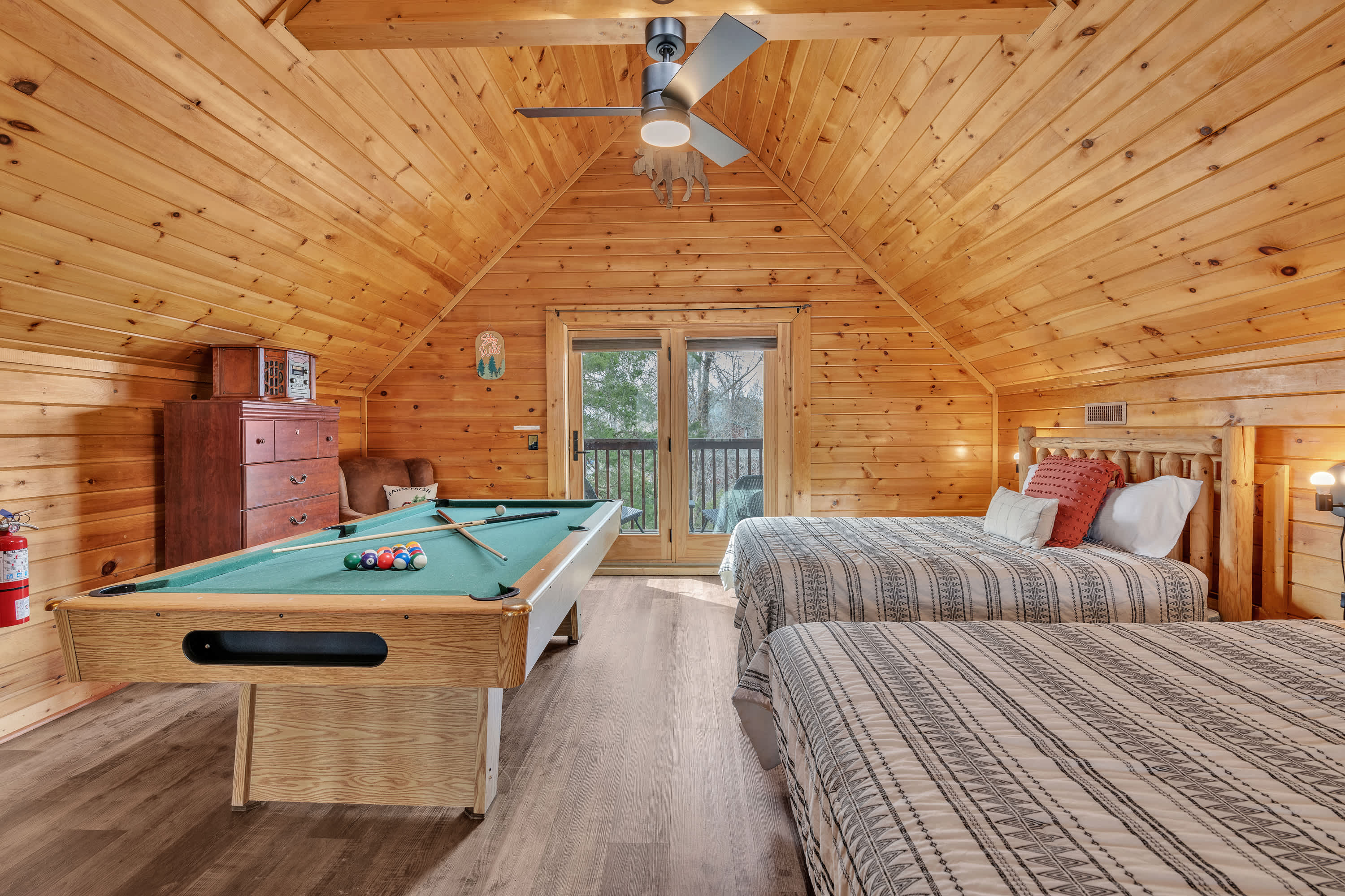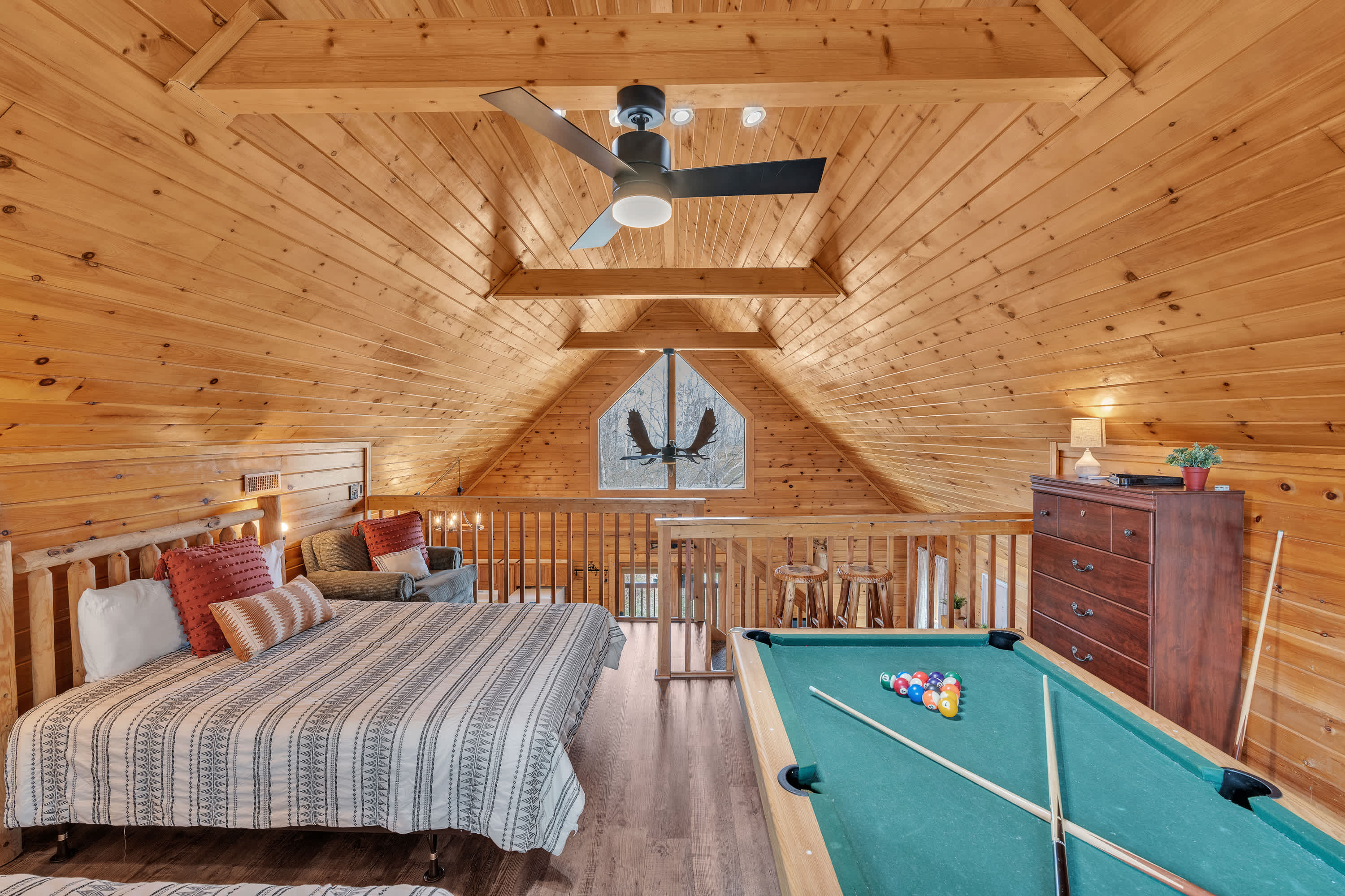The home’s charming interior offers quintessential log cabin vibes, with warm wood accents organically blending one room to the next. The contemporary furnishings and elegant décor are a welcome contrast to the rustic elements, offering spaces designed for connection and relaxation. Curl up on plush living room sofa seating as you settle in for a family movie night – just don’t forget the popcorn! Steps away, the well-equipped kitchen has everything you need to whip up convenient meals right at home, with ample counterspace and cabinetry for preparation and storage. Grab a high-top stool for 3 at the counter to nosh on a spread of afternoon appetizers or gather the group for formal meals at the all-wood dining room table with seating for 4. Pool sharks will find their happy place in the loft, where a full-sized table provide endless hours of competitive fun.