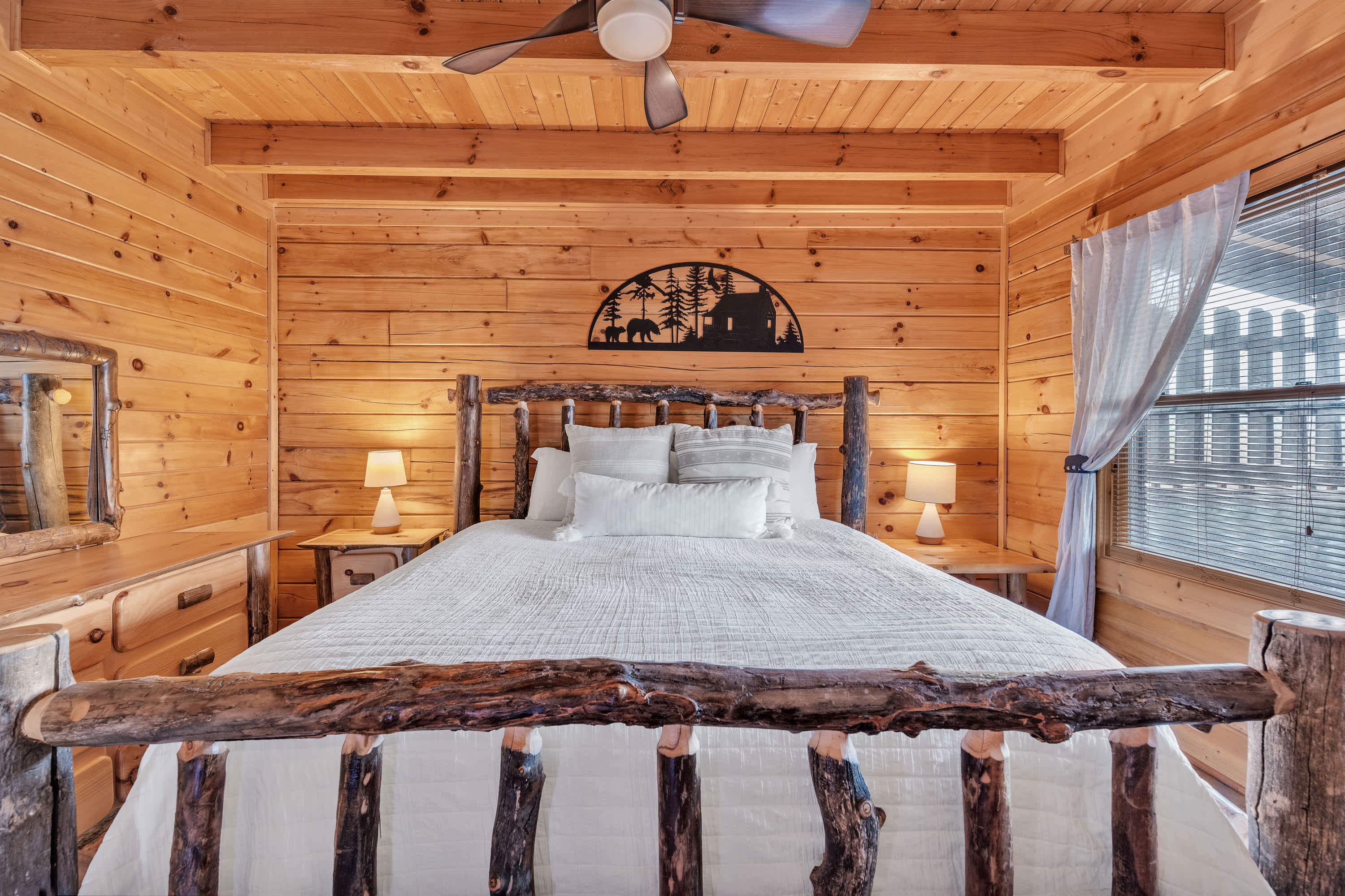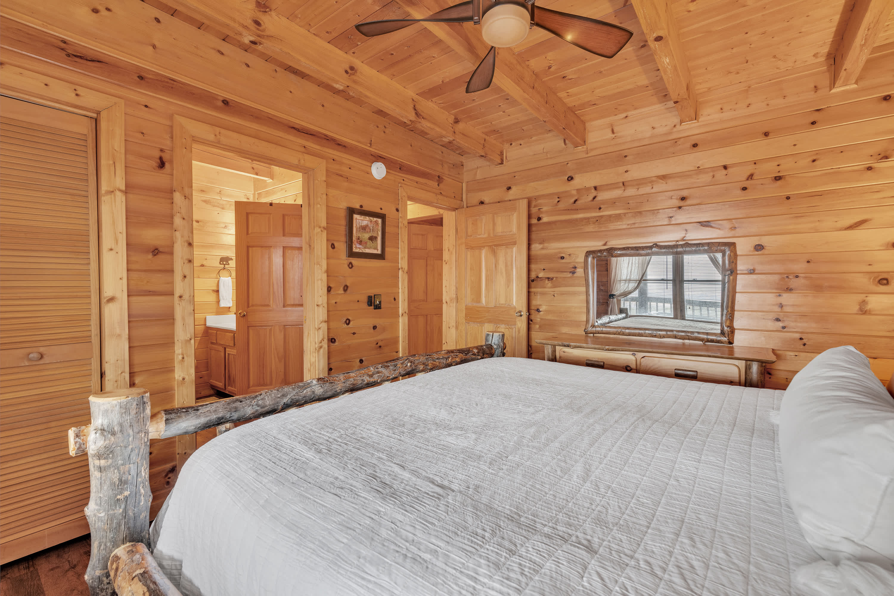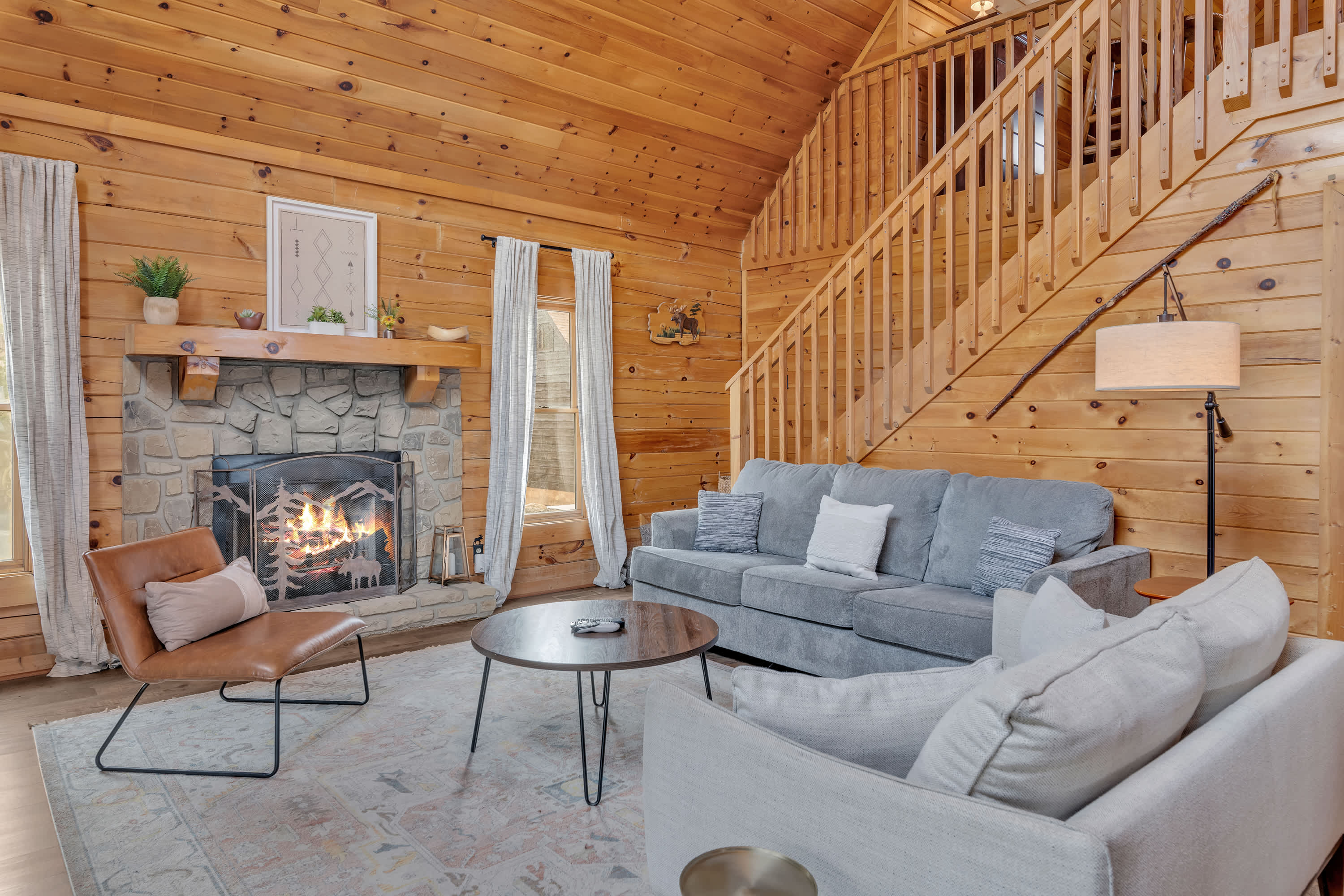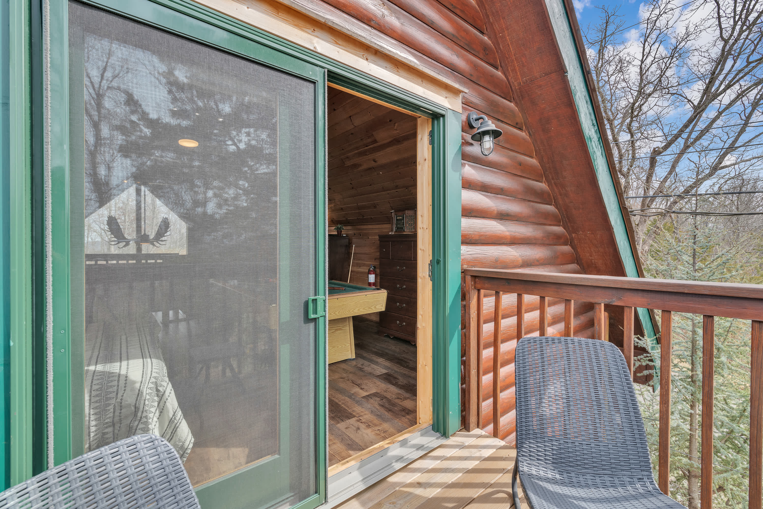 The home’s charming interior offers quintessential log cabin vibes, with warm wood accents organically blending one room to the next. The contemporary furnishings and elegant décor are a welcome contrast to the rustic elements, offering spaces designed for connection and relaxation. Curl up on plush living room sofa seating as you settle in for a family movie night – just don’t forget the popcorn! Steps away, the well-equipped kitchen has everything you need to whip up convenient meals right at home, with ample counterspace and cabinetry for preparation and storage. Grab a high-top stool for 3 at the counter to nosh on a spread of afternoon appetizers or gather the group for formal meals at the all-wood dining room table with seating for 4. Pool sharks will find their happy place in the loft, where a full-sized table provide endless hours of competitive fun.