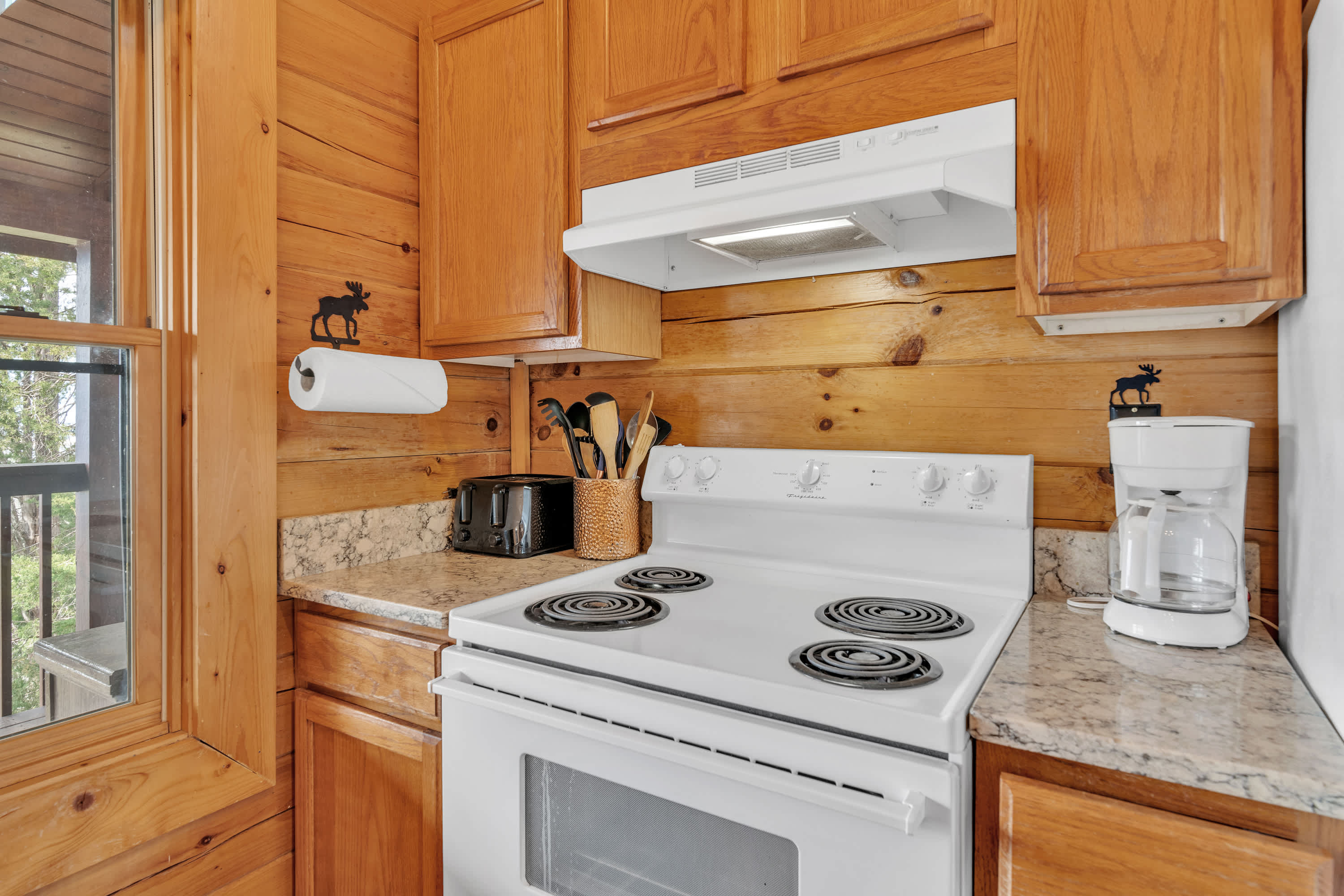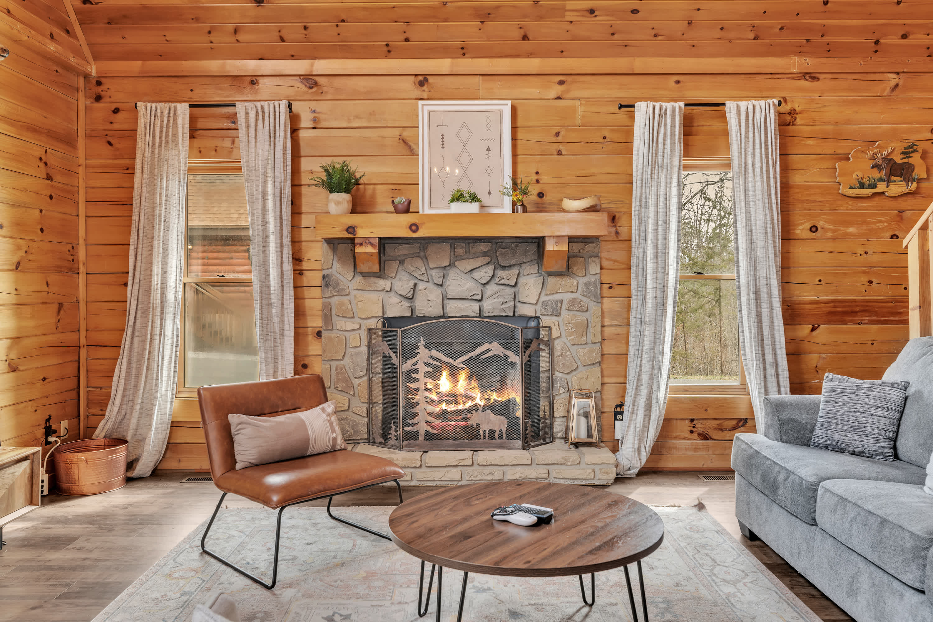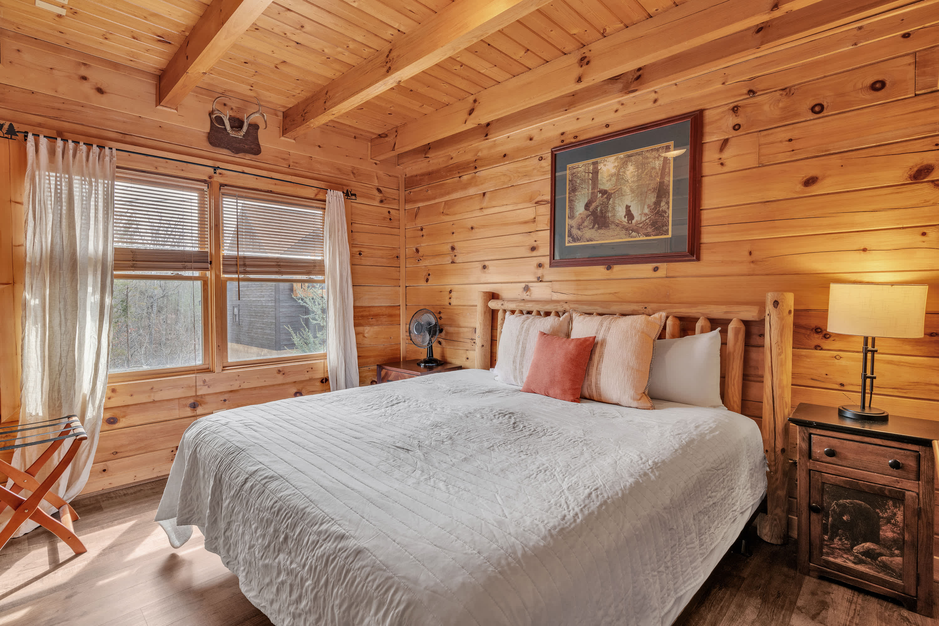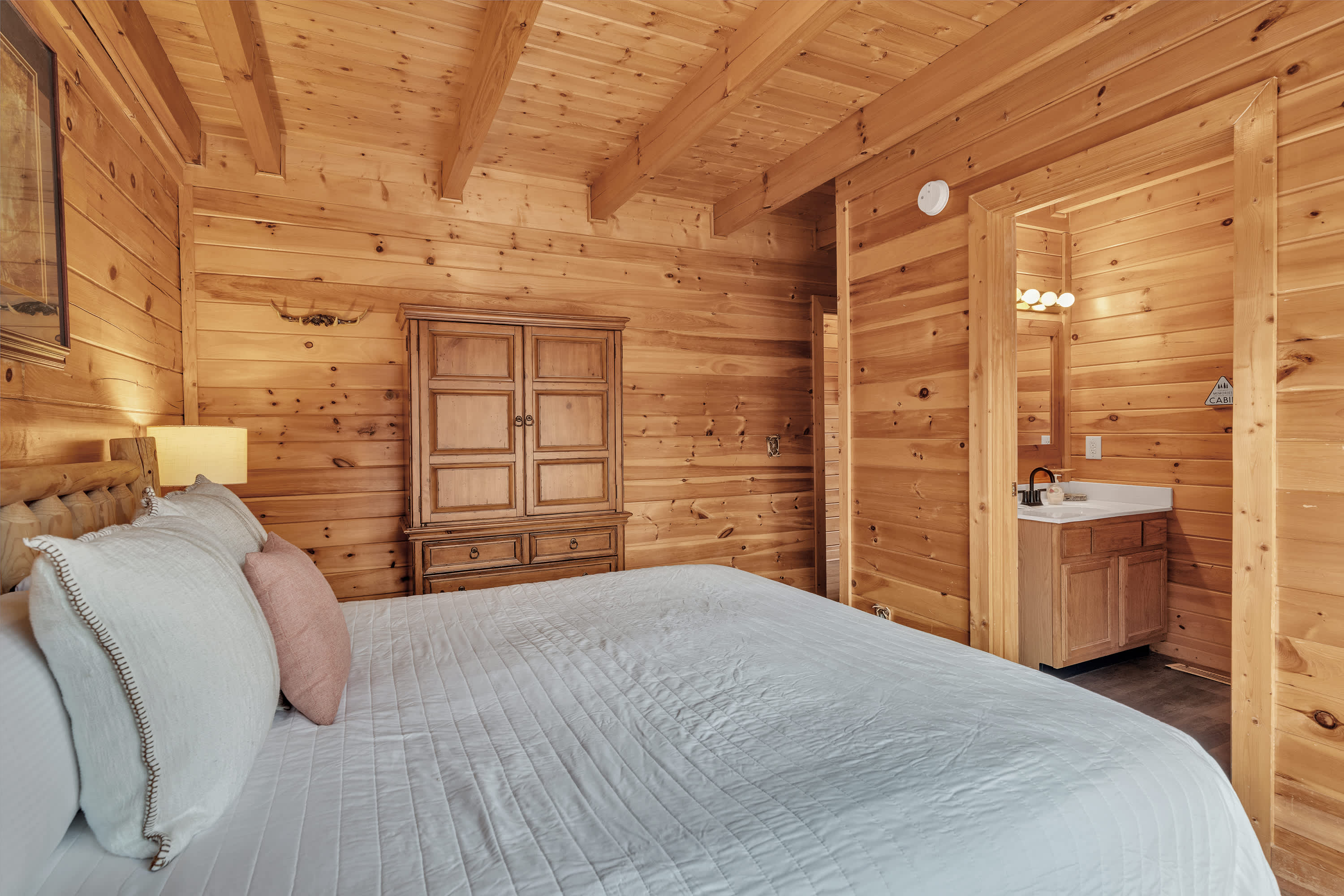 The home’s charming interior offers quintessential log cabin vibes, with warm wood accents organically blending one room to the next. The contemporary furnishings and elegant décor are a welcome contrast to the rustic elements, offering spaces designed for connection and relaxation. Curl up on plush living room sofa seating as you settle in for a family movie night – just don’t forget the popcorn! Steps away, the well-equipped kitchen has everything you need to whip up convenient meals right at home, with ample counterspace and cabinetry for preparation and storage. Grab a high-top stool for 3 at the counter to nosh on a spread of afternoon appetizers or gather the group for formal meals at the all-wood dining room table with seating for 4. Pool sharks will find their happy place in the loft, where a full-sized table provide endless hours of competitive fun.