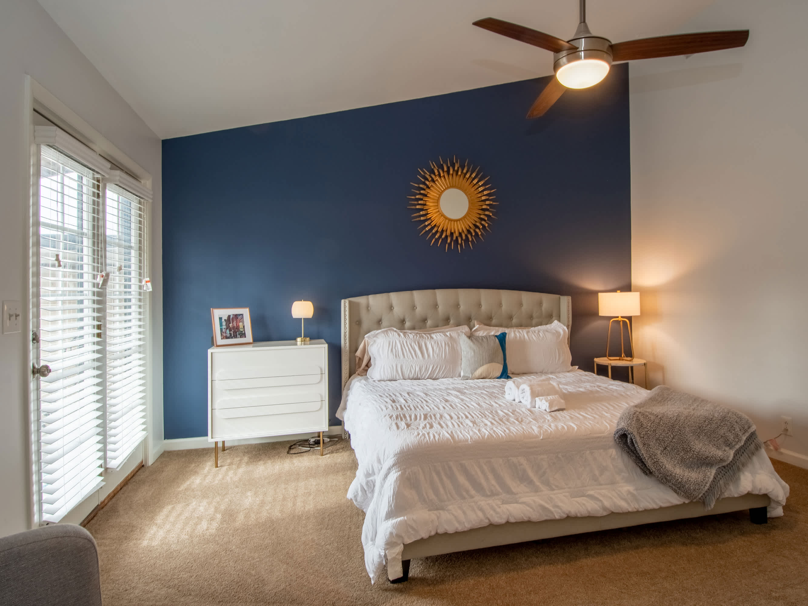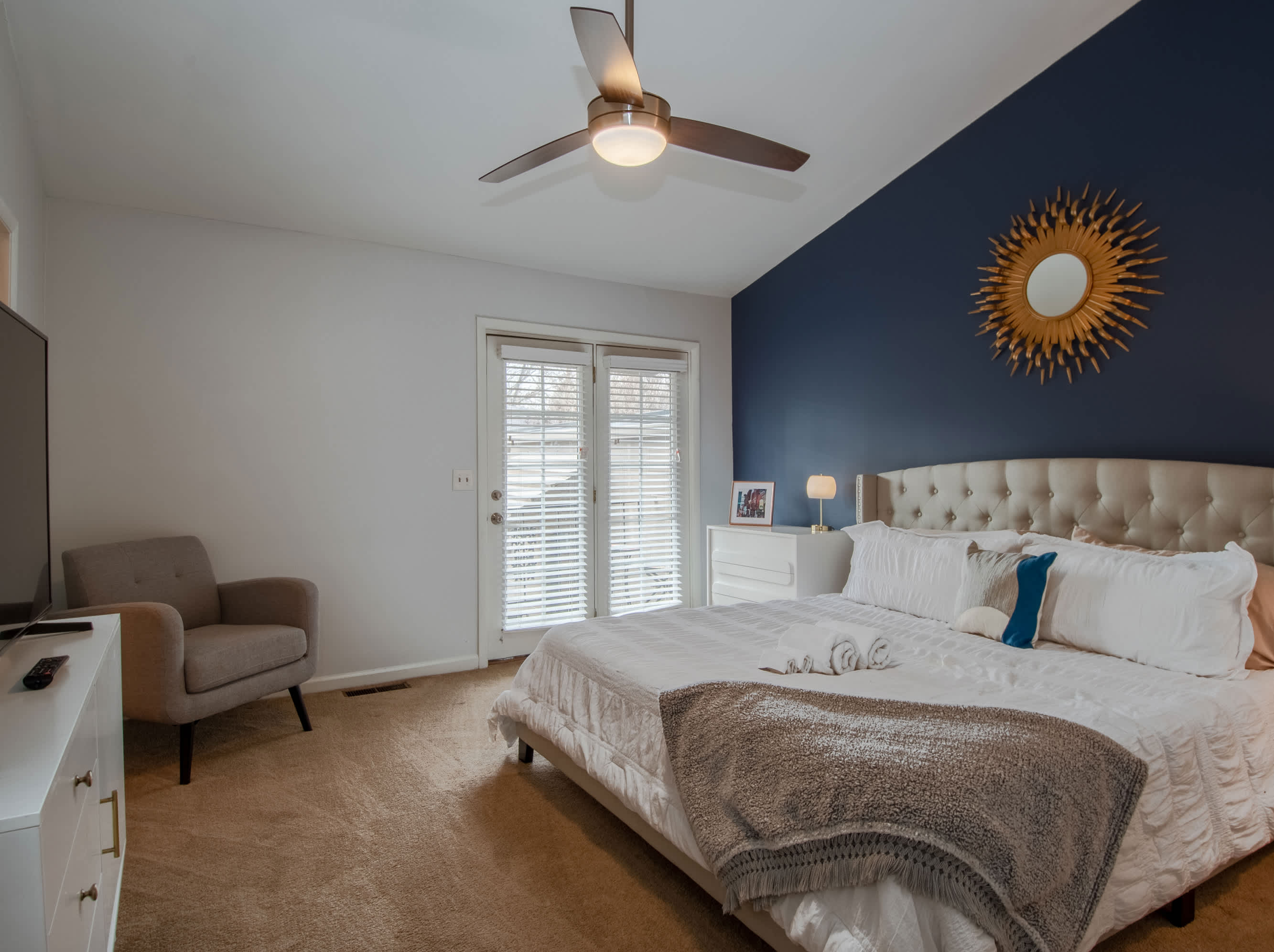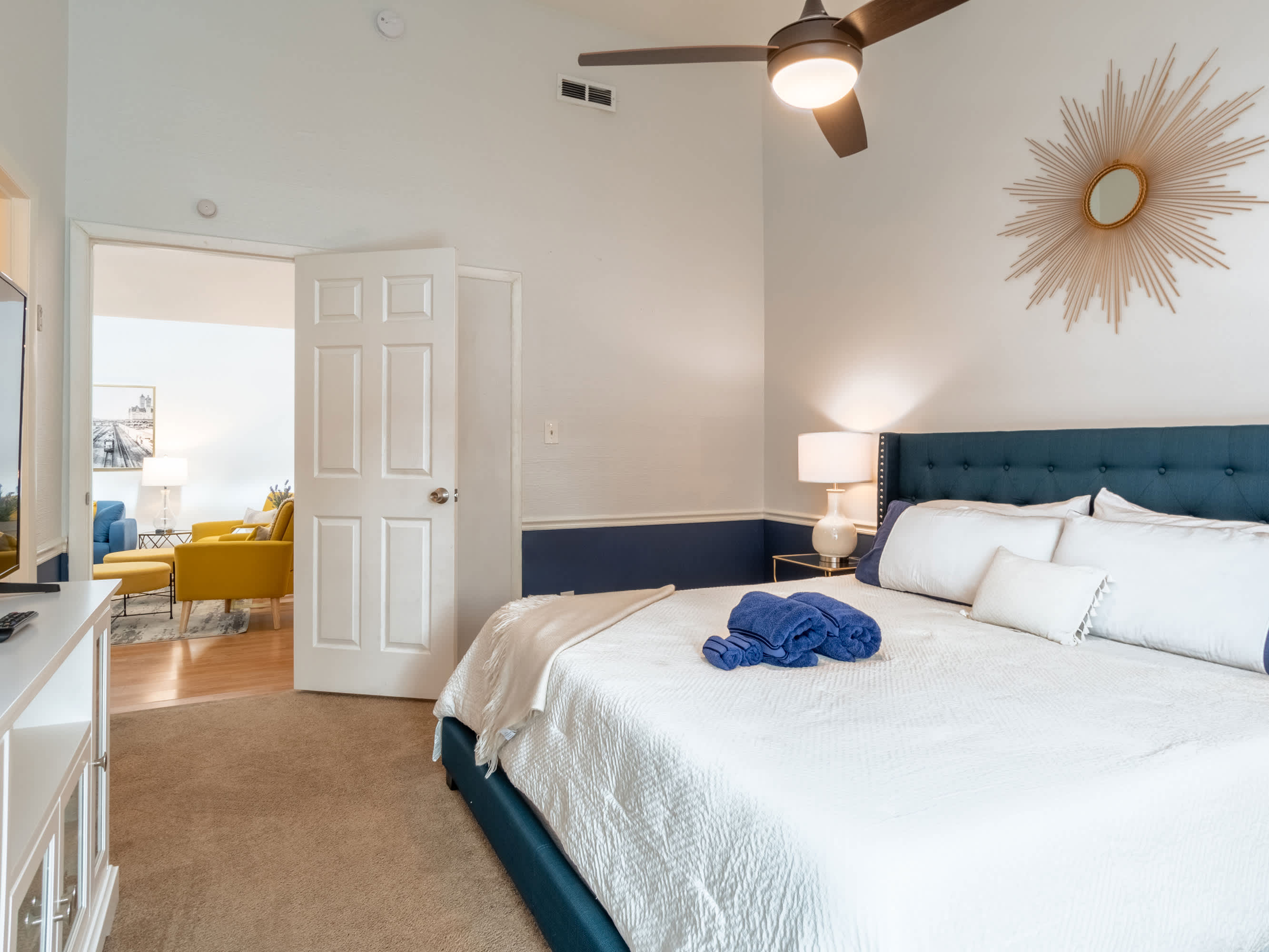 Both bedrooms are on the 1st floor and share a Jack n Jill style bathroom. Each bedroom features colorful blue walls and stylish gold tones. The main bedroom holds a King bed and Smart TV and the 2nd bedroom has a King bed. Both bedrooms have their own balcony.