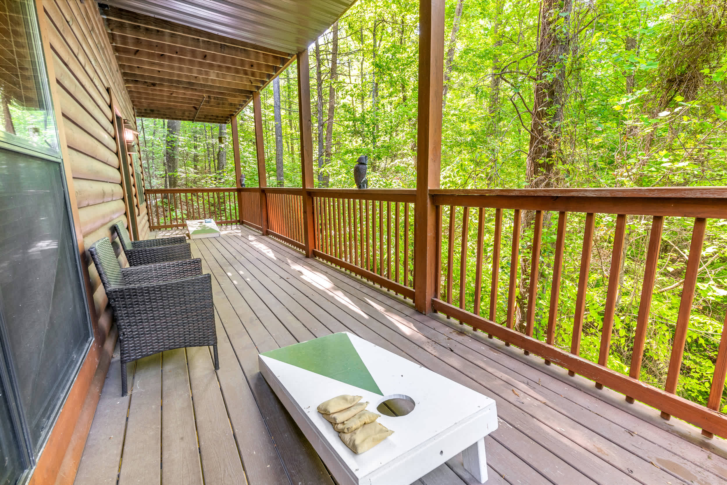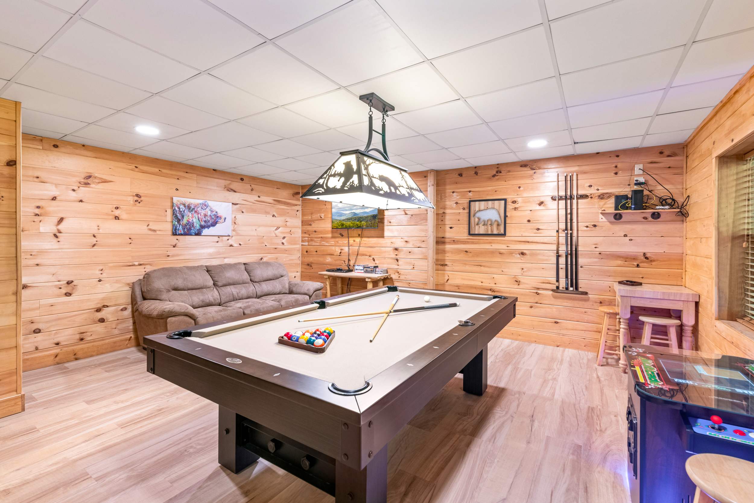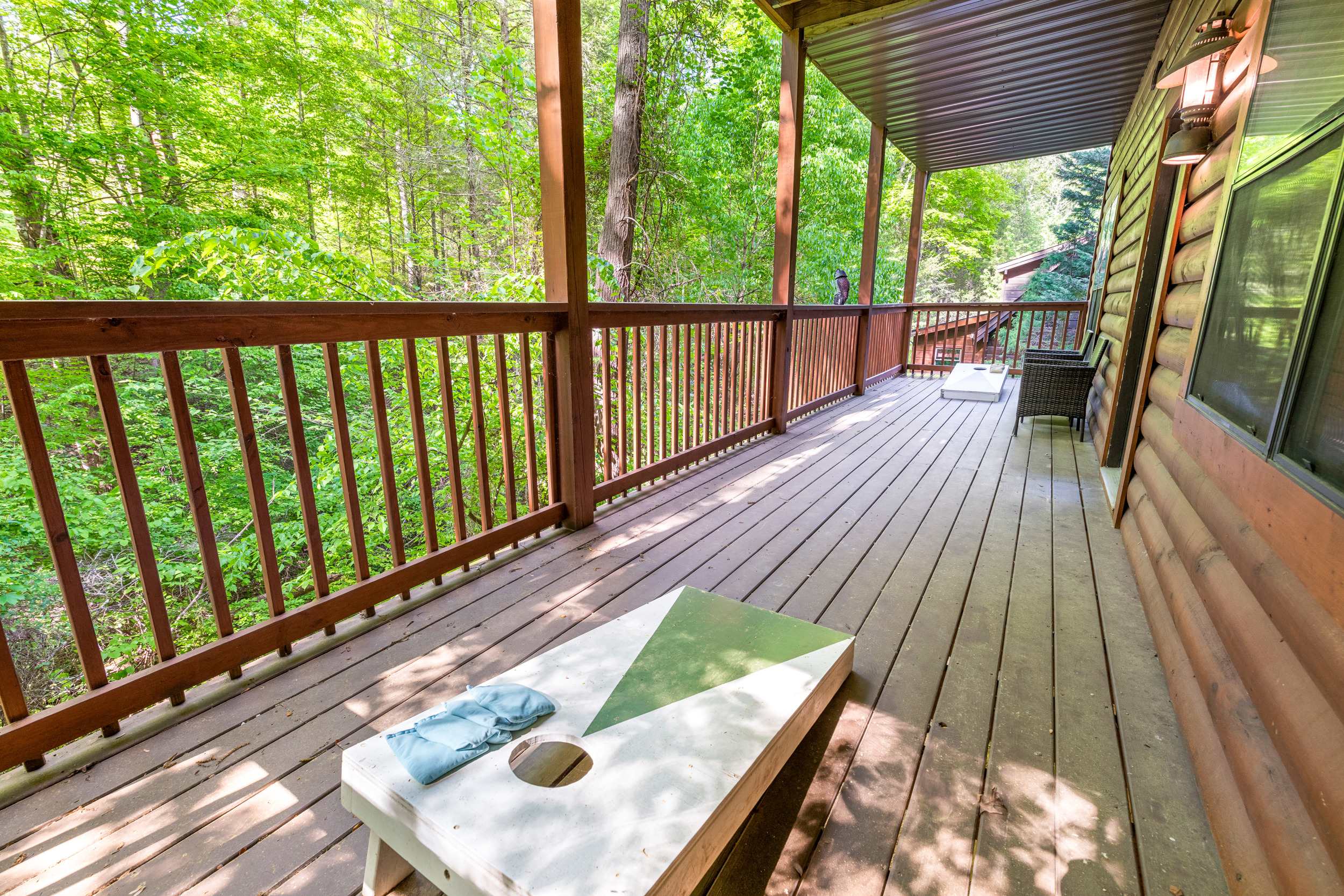 Enjoy the serene, wooded views from the comfort of multiple outdoor decks. The upper deck is a screened-in, outdoor living space complete with gas grill, picnic table, rocking chairs and private hot tub. All the fixings for a perfect evening in the mountains! The lower deck has space to play outdoor games like the provided corn hole set and plenty of seating with a swing and more rocking chairs! As you head inside, you’ll also find a fully stocked game room with pool table, newly updated wet bar, tabletop arcade games, and a full selection of board games. The possibilities for fun and recreation are endless! Soak in the peace and tranquility of life in the mountains and get ready for a vacation like no other.