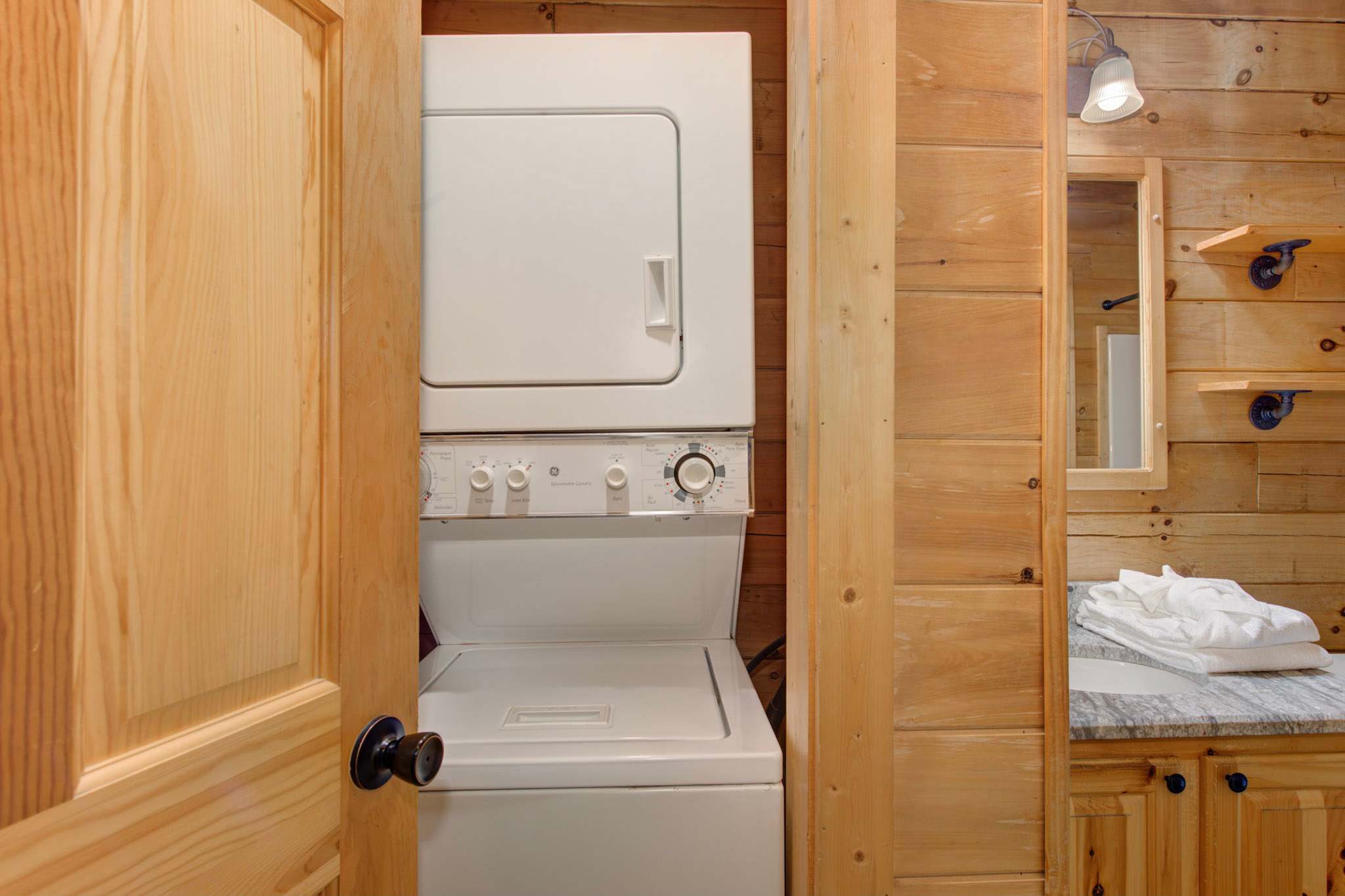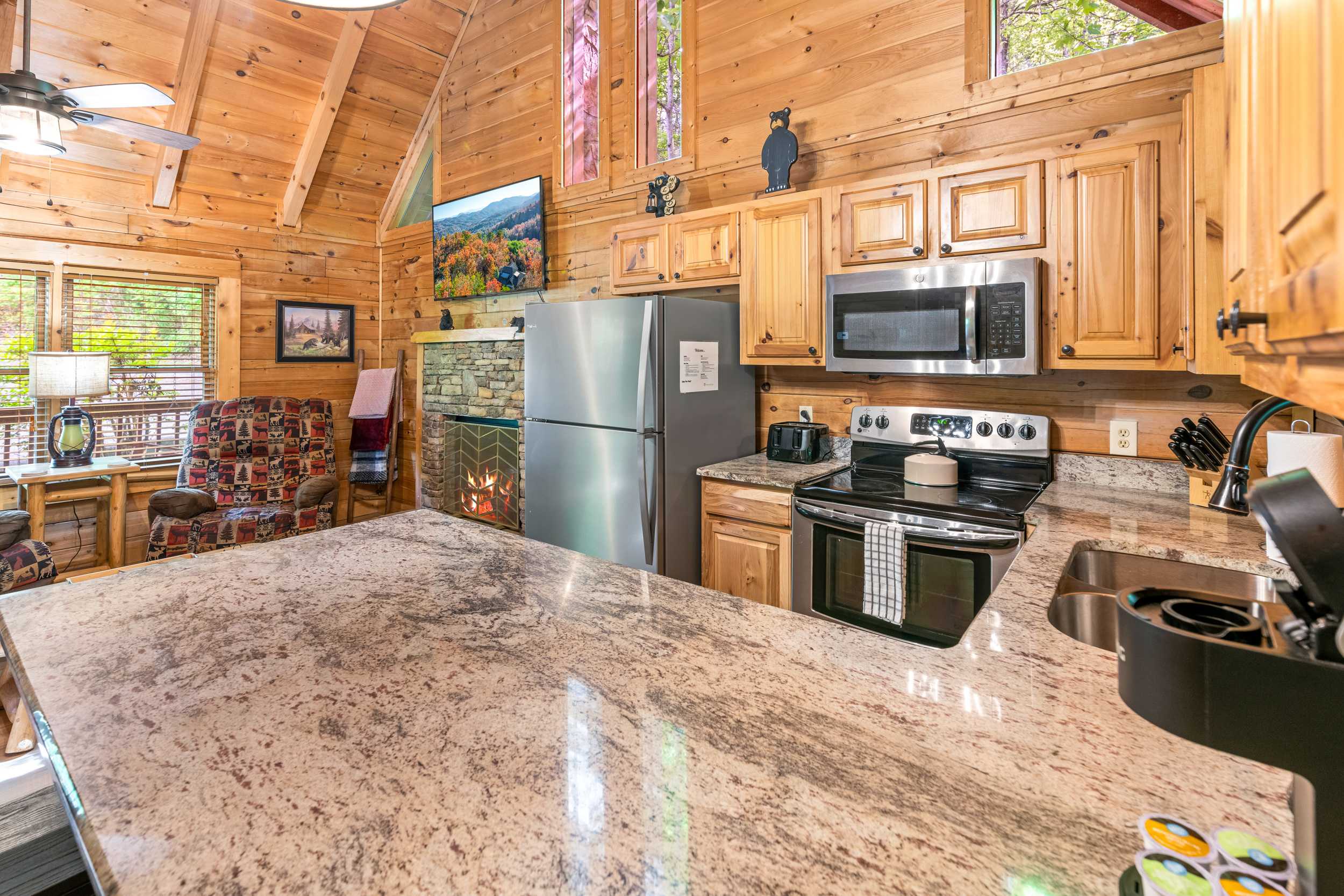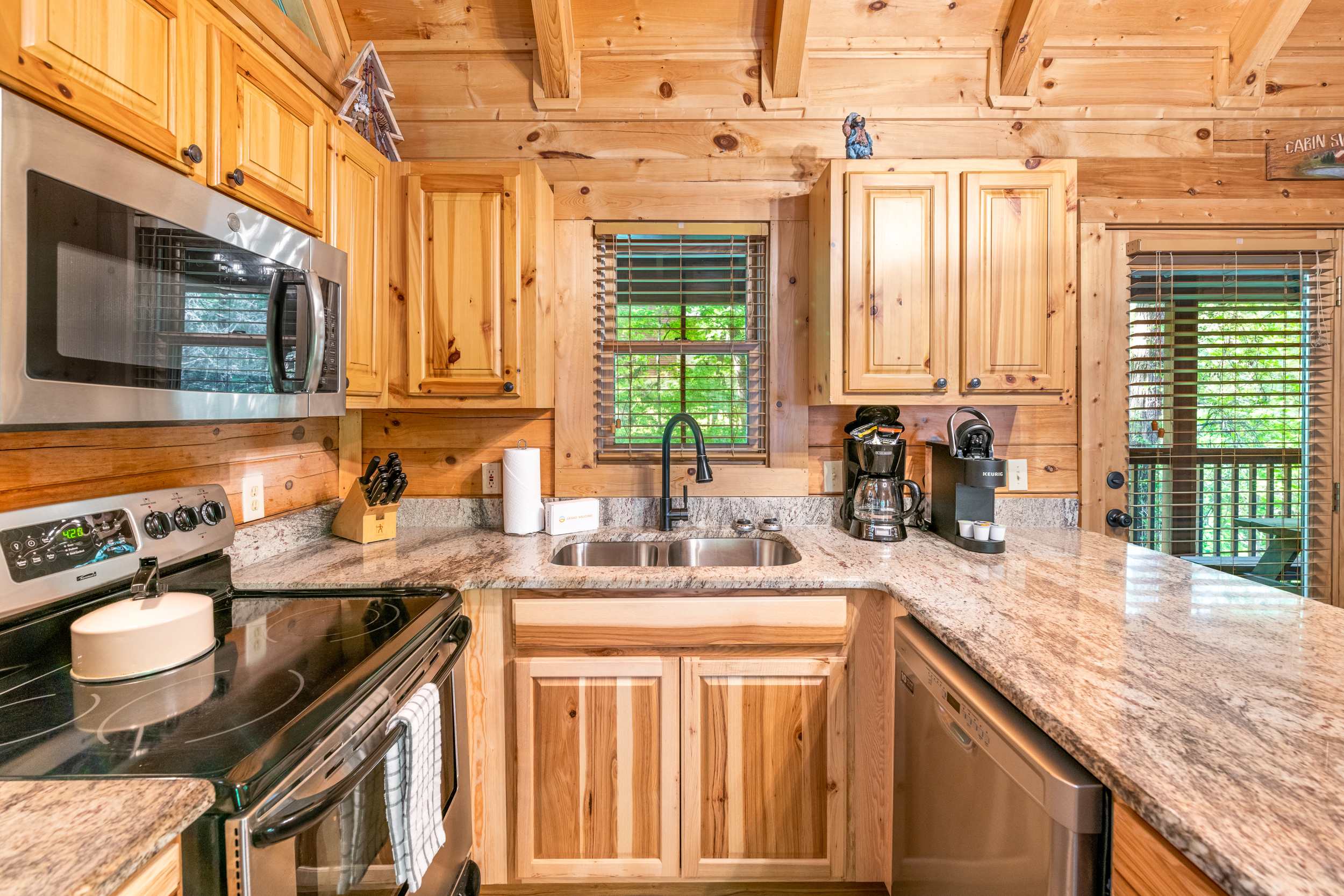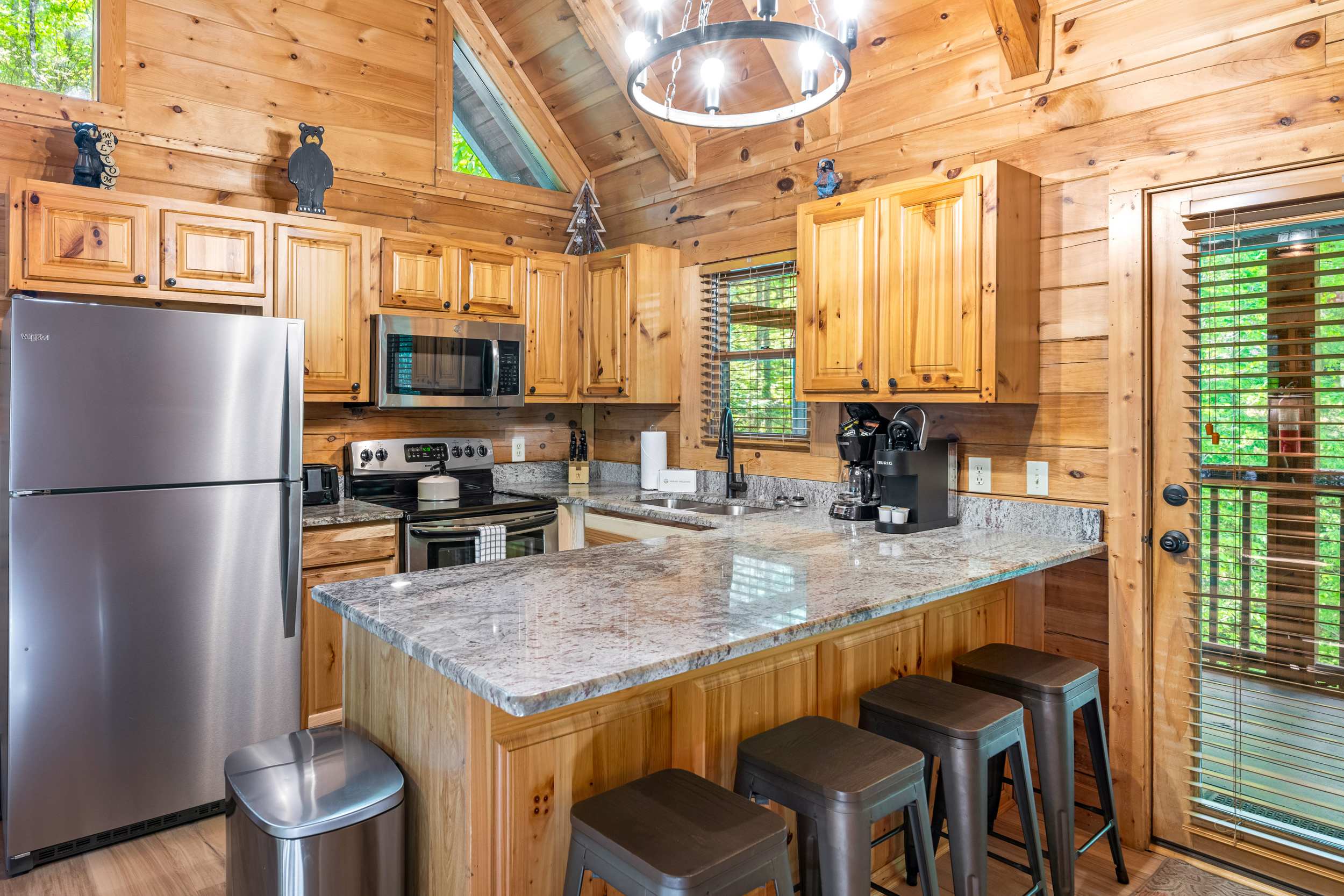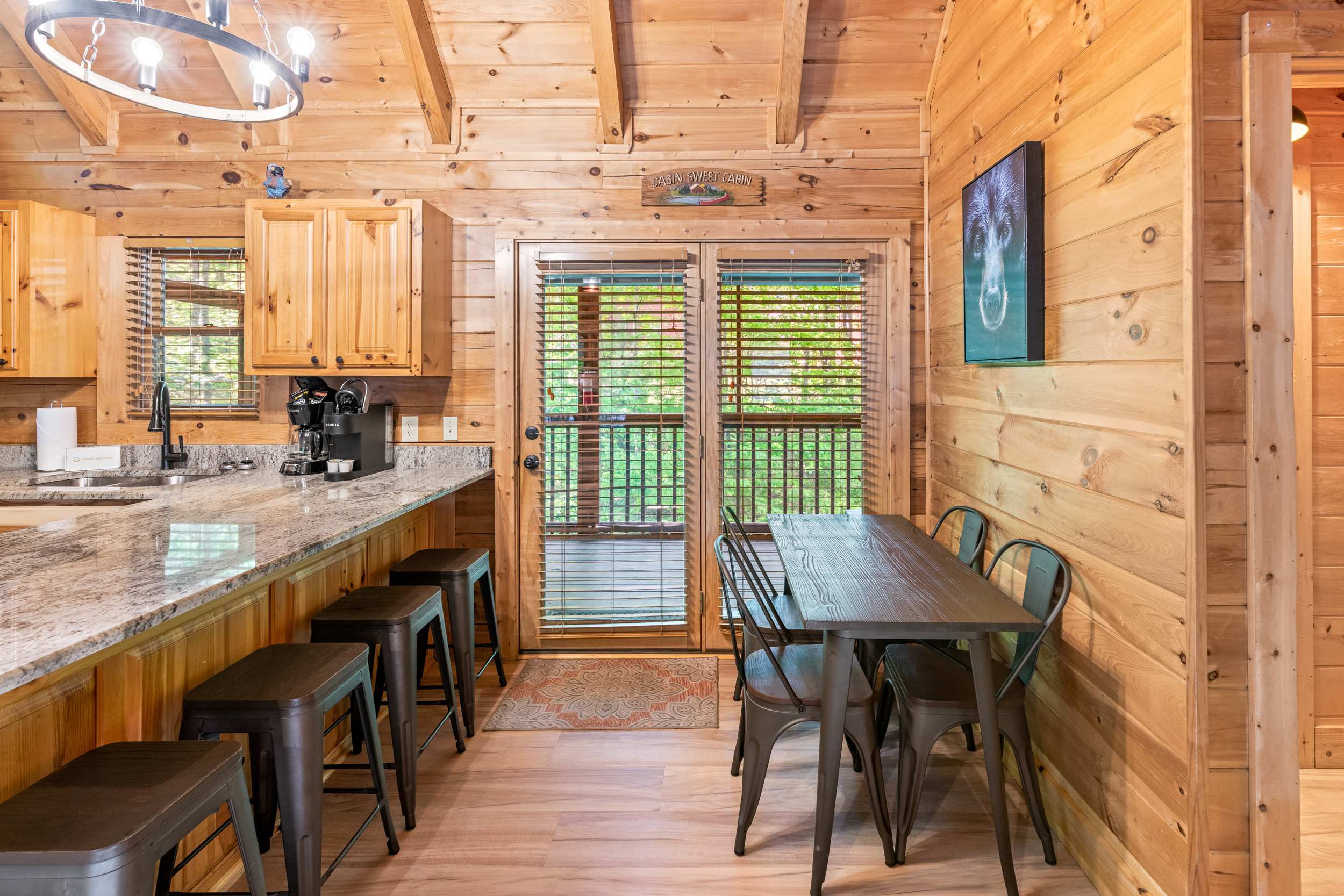 Inside, the gas fireplace creates a cozy ambience while the traditional log cabin design offers timeless beauty. The plush couches and smart tv offer a laid-back living space under the grand vaulted ceilings. The open floor plan flows right into the fully equipped and updated kitchen with its stainless-steel appliances, coffee maker, toaster, cookware, and casual barstool seating. Gather around the formal dining table for memorable meals full of stories and laughter. With all these amenities, this cabin is truly an extraordinary holiday destination!