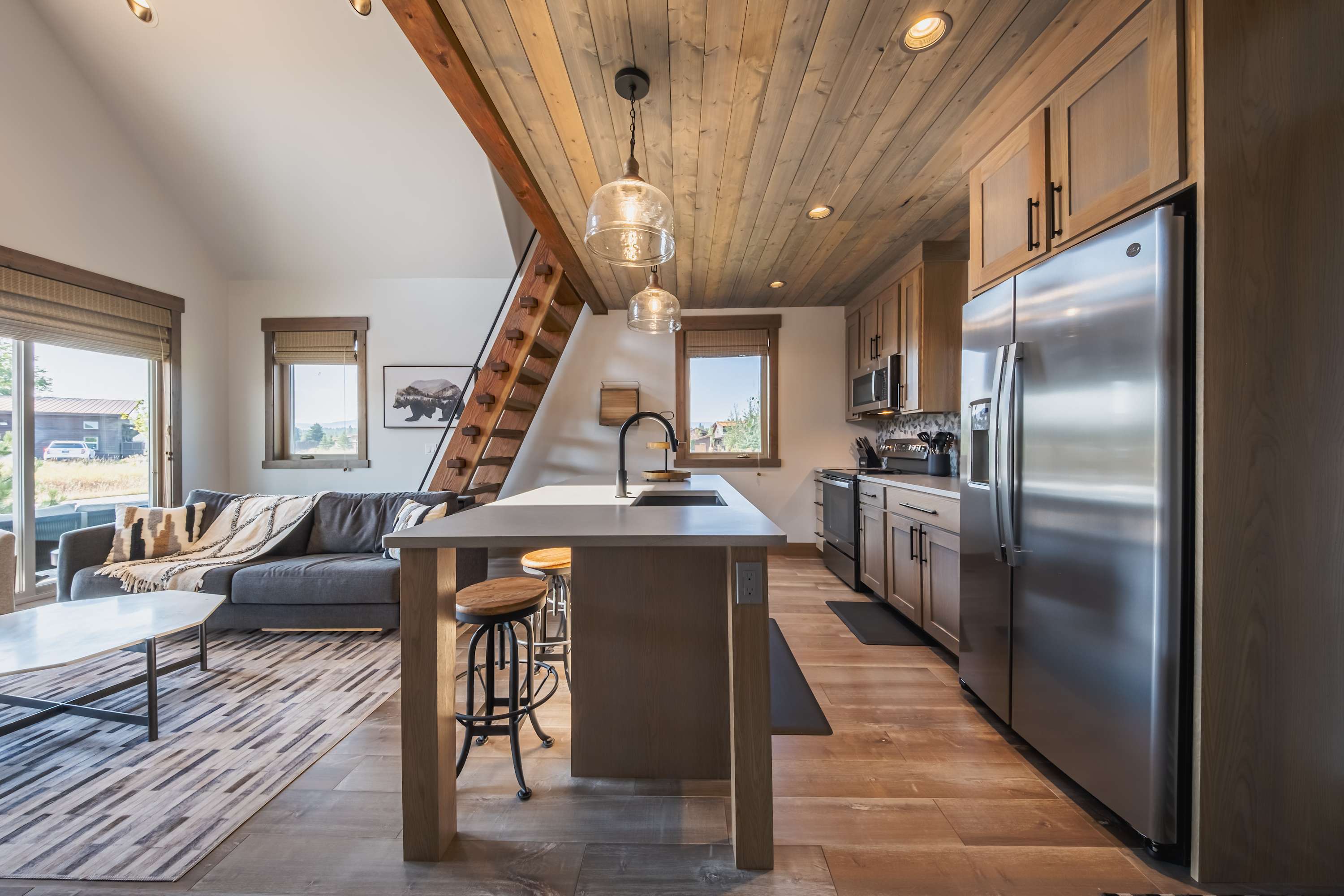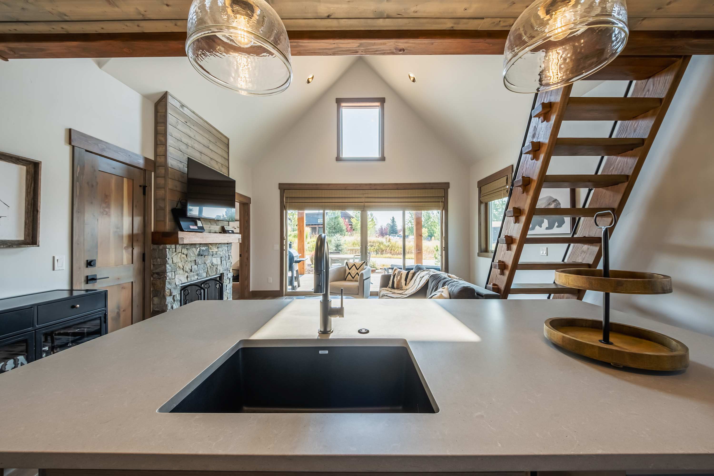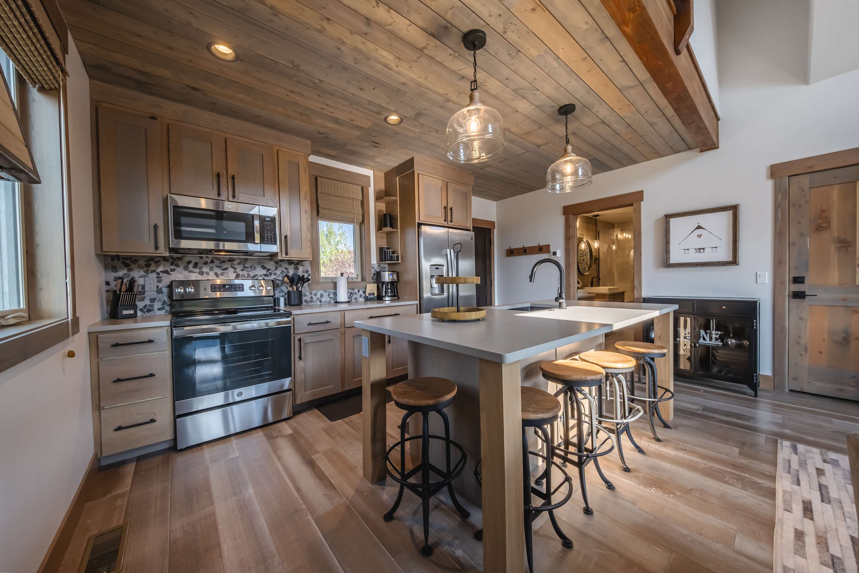 The home’s immaculate interior showcases soaring vaulted ceilings and plentiful natural light, creating an environment ripe for connectivity and relaxation. Sink into the plush sofa or armchair in the living room while you stream episodes of all your favorite shows on the mounted smart TV, the wood-burning fireplace keeping you toasty during the cooler months. Steps away, the stylish kitchen showcases stainless steel appliances, glossy stone countertops, and warm wood cabinetry stocked with cookware and dining ware for all your culinary endeavors. When you’re not dining outdoors in the fresh mountain air, grab a high-top stool at the island, suitable for enjoying meals both casual and formal.