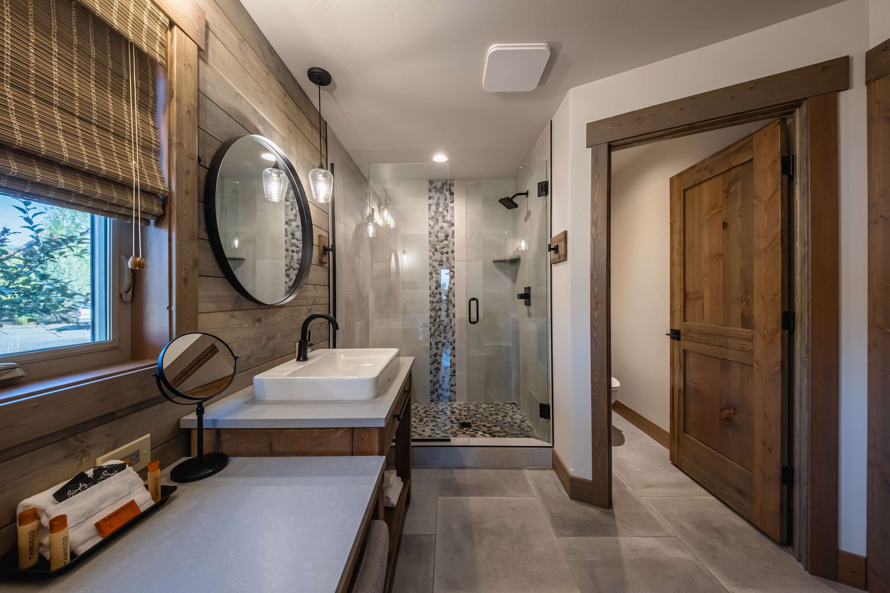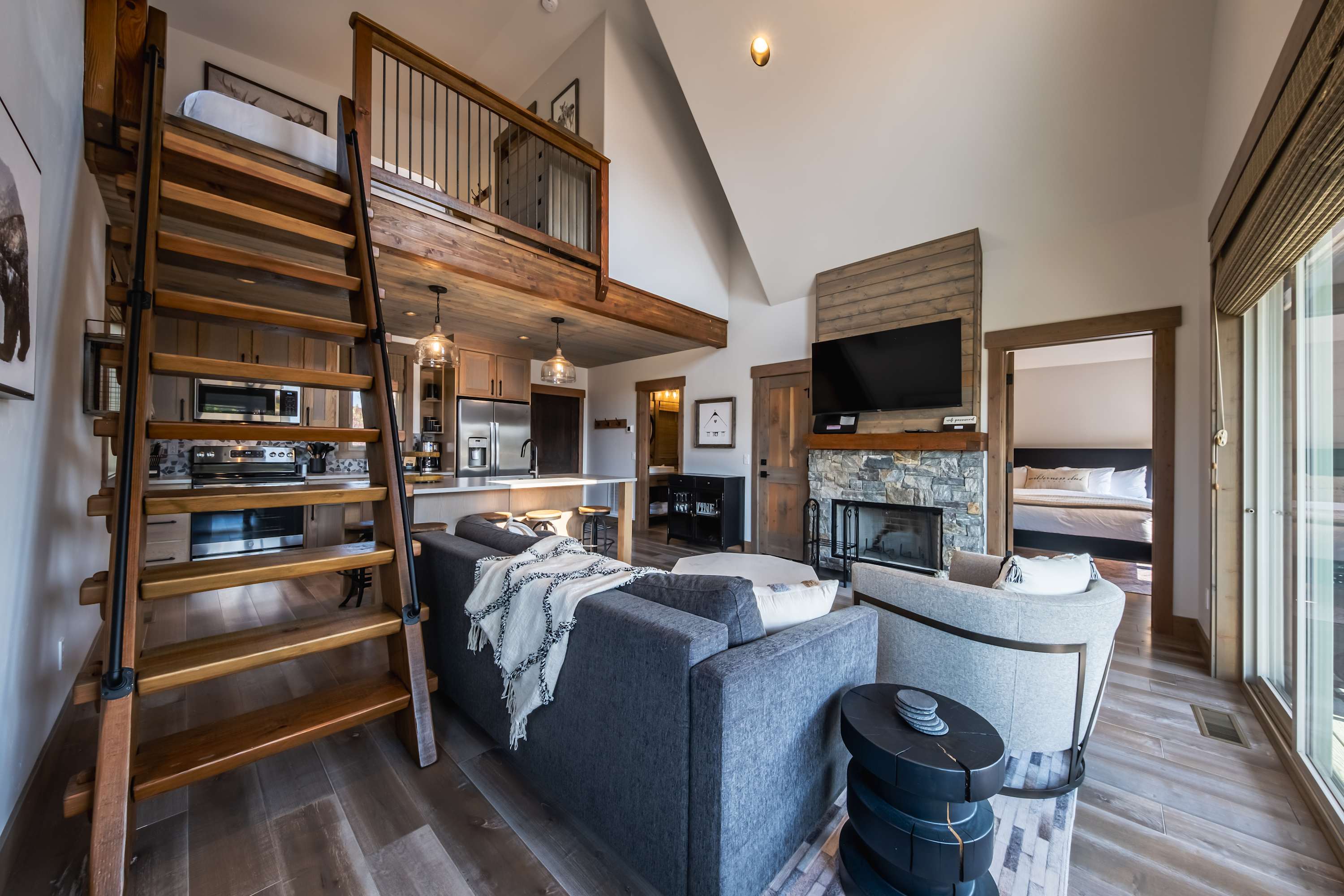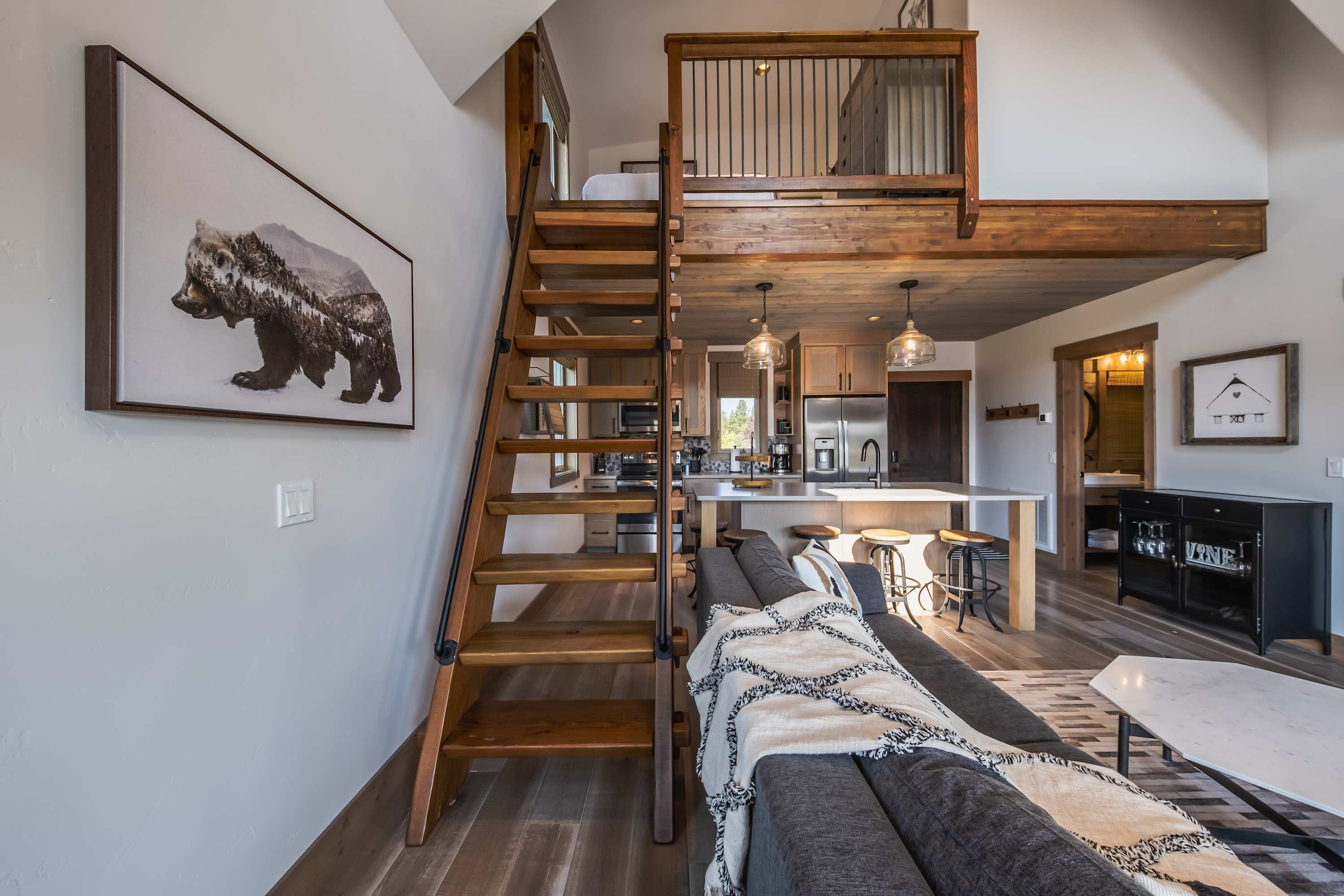 The home’s immaculate interior showcases soaring vaulted ceilings and plentiful natural light, creating an environment ripe for connectivity and relaxation. Sink into the plush sofa or armchair in the living room while you stream episodes of all your favorite shows on the mounted smart TV, the wood-burning fireplace keeping you toasty during the cooler months. Steps away, the stylish kitchen showcases stainless steel appliances, glossy stone countertops, and warm wood cabinetry stocked with cookware and dining ware for all your culinary endeavors. When you’re not dining outdoors in the fresh mountain air, grab a high-top stool at the island, suitable for enjoying meals both casual and formal.