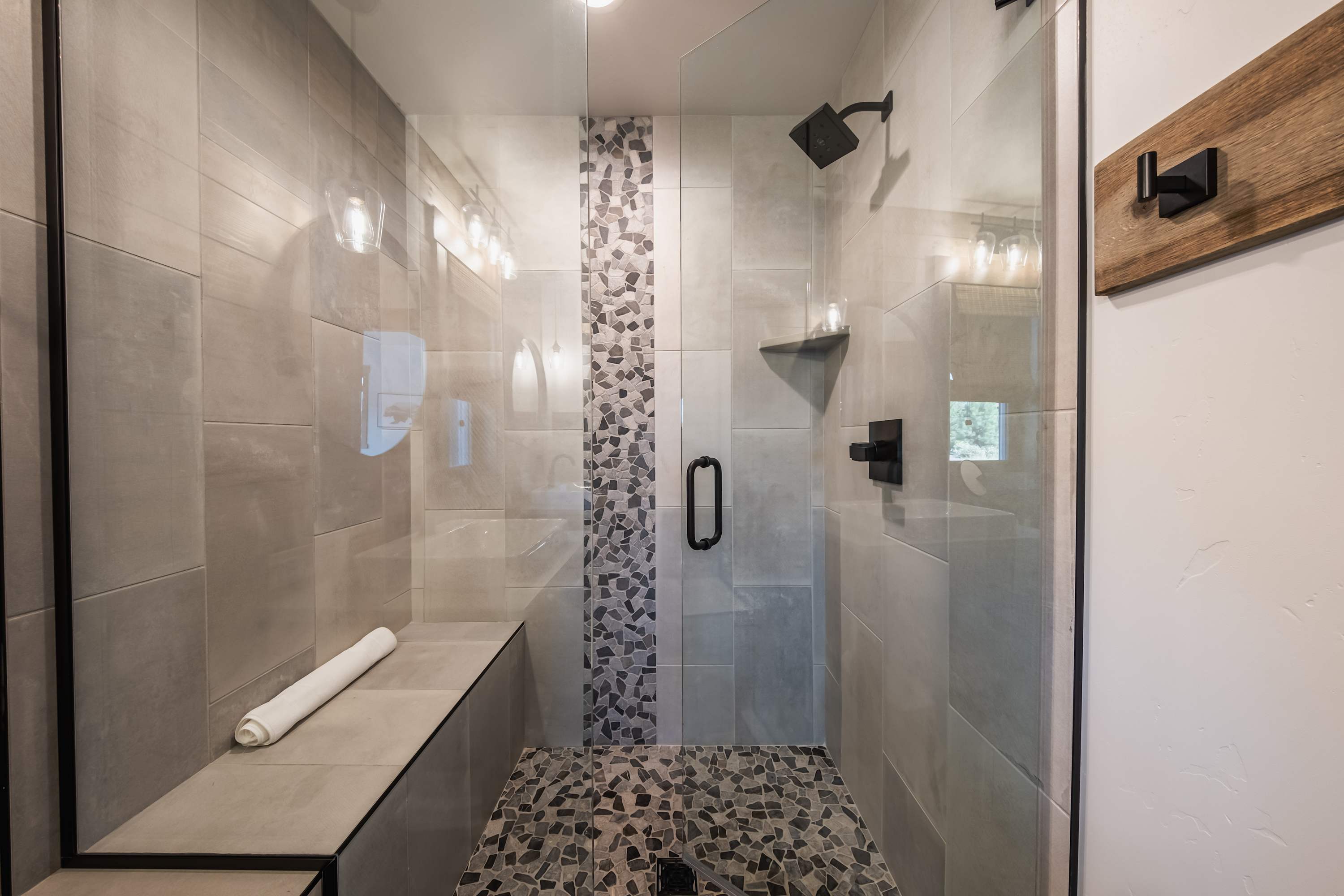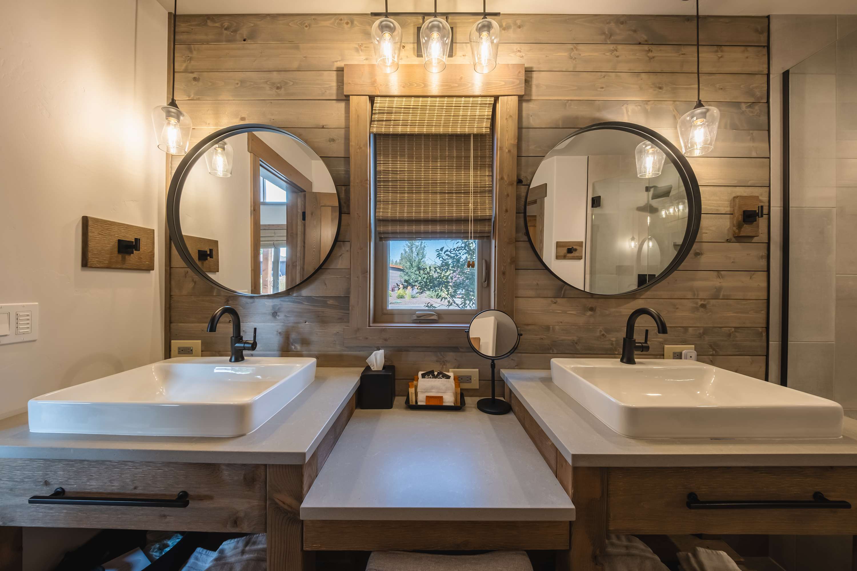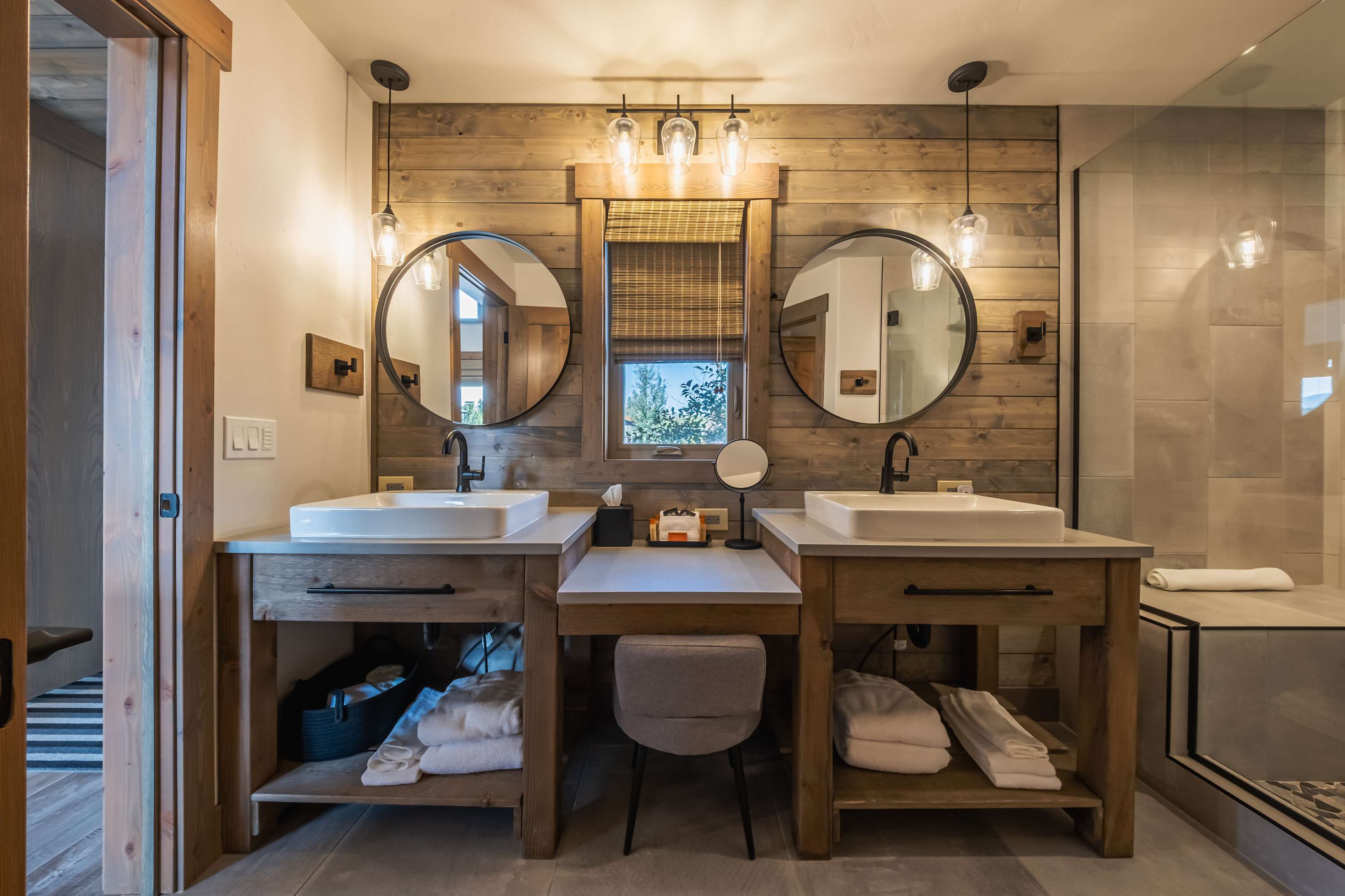 The loft includes a queen size bed and ensuite bathroom with a single vanity and glass walk-in shower.