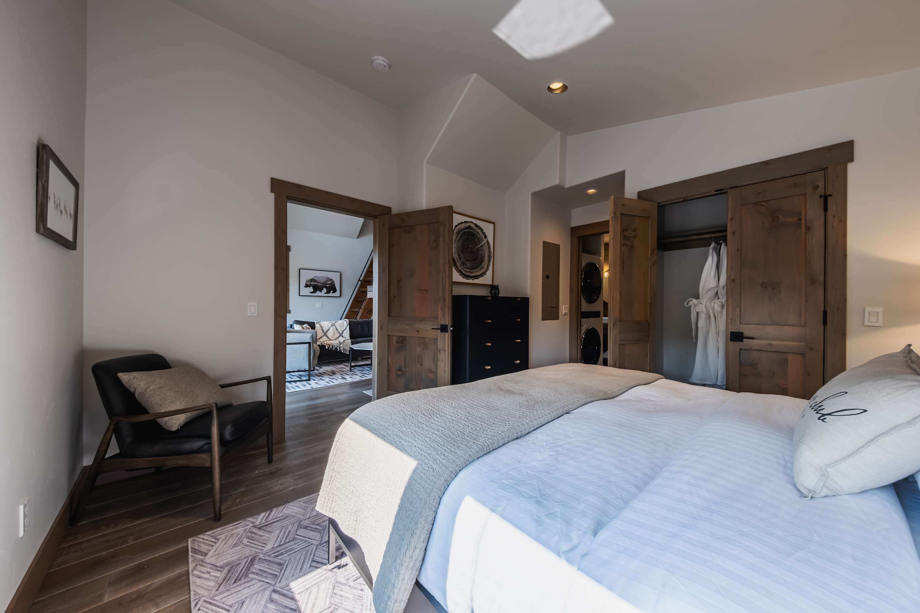 The bedroom includes a king size bed and spa-like ensuite bathroom with a dual vanity and glass walk-in shower.