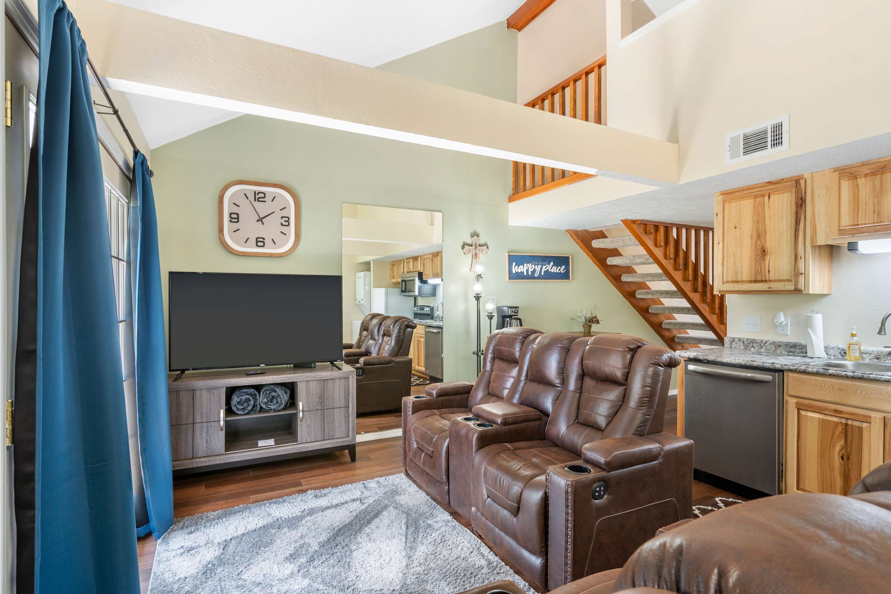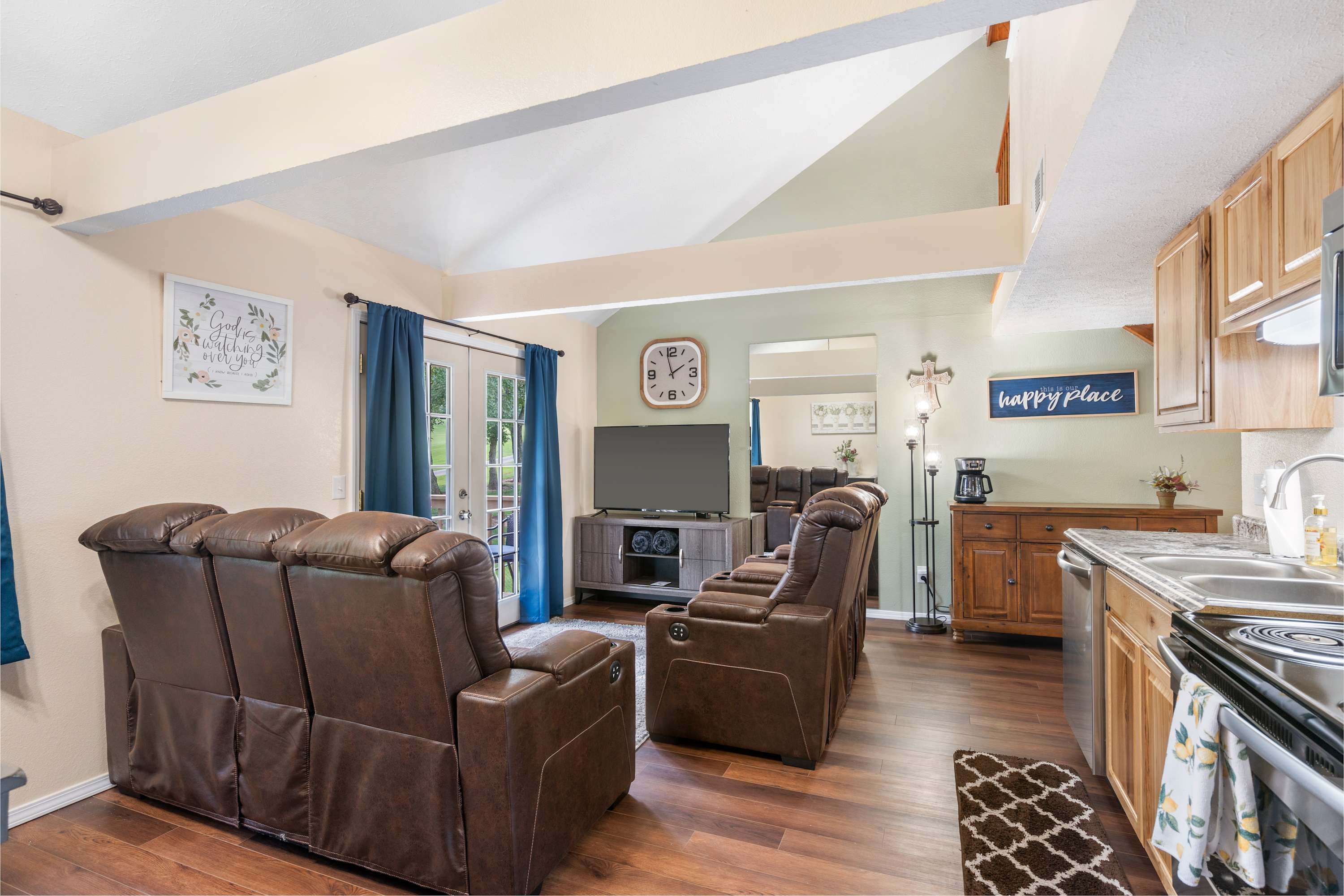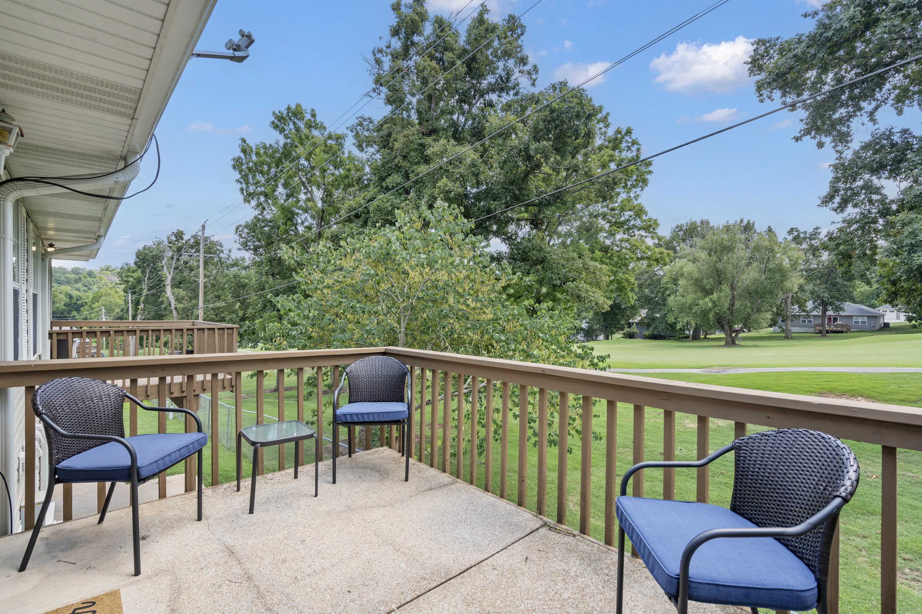 Inside the home, soaring vaulted ceilings sit atop brightly lit spaces conducive to both relaxation and entertainment, perfect for connecting with loved ones during your well-earned downtime. Sink into plush leather sofa seating with recliners in the living room to stream that new movie you’ve been saving on the smart TV. Steps away, prepare delicious homecooked meals or unpack takeout from a newly discovered local restaurant in the well-equipped kitchen offering full-sized appliances and cabinetry stocked with cookware and dining ware. The dining table can seat the whole crew for mealtimes, or you can take your fare al fresco out on the breezy balcony to soak in the fresh Ozark air and catch views of passing golfers.