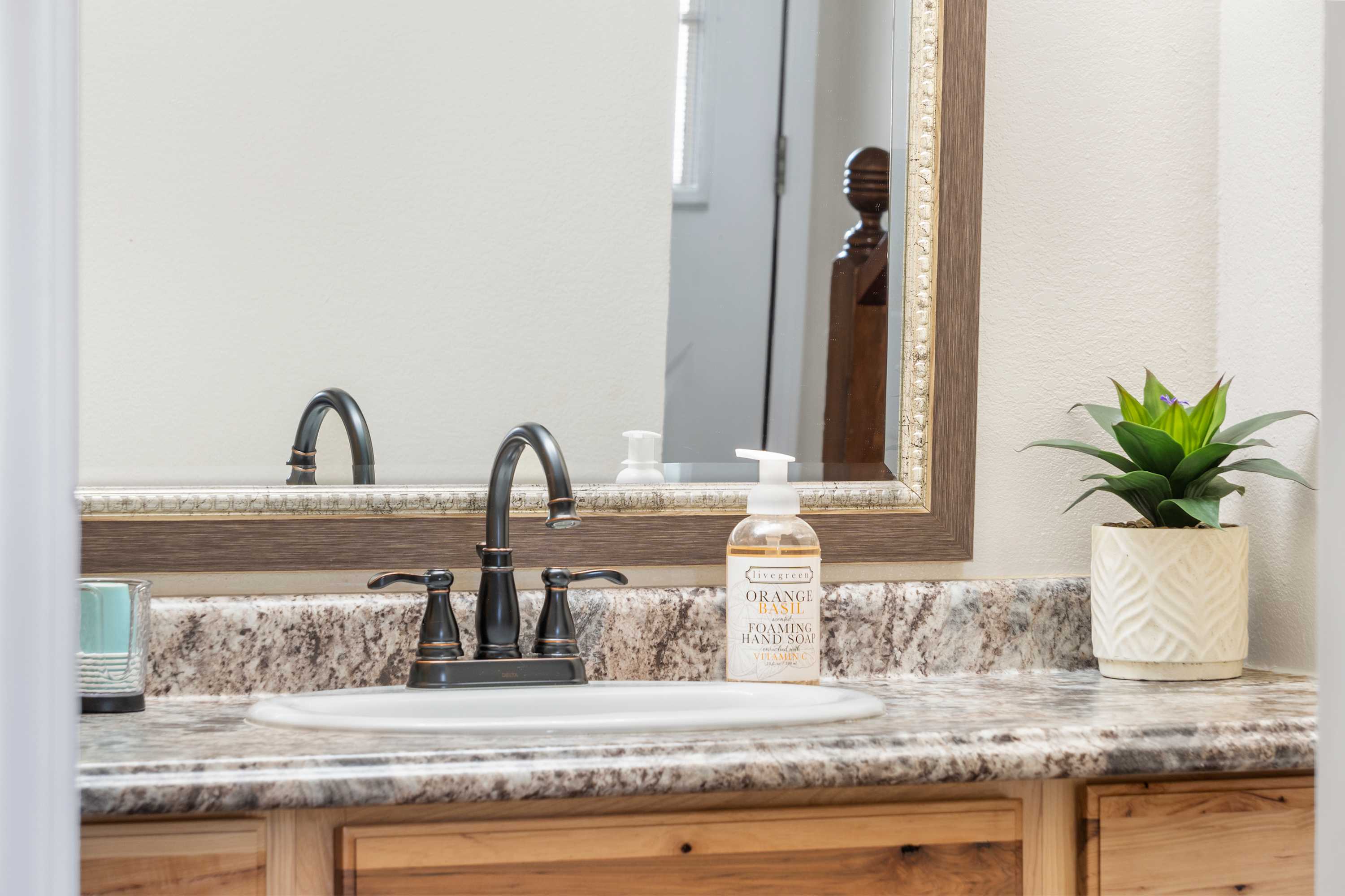 Bedroom #1 includes a queen size bed, smart TV, and ensuite bathroom with an oversized single vanity and shower/tub combo.